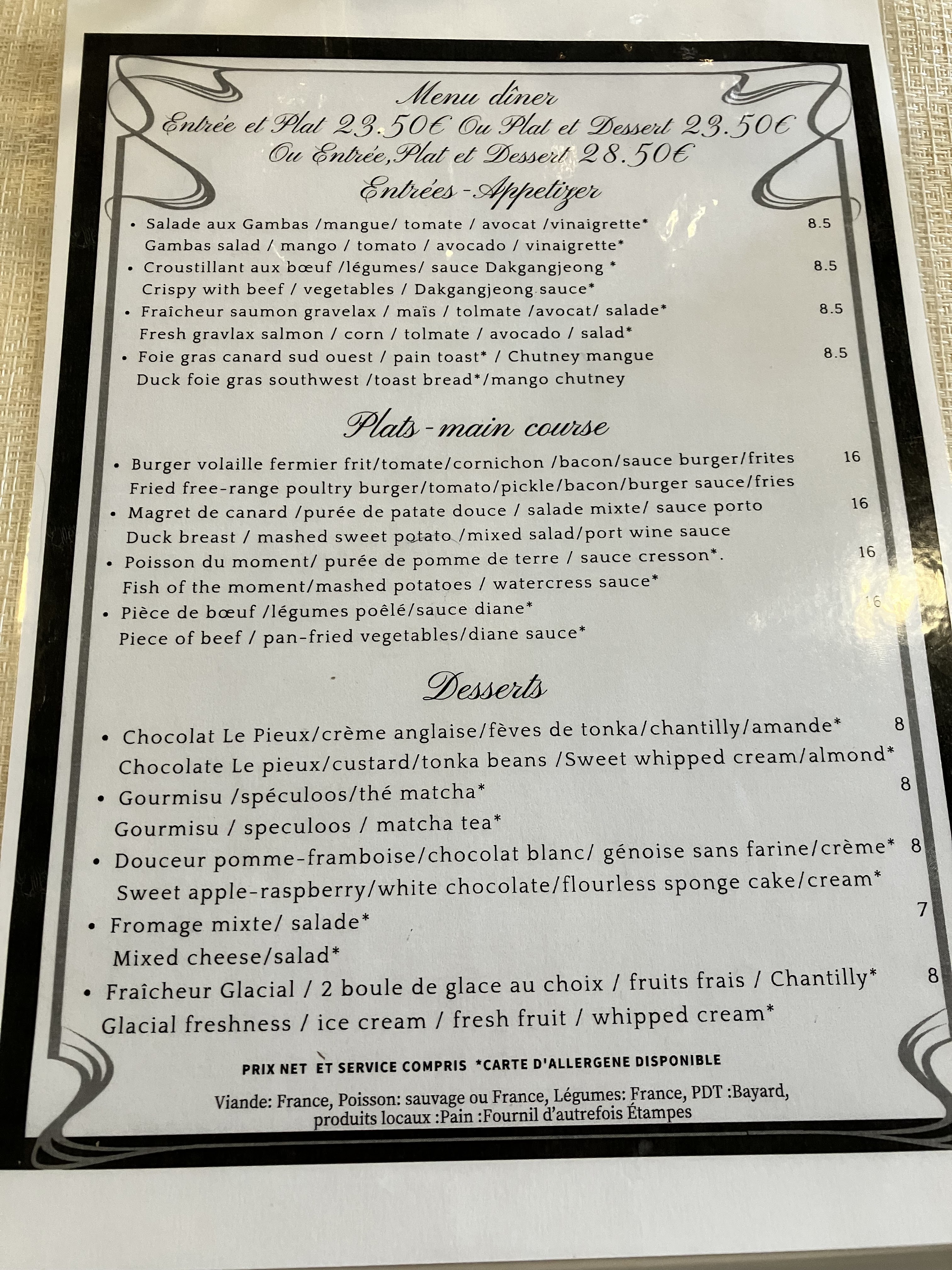 Repas de la Saint Valentin à 35 euros. C'était très bon, les plats ont du goût, la présentation est belle et le service attentionné. Cela fait plusieurs fois que nous y venons. Nous ne sommes pas déçus.