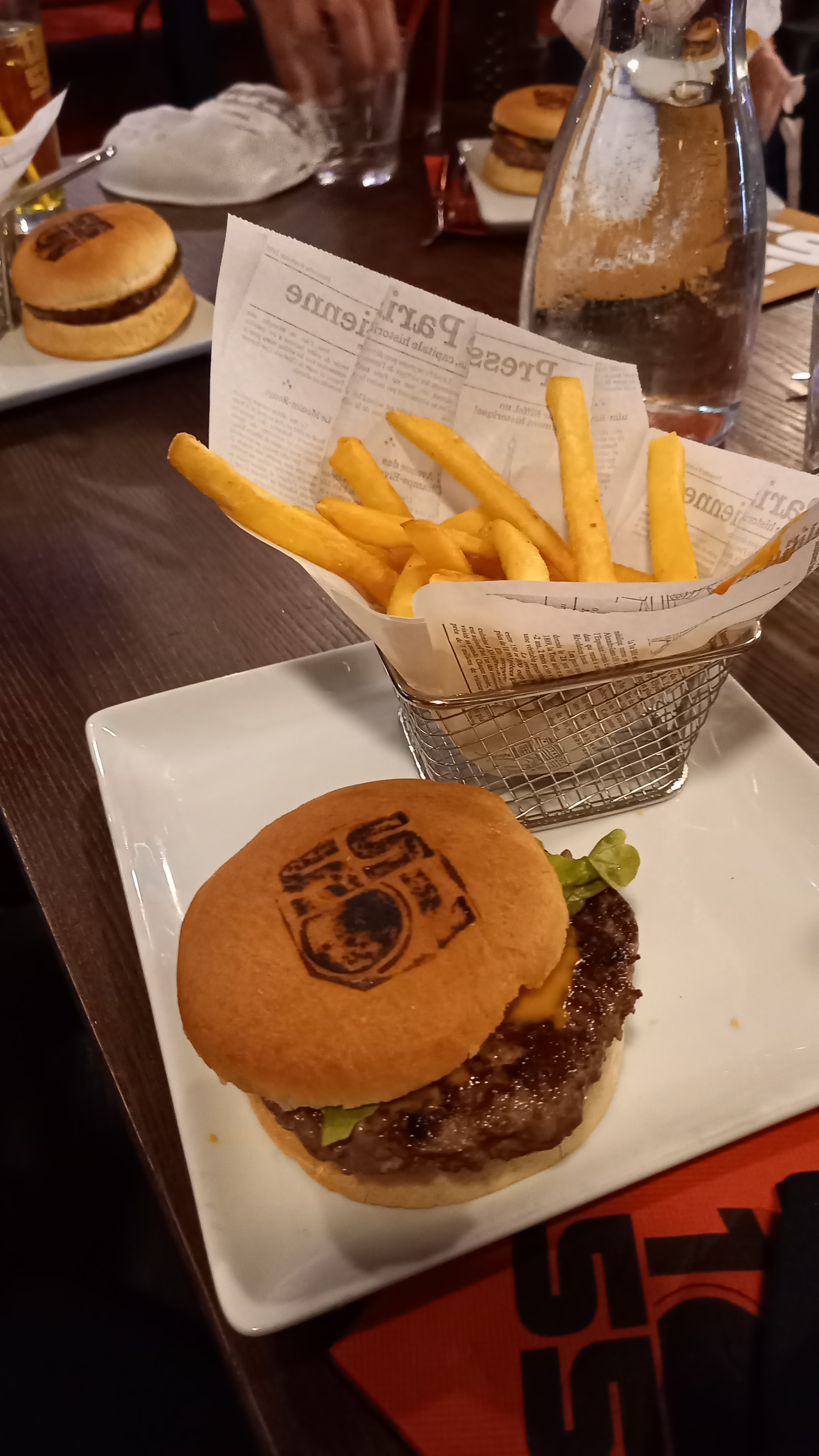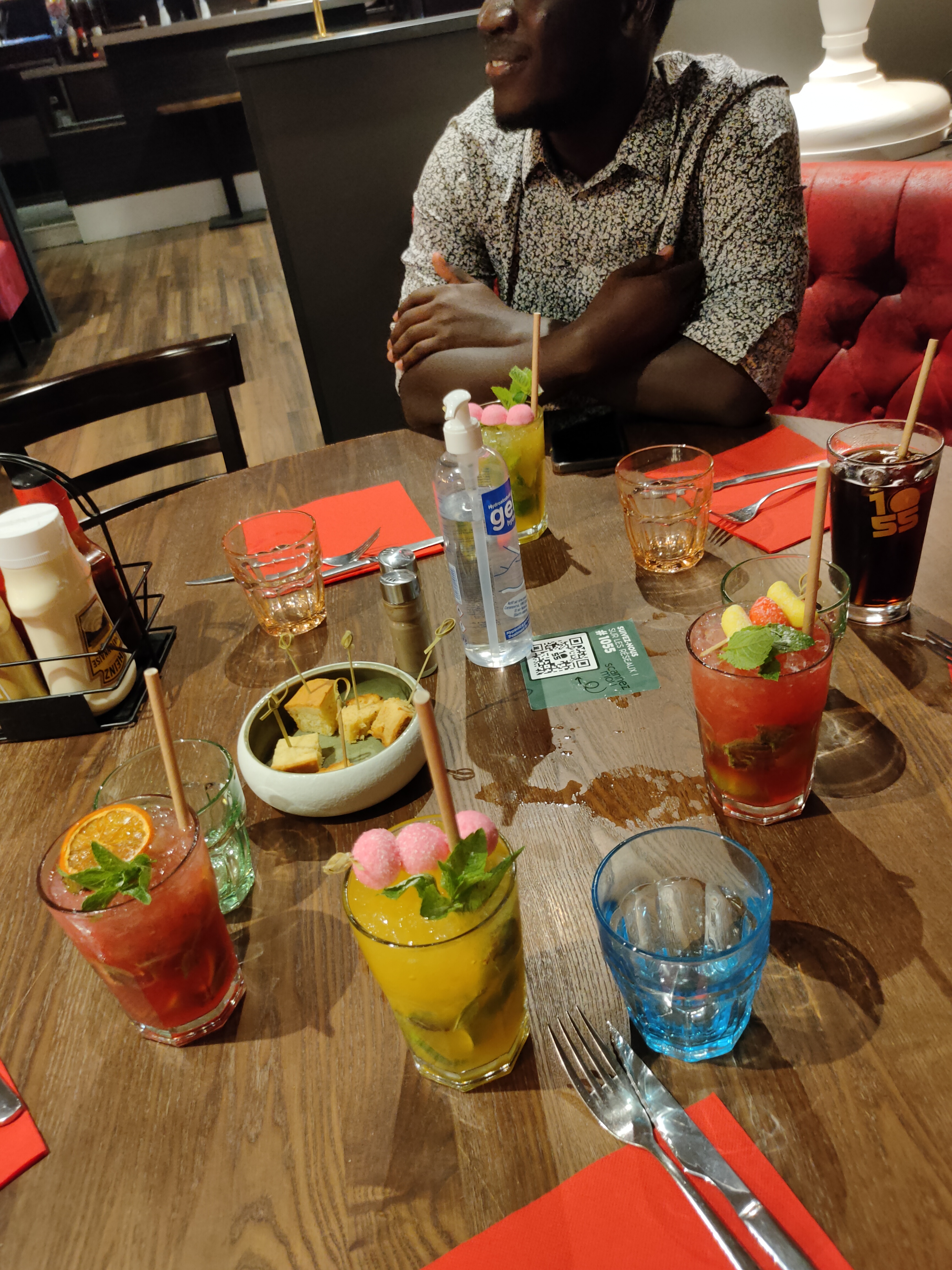 On va dire compliqué pour être gentil... Du personnel deborde. On Commande 2 pepsi il arrive chaud le serveur retourne vers le barman qui lui répond ils sont frais ils étaient au frigo ... Après on commande une assiette arrive avec des frites au lieu de potatoes ils nous ramène des potatoes a la fin des burgers merci mais trop tard. On commande des desserts les parfums était pas les bons on a même pas redemander on était épuisé surtout que la journée au 1055 était dans la même acabit... Bref on pourrai passe des super journée et on s'énerve a cause d'une mauvaise gestion.... Du coup 2 étoiles