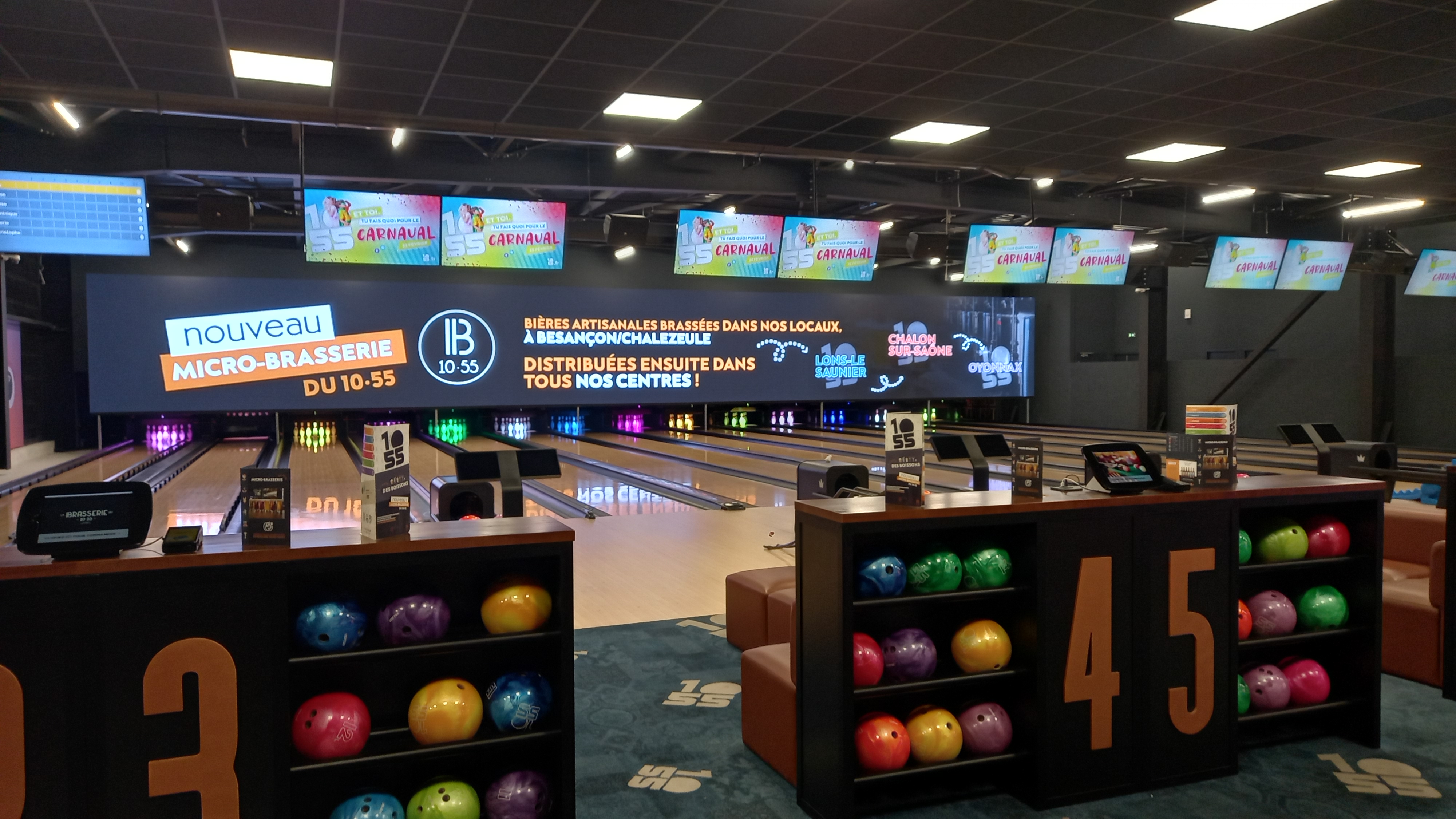 4e visite dans ce complexe de loisirs, très bon accueil, bonne entente avec le staff, des bonnes explications pour la 1ère fois. Faisant uniquement du bowling à la journée, tout se passe généralement bien, mais je relève un énorme défaut quand on essaye de s’appliquer dans ses lancers. L’écran géant du fond se reflète TRES fortement sur le marquage au sol, soit les 7 flèches et les 10 points, surtout lumières éteintes. Cela rend le jeu illisible et on attend patiemment que l’écran vire sur une couleur sombre avant de lancer sa boule. J’ai eu l’explication, je comprends les publicités, les obligations du 1055 à éclairer de cette façon et aussi que c’est un bowling de loisirs et non compétitifs. Le problème est là et en discutant avec certains joueurs voisins, on ressent la frustration de subir l’éblouissement et de jouer à l’aveugle. Il y a plusieurs possibilités pour améliorer le confort des joueurs : incliner l’écran, rendre phosphorescent les marques, lumière ciblée sur les marques.