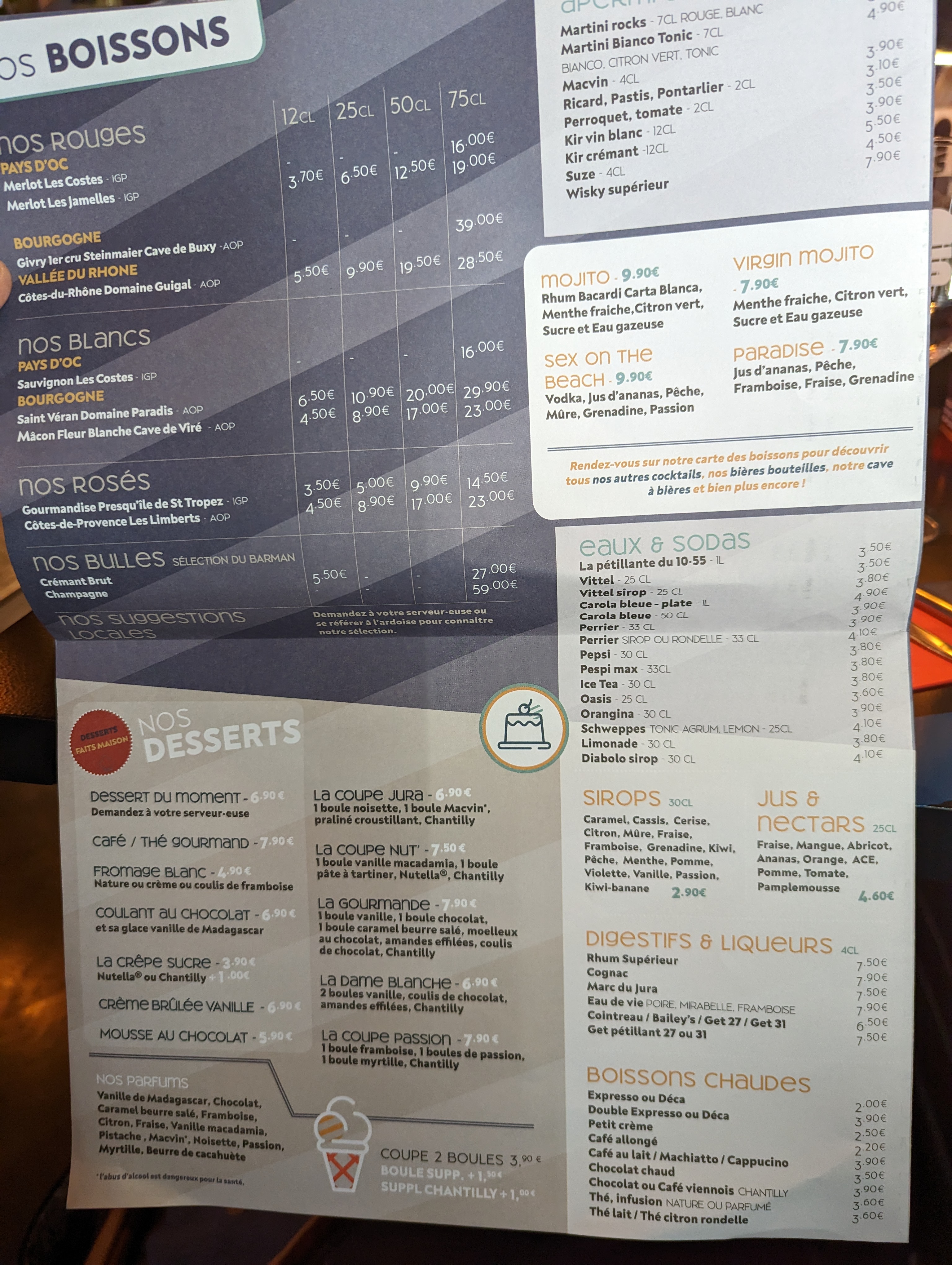 Ne sers pas de planches ou de dégustation, uniquement de l'alcool... Trop de monde, donc ne sers que les tables. Refuse également qu'on ramène a manger. Venir uniquement pour la boisson ou les jeux. Compliqué pour un apéro entre collègues, joyeux Noël a tous