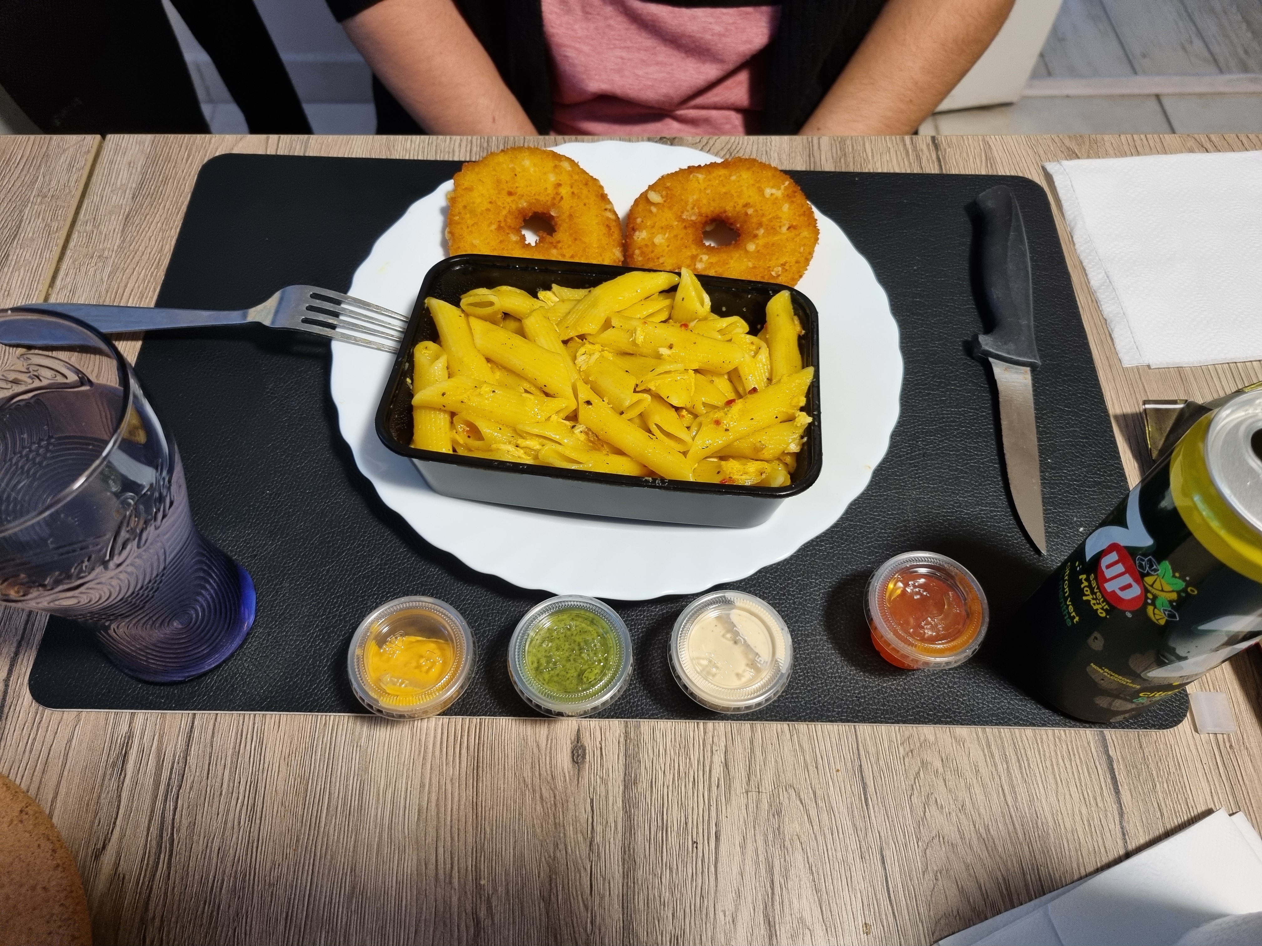 Poulet et tender avec pâtes indiennes très bon..je recommande En plus servi avec sourire.👍😁