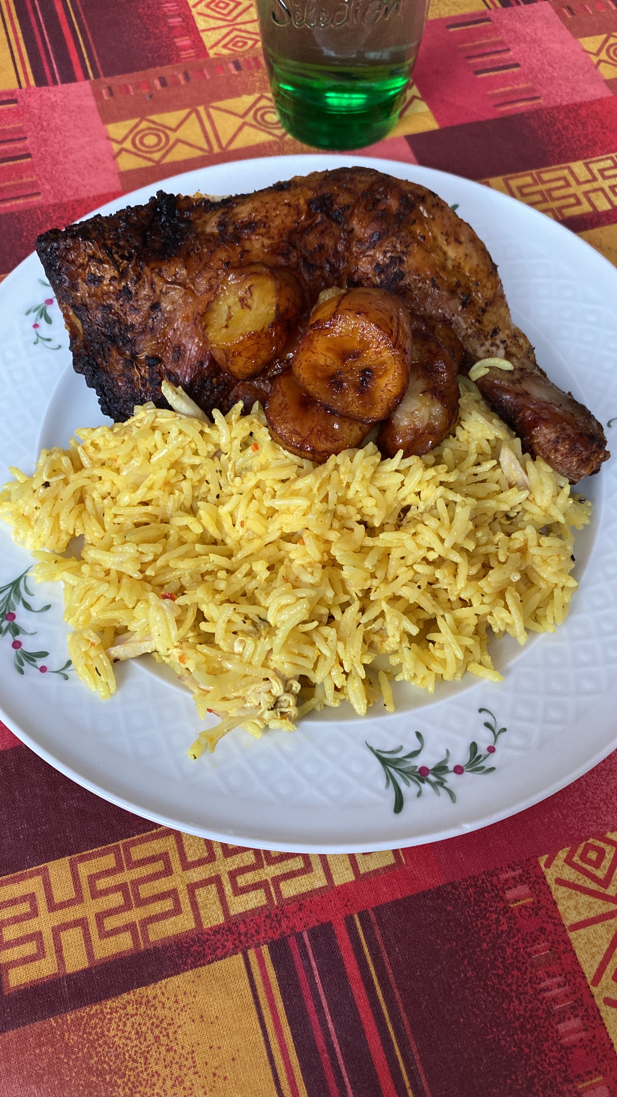 Merci encore à 100 % crousti pour ce super repas un petit poulet au four accompagner de banane plantain et un bissap et on a un super repas du soir