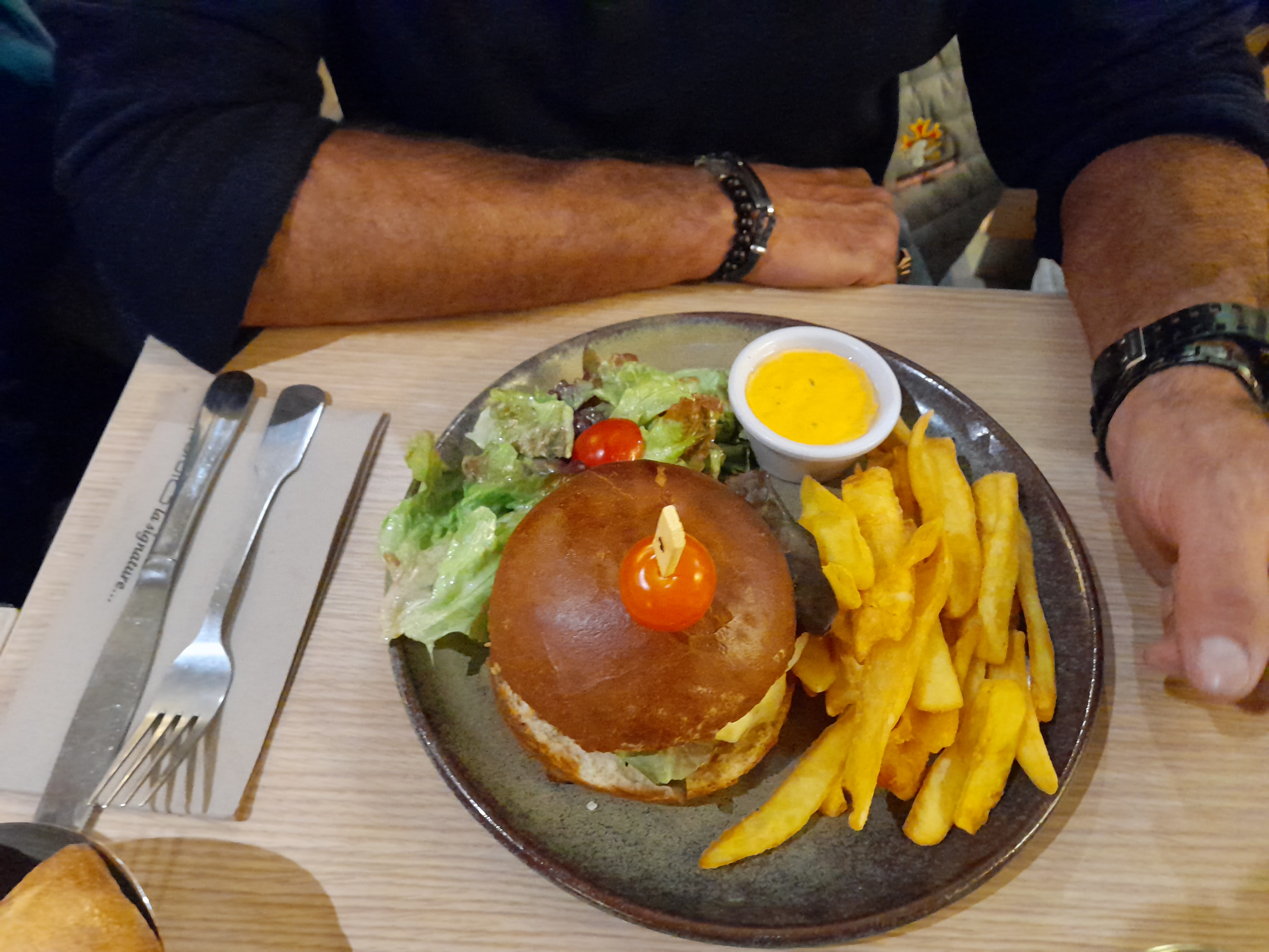 Samedi soir arrivée 20h , nous n’avons pas eu de carte des boissons prise de commande faite , les 2 burgers arrive au bout de 50 min .. Servie avec des frites pas cuite et une sauce coupée à l’eau. Ont ne nous à pas demander si nous désirions de l’eau ou du vin bref . Sincèrement même avant un cinéma je déconseille fortement car il y a mieux à côtés .