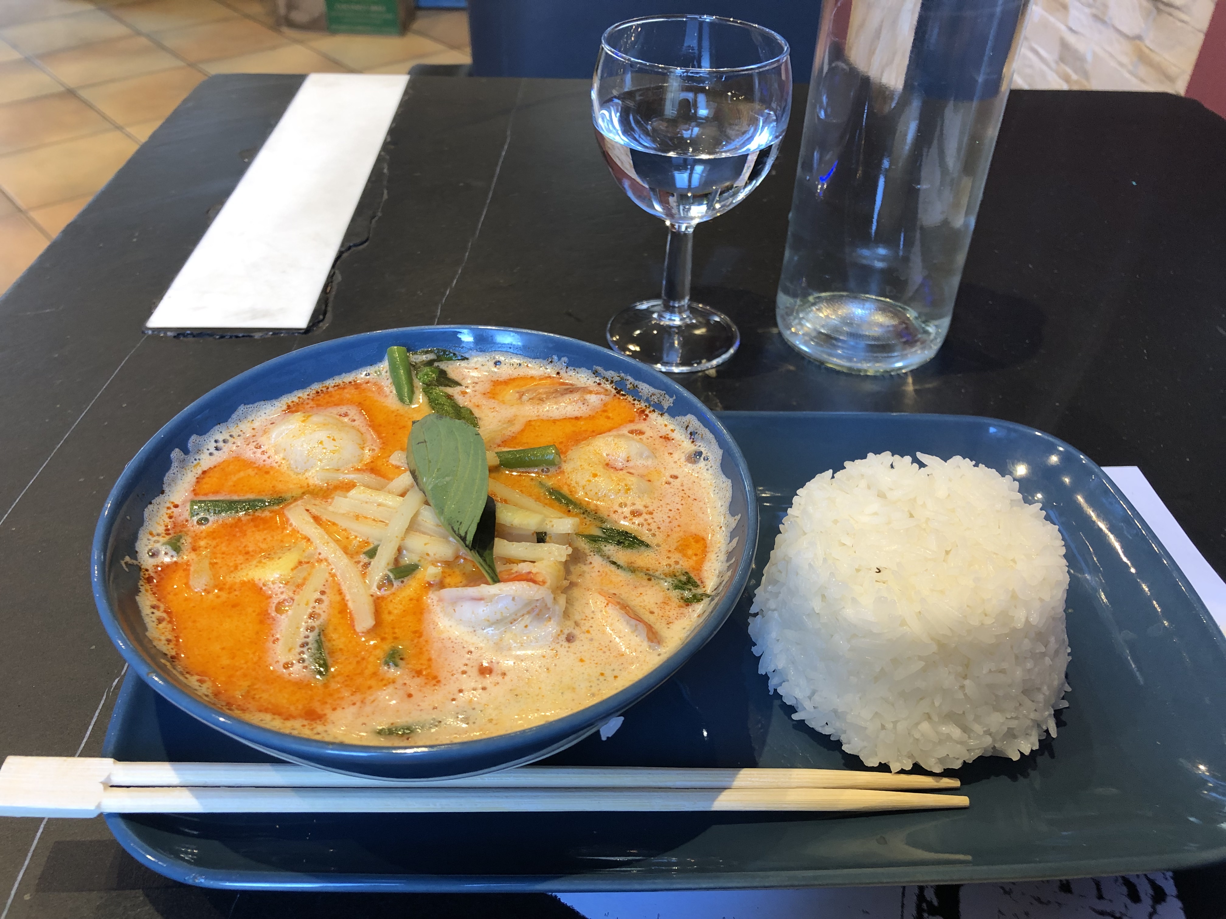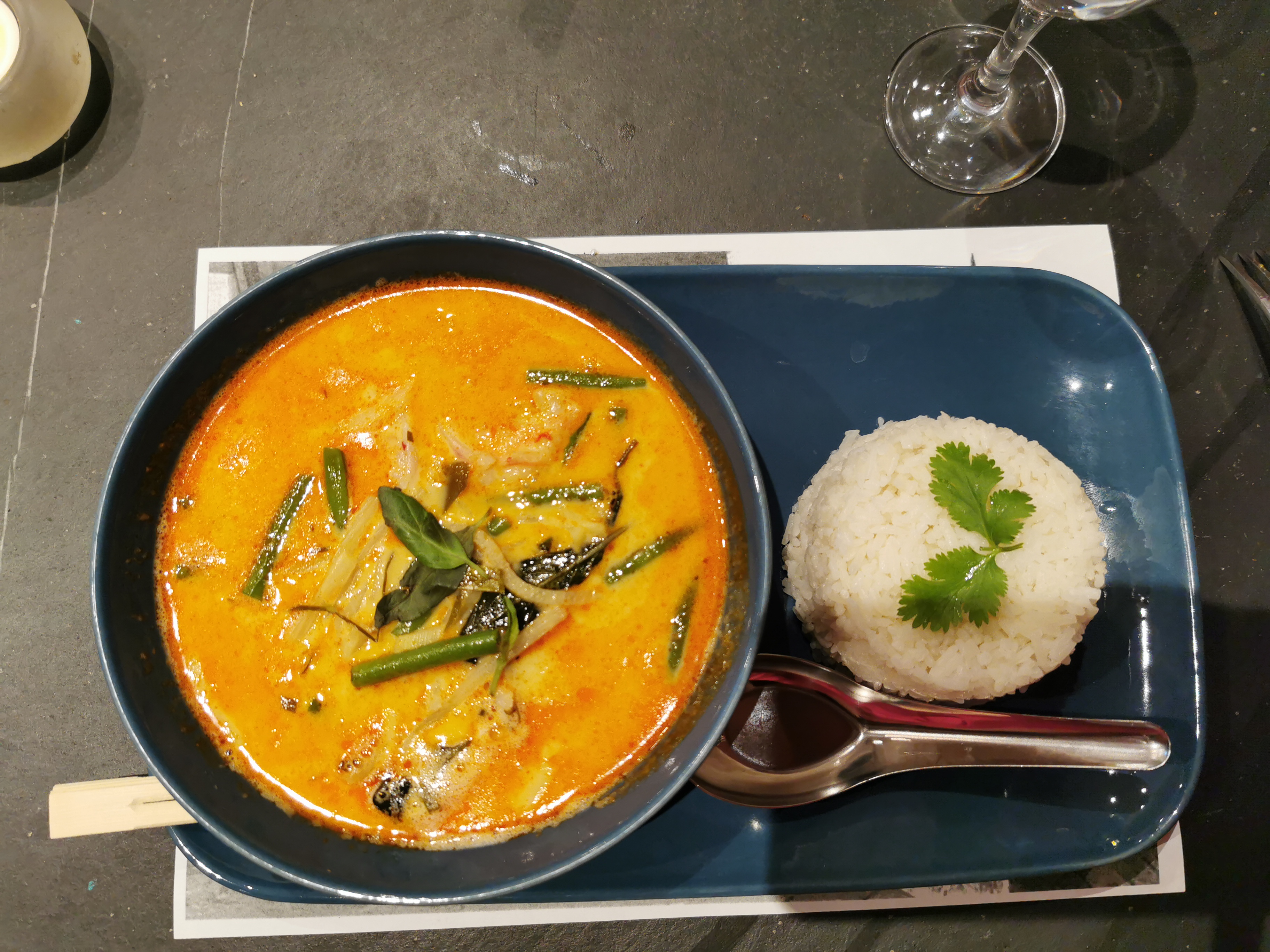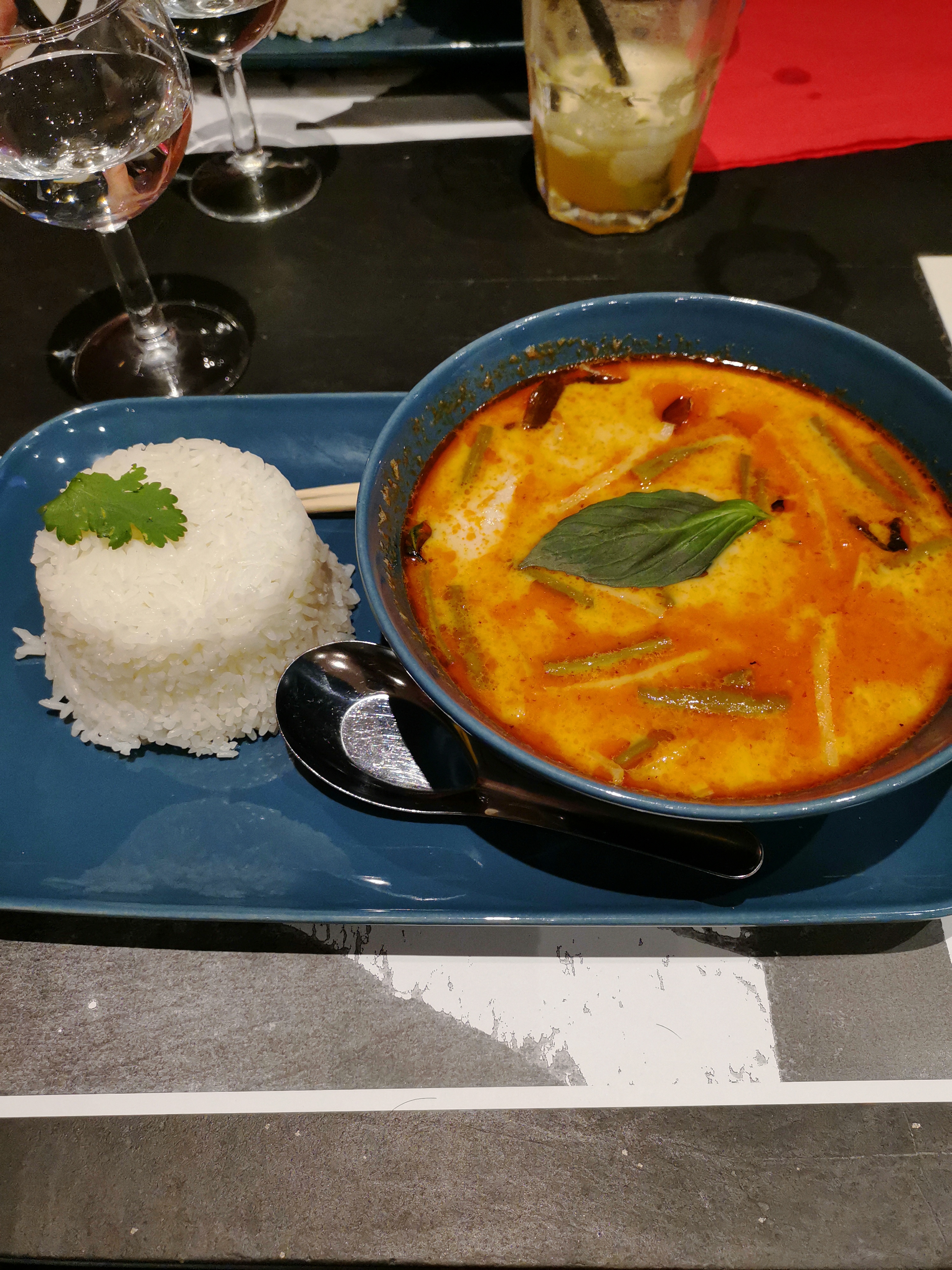 Trouvé en se fiant aux notes. Et c’est en effet un sans fautes. Tigre qui pleure pour moi, curry rouge pour monsieur. C’est pimenté 🔥 mais nous on aime ! Le dessert incontournable: le pain perdu façon Thaï!