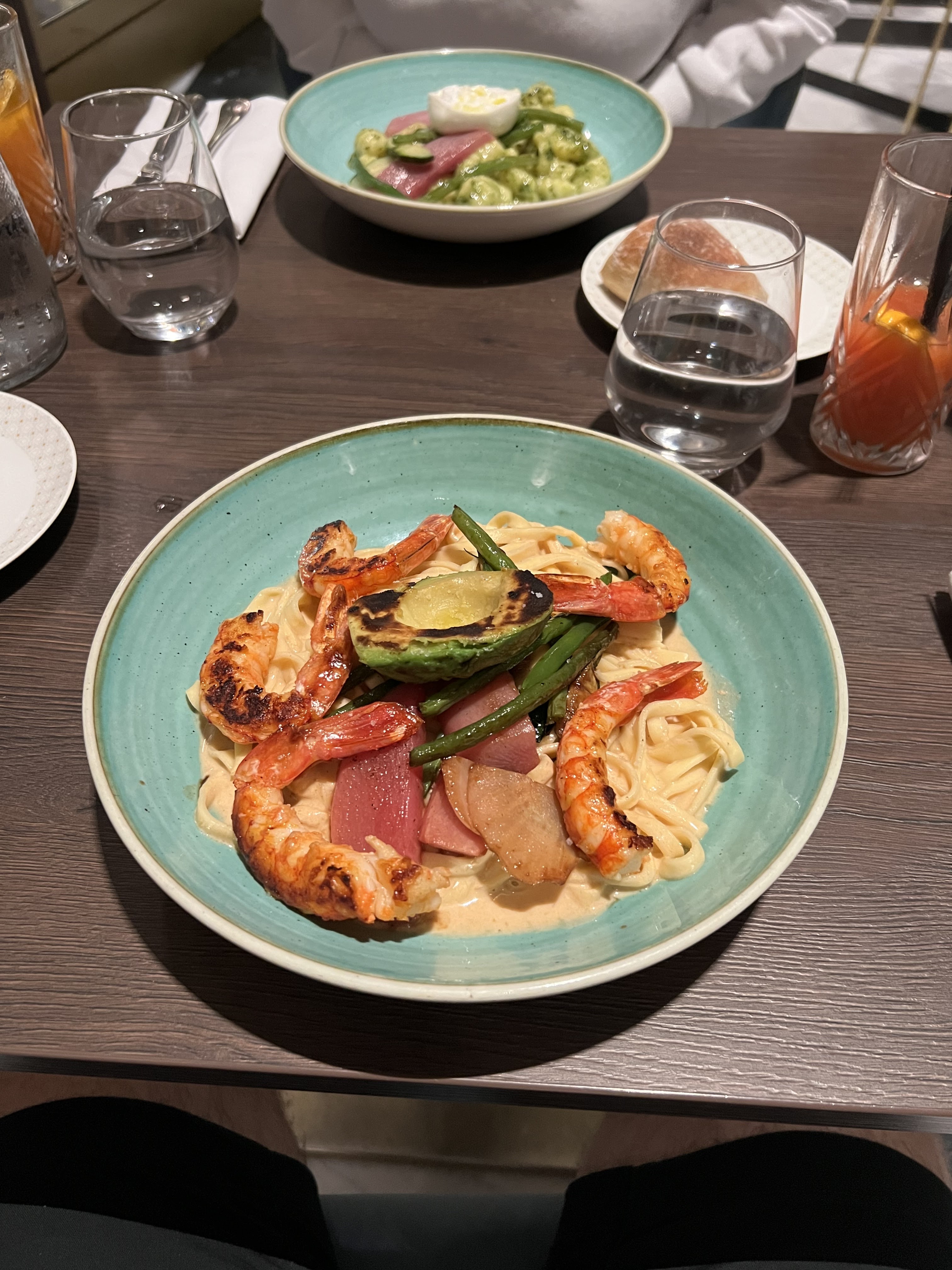 Le service était gentil et rapide. La nourriture était très savoureuse, j'ai bien aimé. Le seul point négatif est que mes pâtes étaient un peu collantes et que la texture n'était pas uniforme, certaines parties étant plus cuites que d'autres (peut-être que je n'ai pas eu de chance ce jour-là). Cependant, le goût de la sauce était très bon et les crevettes étaient fraîches et bien cuites. C'est un endroit où je retournerais pour goûter d'autres plats.