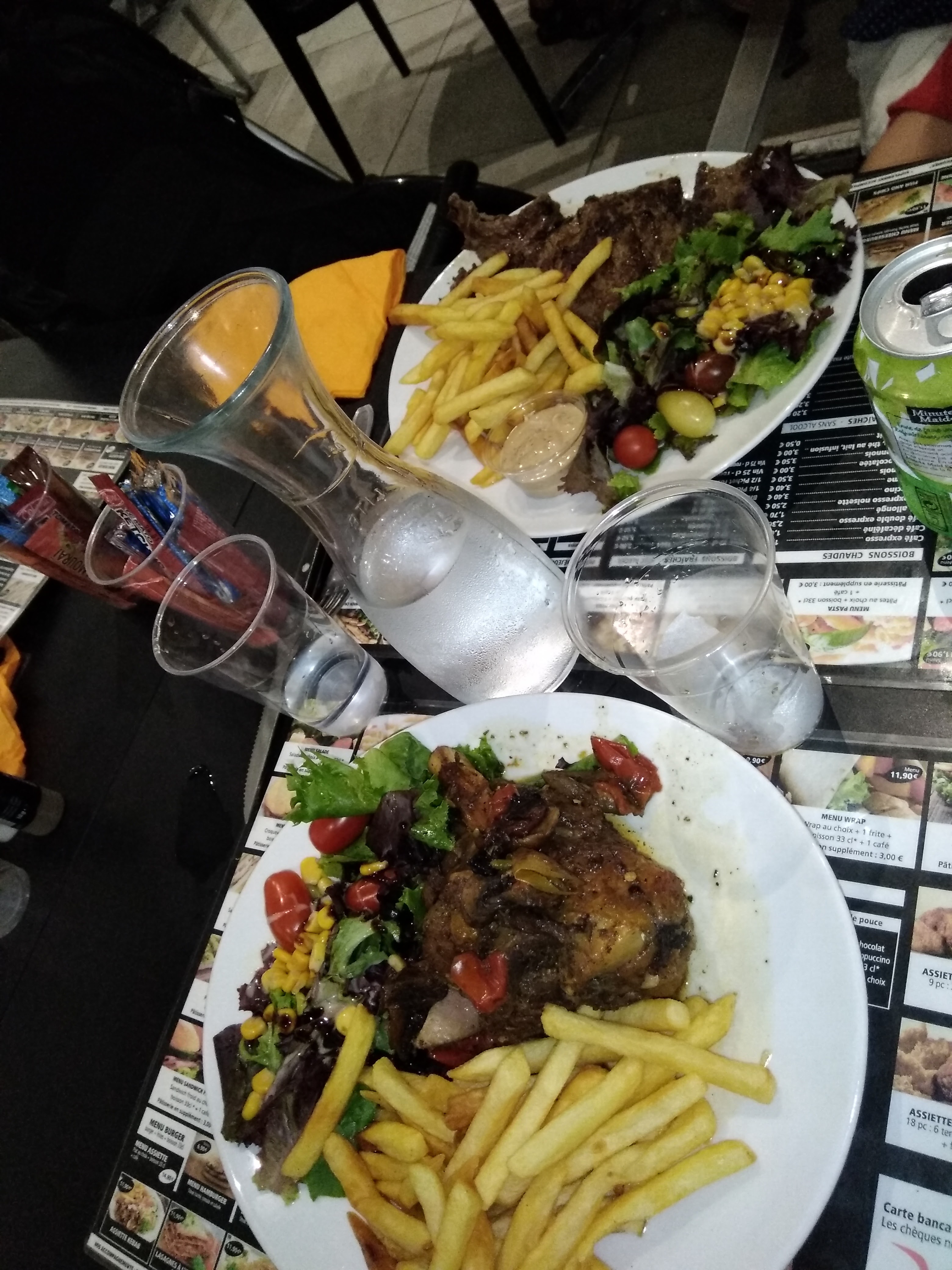 Qualité prix abordable En revanche, casi 45 min d’attendre pour des plats Heureusement que les boissons étaient là ;) Gros problème sur l’addition! On nous a fait passer 7 menu alors qu’aucun d’entre nous en avait prit … bref On a passé 30 min à essayer de faire comprendre à la filles derrière la caisse, que c’était pas normal… On a tourné en rond 30 min car on arrivait pas à se comprendre .. et ceux pour une chose qu’elles avaient très mal noté ! Elle ont fini a 3 derrière la caisse Et paraissait + agacée que nous en tant que client. Entre celles qui n’étaient pas accueillante, celle qui finissait par s’énervait, et l’autre qui passait derrière pour murmurer des choses pensant qu’on l’entendrait pas … Au lieux de 25,5€ par personne on a fini à 19€ .. la grosse différence ! On a essayé de nous voler 39€ Je tiens à préciser que mon collègue qui avait déjà payé sa part avant qu’on se rend compte du problème.. et personne l’a proposé un remboursement.. il a été gentil de ne pas vouloir aller plus loin.. Bref c’est dommage car on avait passé quand même de bons moments
