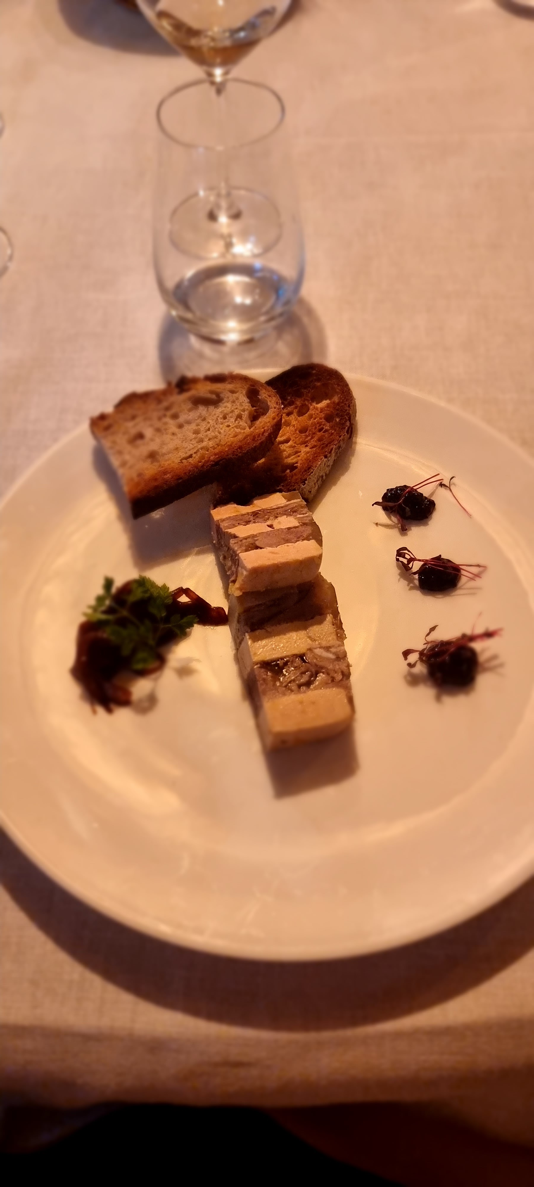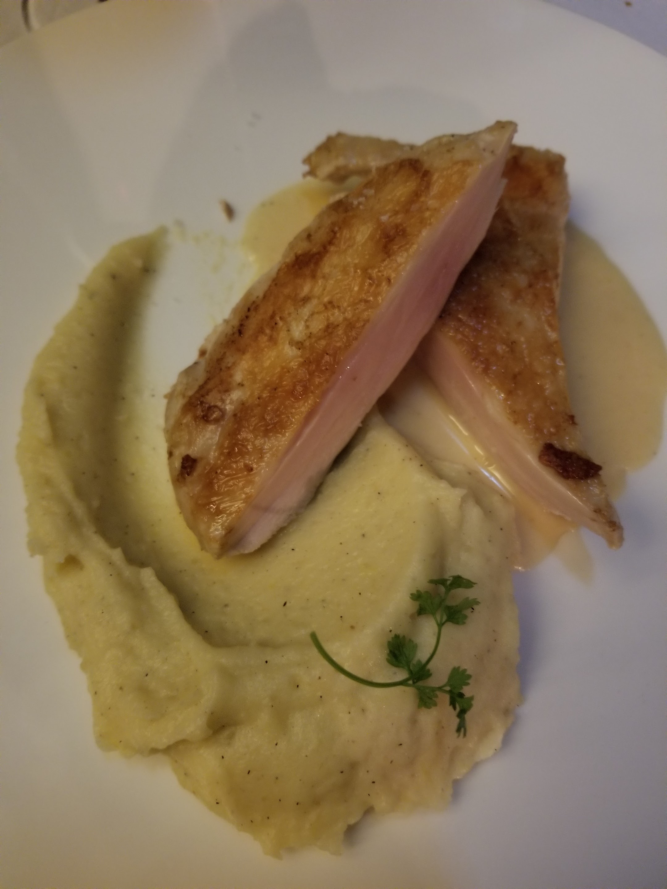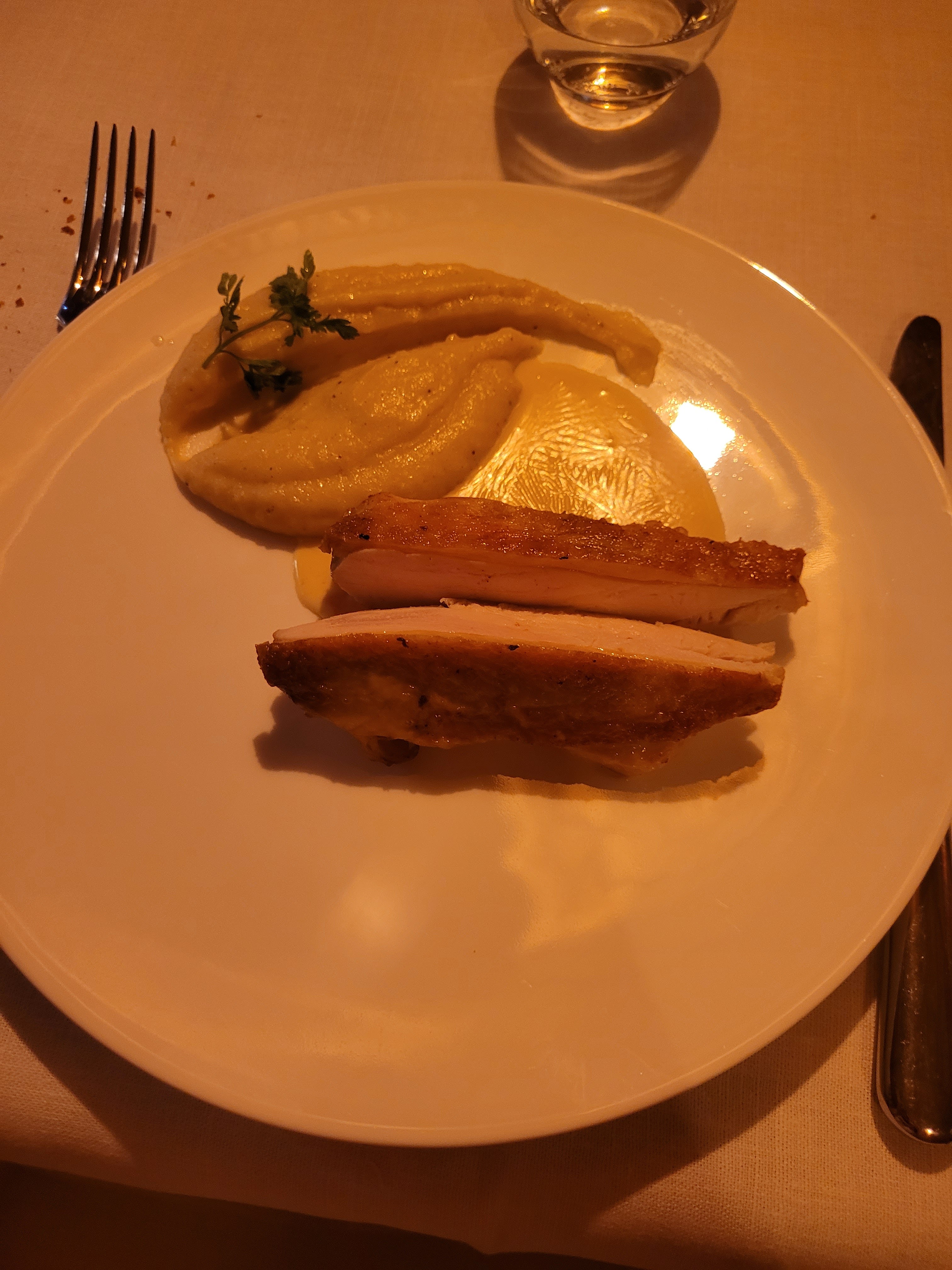Ma femme et moi étions ici pour un bon repas en visitant la région. La nourriture était très bonne et l'environnement était tout aussi agréable. Malheureusement, ce soir-là, il y avait un groupe géant au restaurant qui dominait les serveurs et nous laissait plutôt négligés. Normalement, cela serait acceptable, mais pour un restaurant qui commande plus de 100 € par repas, ce genre de chose ne devrait pas arriver.