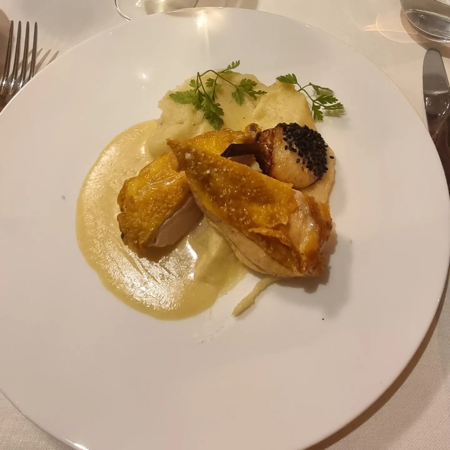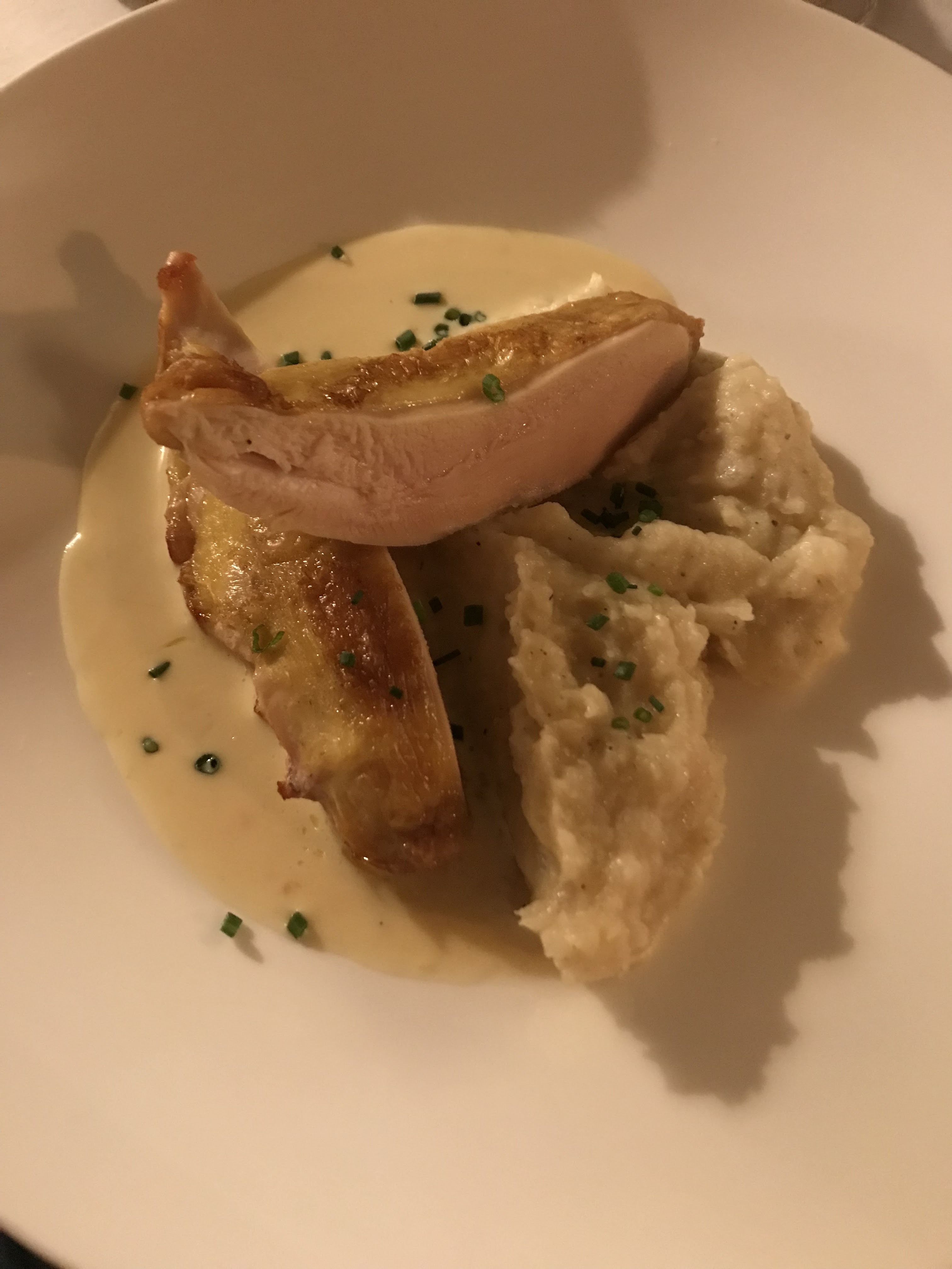 Une bonne note mais un peu déçu. Nous avions une grosse attente sur ce restaurant. Déception sur le manque d’accompagnement lors de la coupe de champagne. A 14€ la coupe on peut s’attendre à un petit à côté. La volaille n’était pas assez cuite et la simple purée ne rehaussait pas l’ensemble. Pour résumé c’est un très bon resto, on y reviendra mais des points perfectibles.
