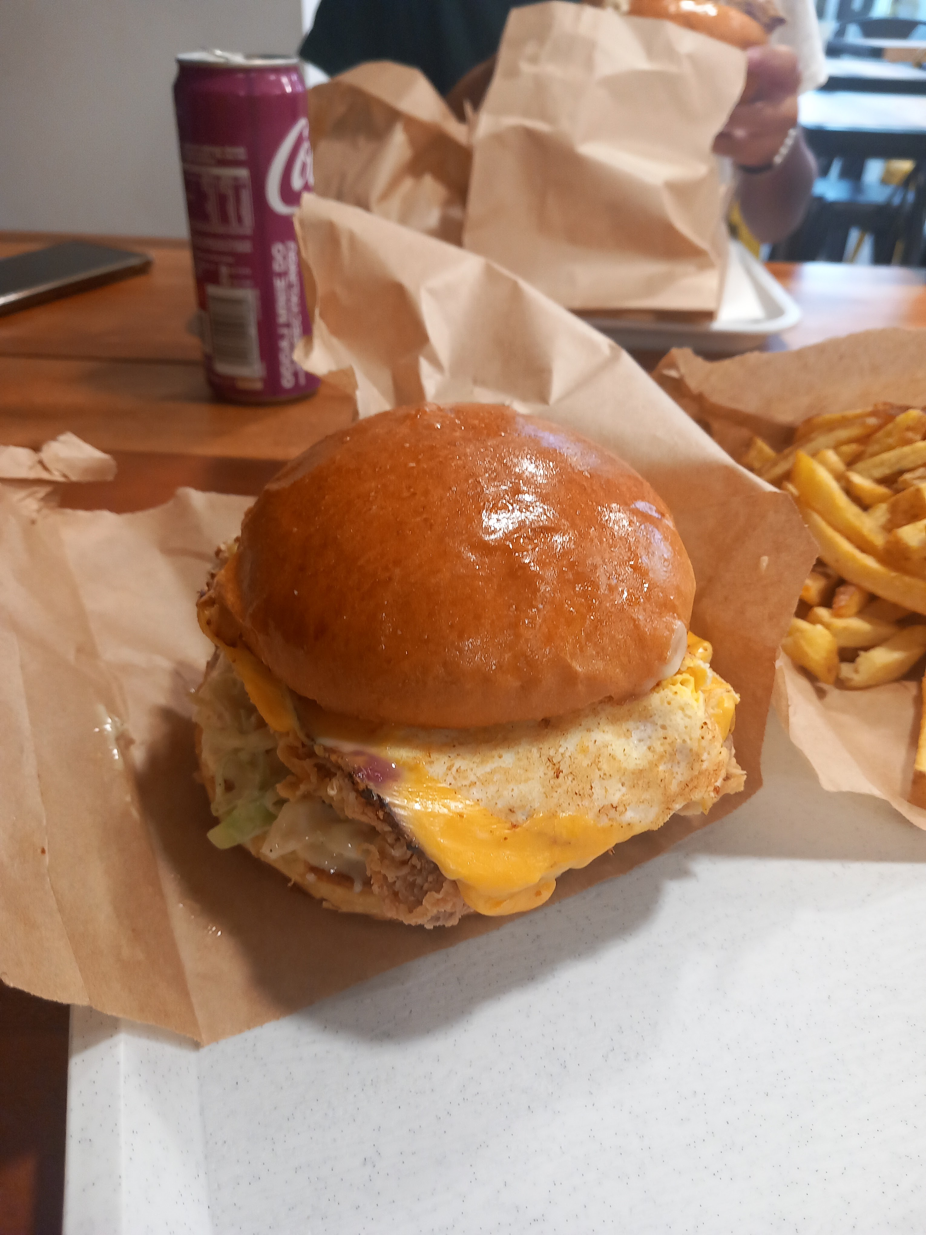 absolument délicieux, tout est fait maison et ça a du goût !! (人*´∀`)。*゚+ très gros burgers qui ne sont pas seulement jolie à voir et à prendre en photo mais aussi pleins de saveurs et de bonnes choses !! le poulet n'est pas du tout gras comme on pourrait trouver ailleurs, aucune trace d'huile et servis bien chaud dans une jolie bucket !! juteux et croustillant, tendre et appétissant, une merveille (๑♡⌓♡๑). les sauces sont au delà des anticipations, je recommande le ketchup et la sauce mango curry (bien que la sauce tzatziki soit tout aussi merveilleuse (。•̀ᴗ-)✧ !). et il y a même des desserts !! l'emplacement est parfait, un parking en face et il y a une terrasse où s'assoir pendant les journées chaudes. le patron est au top !! (✿^‿^) je recommande à 100%, si quelqu'un est déçu je lui achète une voiture, on verra bien !! ¯\_( ͡° ͜ʖ ͡°)_/¯