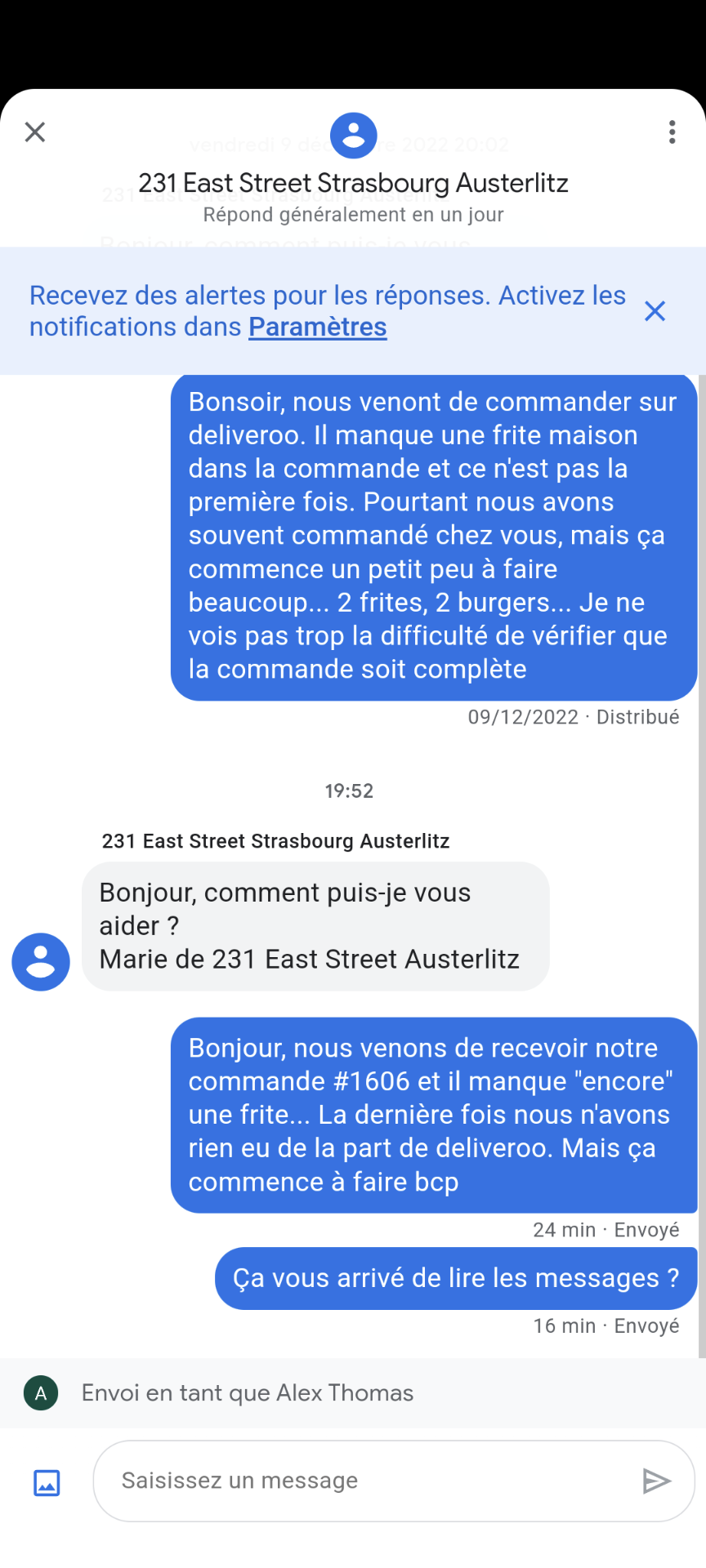 Les réponses à nos questions concernant les différents types de burgers n’étaient pas claires, nous avons quand même passé commande mais plusieurs ingrédients n’étaient plus disponibles. Soit. Mais, même en nous confirmant que certains ingrédients étaient présents, arrivés chez nous nous ne les avons pas trouvé dans nos burgers. Manger un burger avec un steak et quelques oignons ne m’a guère enchantée. Qui plus est, les portions de frites sont maigres et peu suffisantes. Nous avons donc encore très faim. Je suis très étonnée au vu des différentes expériences positives parmi les avis. Il est urgent de se ressaisir !
