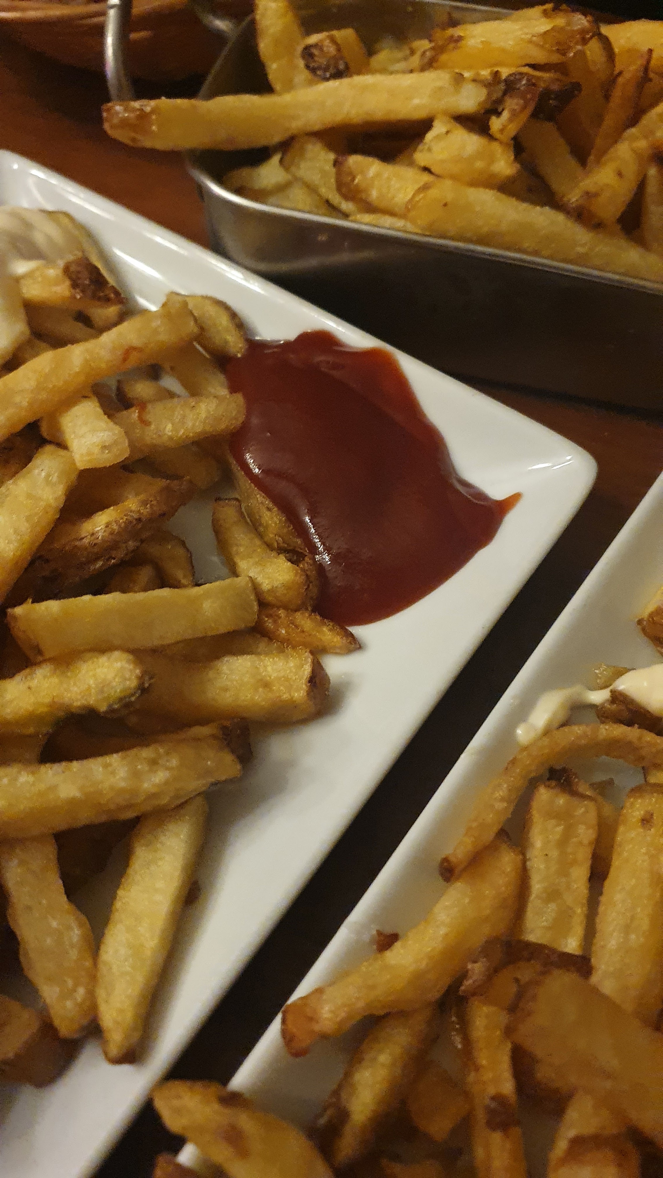 Les frites sont super bonnes , Les bières aussi. Une serveuse était super agréable avec nous, par contre le propriétaire est infâme. Il est d'abords arrivé vers nous en nous disant de pousser nos affaires assez agressivement, car on gener la terrasse certes, mais un bonjour excusez-moi n'allait pas le tuer. Ensuite ils nous regarder bizarrement avec Des grimaces, et pour finir ils nous debarasse et nous dit seulement avec un ton condescendant c'est fini ? Alors qu'il a deja Les assiestes dans Les mains. Sans oublier que monsieur le proprietaire dans sa precipitation a fait tomber la mayonnaise sur nos affaires et ne s'est pas excusez. Bref 1er et derniere fois dans ce lieu, mauvaise experience pour ma part.