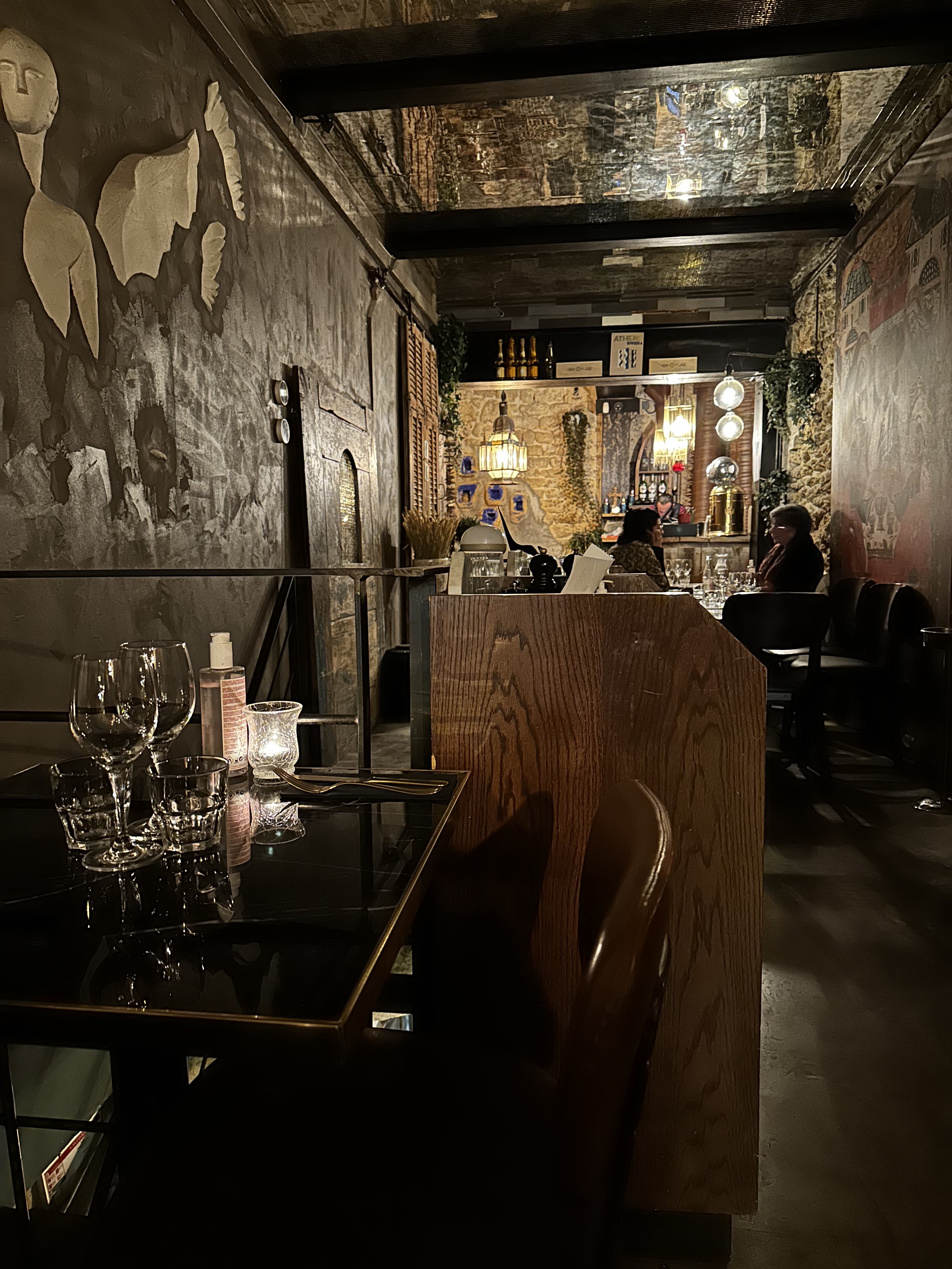 Rien à redire sur la déco du resto: charmant comme tout avec les poutres, les pierres/ briques/ verres aux murs avec des toiles inspirées de la culture orthodoxe, et une surprise avec la fontaine incrustée au mur. Les resto dispose d'une salle en sous-sol. Côté cuisine : c'est pas mal, mais cela pourrait être mieux. Rien à dire sur le trio de dips (houmous, tzatziki et tarama), vraiment très bon. Les plats pas mal, mais froids (et peut-être pas assez de quantité pour les gros mangeurs). Desserts, ça va. La carte fera voyager en Grèce, pas de souci. Service : on a attendu longtemps pour le plat, personnel sympa mais un peu plus de délicatesse serait pas mal. Les prix sont corrects.