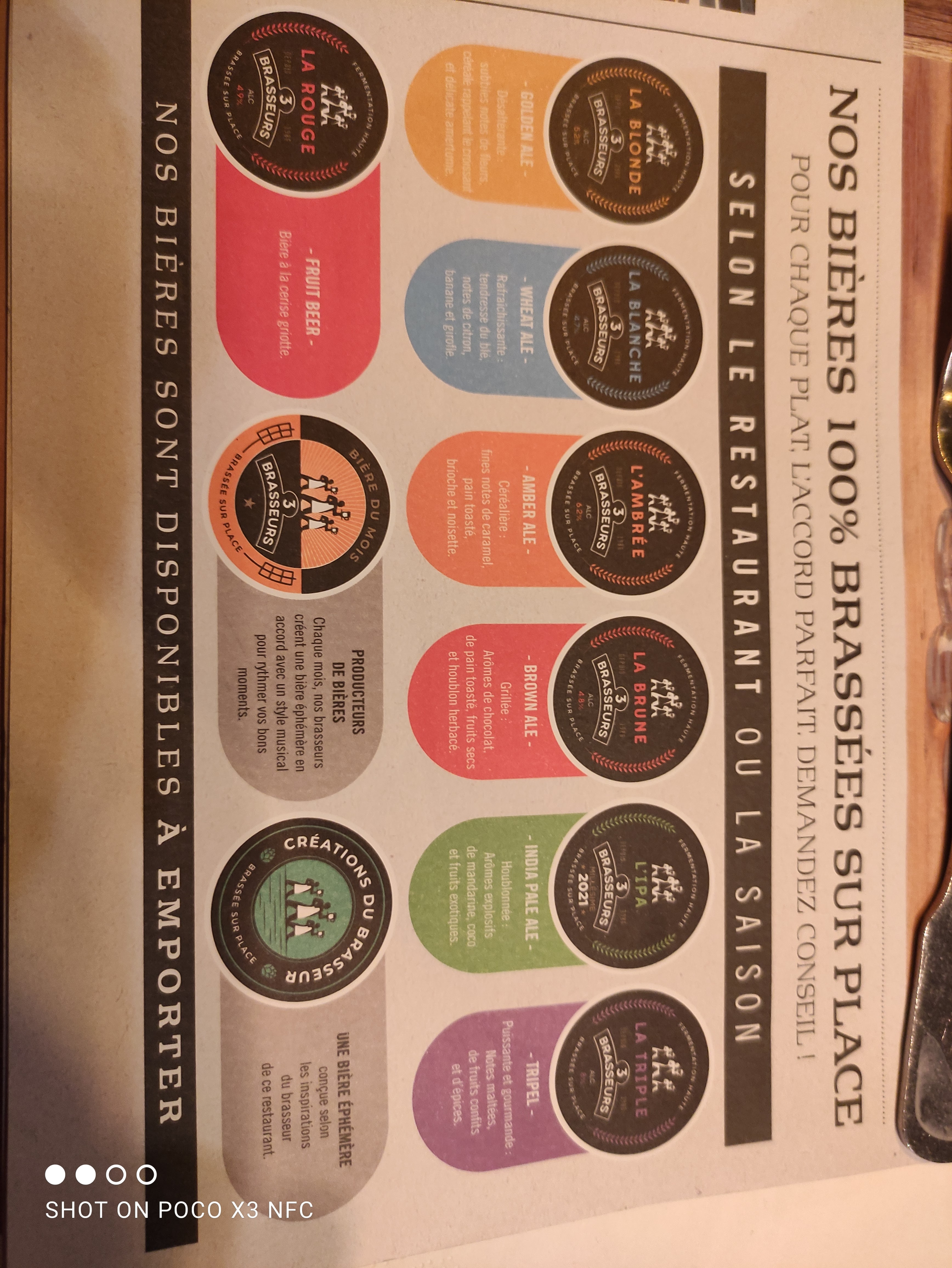 Une superbe expérience. Le lieu est très bien situé dans une grande zone commerciale. Il est très bien décoré et propre. La carte est topissime : une variété de plats et de desserts sans égale avec la carte basique 3 brasseurs. Un plus également appréciable: le petit carton rond en dessous des flammekuches qui évite le contact avec la planche en bois. Si j avais une seule petite critique, ce serait le temps d attente avant de prendre notre commande mais c est tout. Top! Merci Dommage que vous soyez si loin...