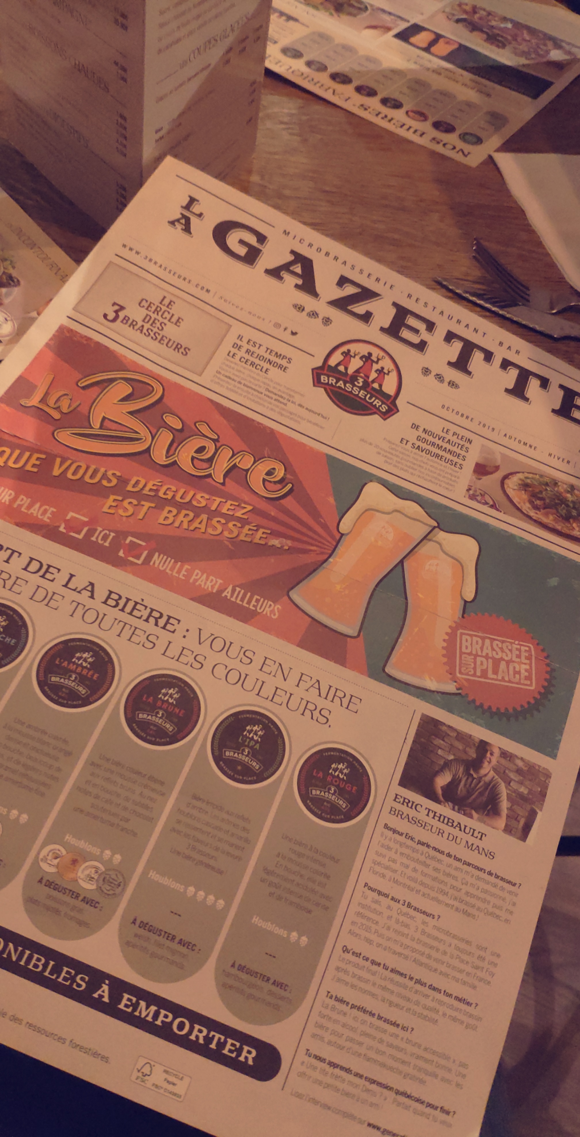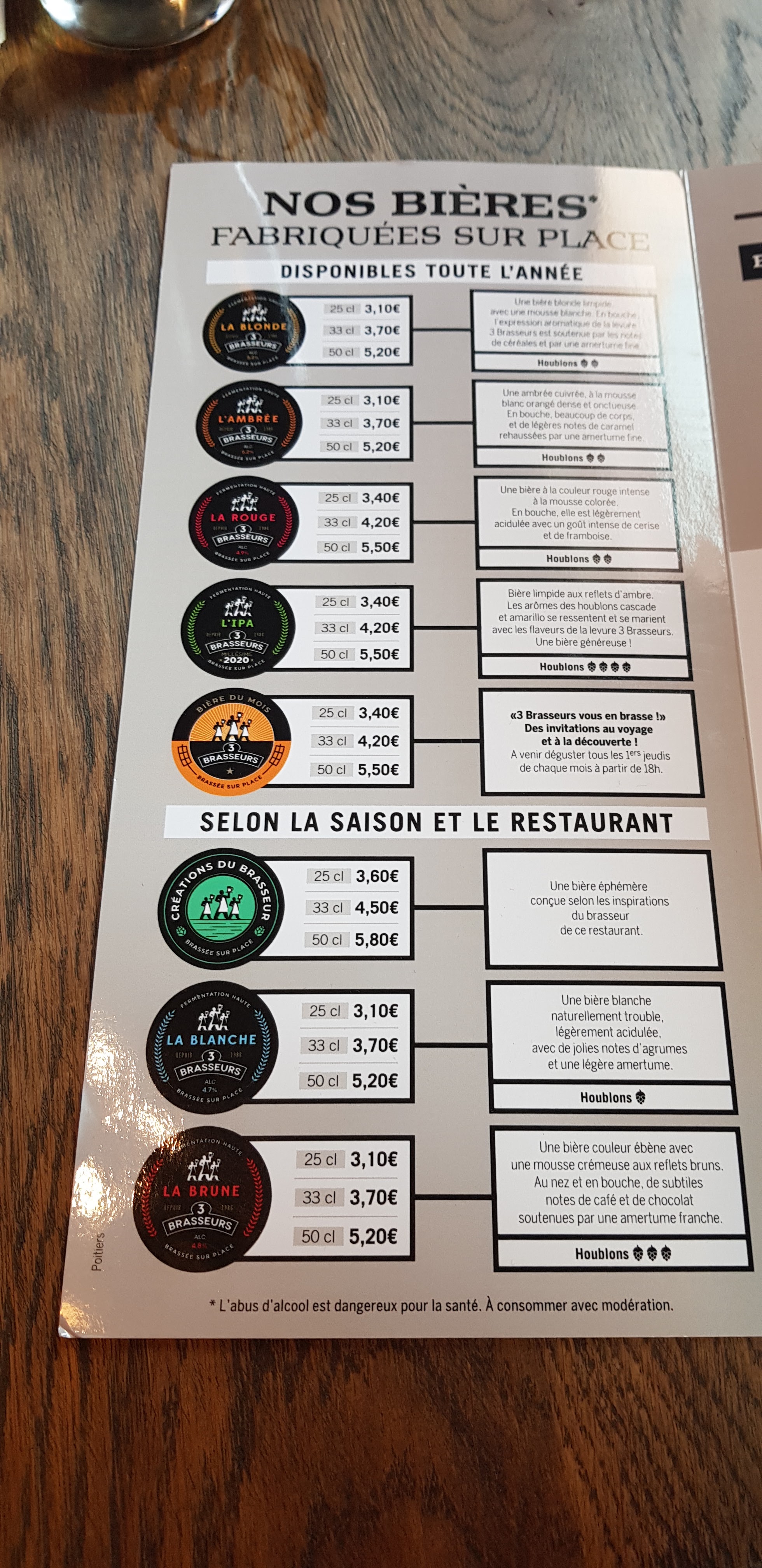Une salle très chaleureuse, esthétiquement au top. C'est vraiment joli, et très intéressant. C'est pas juste décoré, l'ambiance fait sens, il y a une certaine cohérence, un véritable univers. L'équipe est tout à fait sympathique, le service très rapide. La carte est très alléchante. D'abord encore esthétiquement, c'est une carte hors du commun, pleine d'information, elle saura vous surprendre déjà rien que par son aspect ! Ensuite de part son contenu... Ne comptez pas venir une fois au 3 Brasseurs et repartir satisfait. NON. Il vous faudra revenir, pour goûter ce plat là ça à l'air et bon, oh et celui là aussi il me donne envie ! ... Enfin. Dans tous les cas attendez moi, je reviens pour le dessert ! (Oh et du coup tant qu'à faire, évidemment c'est vraiment très bon)