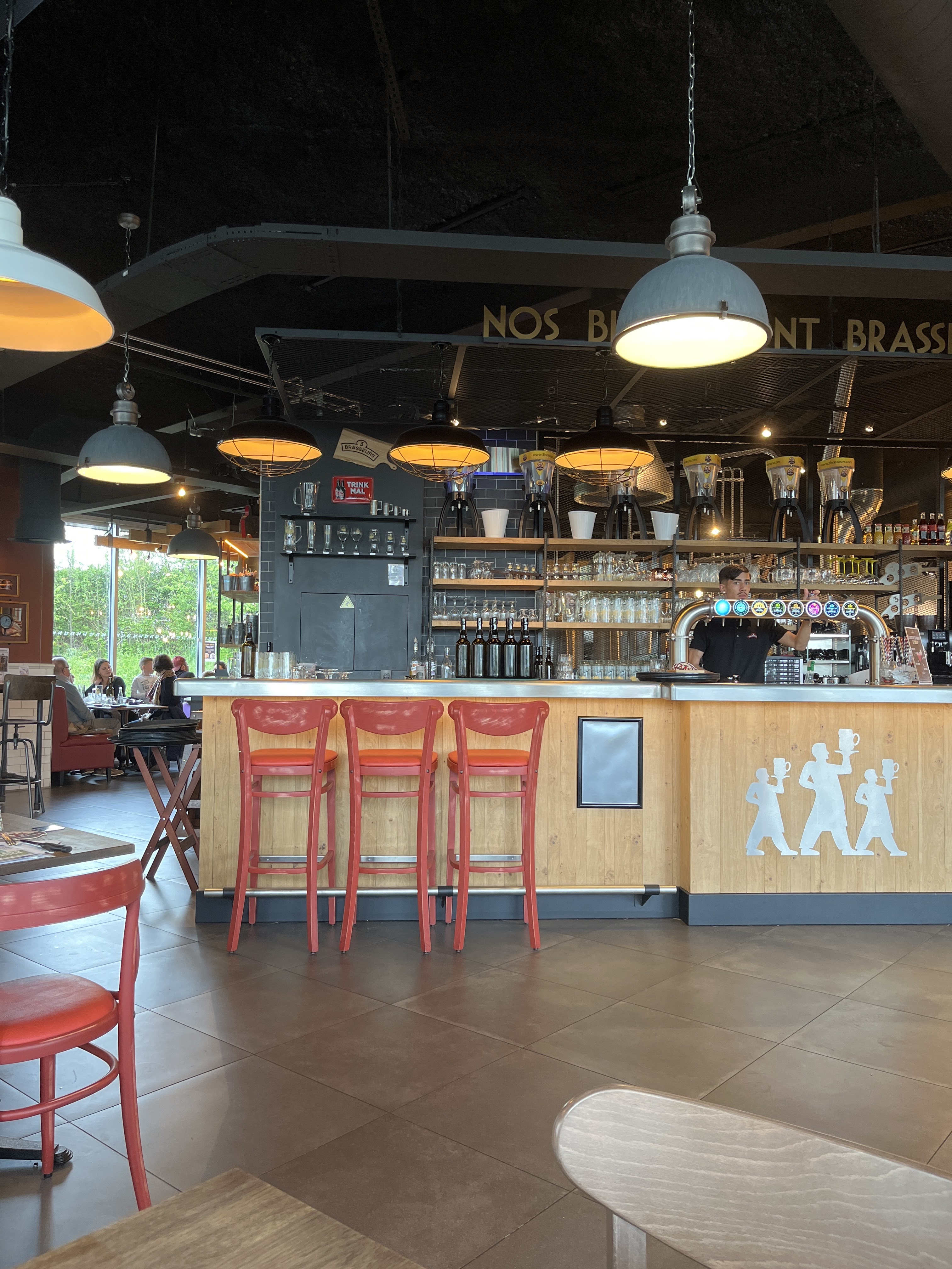 Ça manque de photos selon moi sur la carte des menus. On a du mal à imaginer les différents plats alors que, installée devant le passe plat, chaque assiette éveillait ma gourmandise. Mais dans tous les cas le plus important pour moi: le service!! Thomas, un serveur disponible et patient qui prend le temps d'écouter, de renseigner, ne nous met aucune pression, nous laisse pro Fi ter de ce moment!! Une sereinite hors pair qui fait du bien! Un grand Bravo à lui pour avoir compris l'essentiel et offrir une belle présence à ses clients. Salaire à augmenter rapidement pour ce jeune homme exceptionnel. ;-) Cadre agréable et équipe sympa. Concept original. Le menu enfant offert le mardi soir et ce même une veille de jour férié ... Bref bravo les 3 brasseurs. Pensez encore un peu aux enfants genre petits jeux de carte style dobble ou autre petit jeu pour les parents qui oublient ;-)