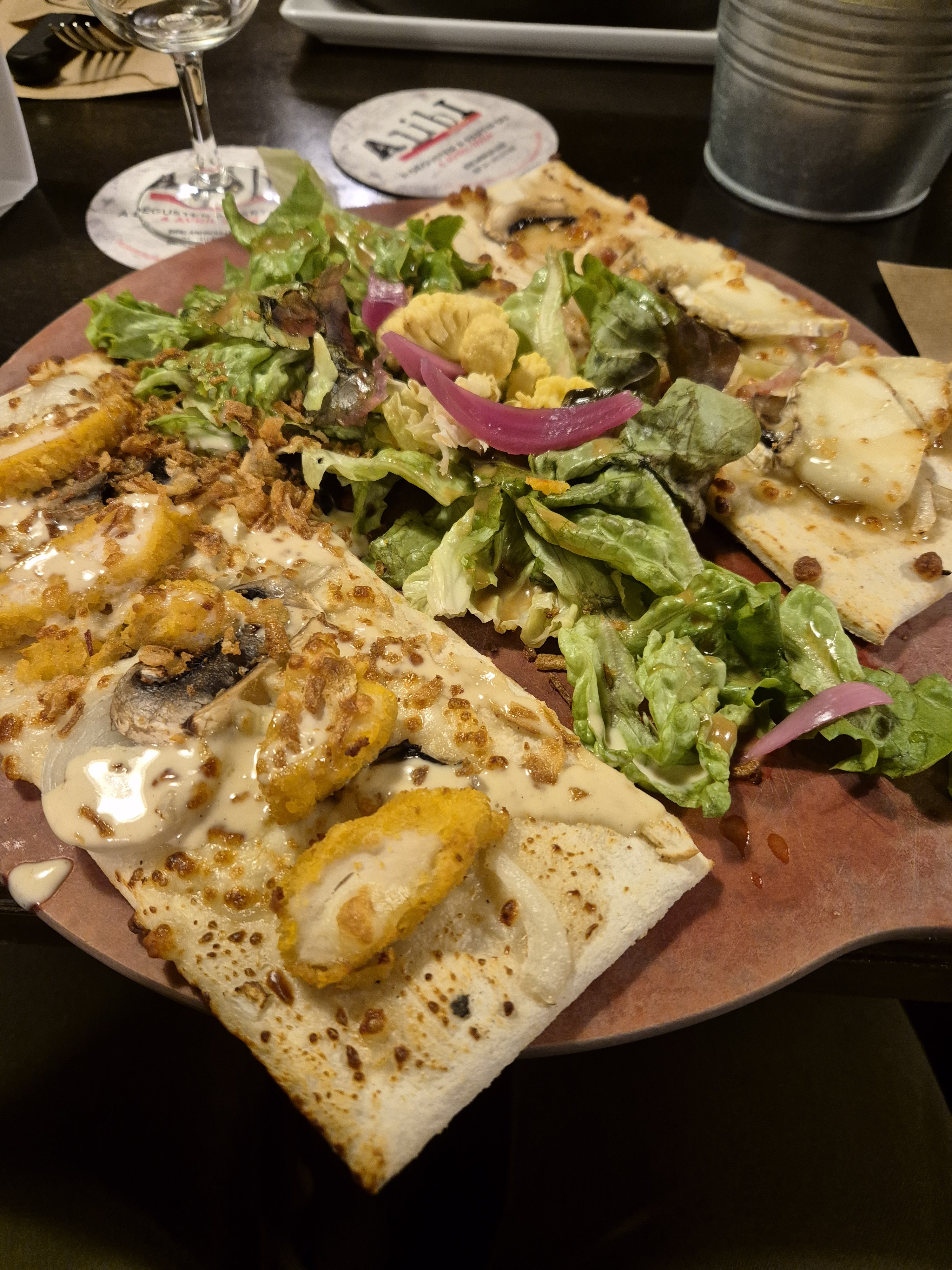 Attention aux végétariens ou régimes spéciaux, j'ai commandé une flam veggie mais j'y ai trouvé du poulet !! Plat remplacé (j'ai pris un autre plat) et offert (heureusement...). Je n'y retournerai plus, plus de confiance !!