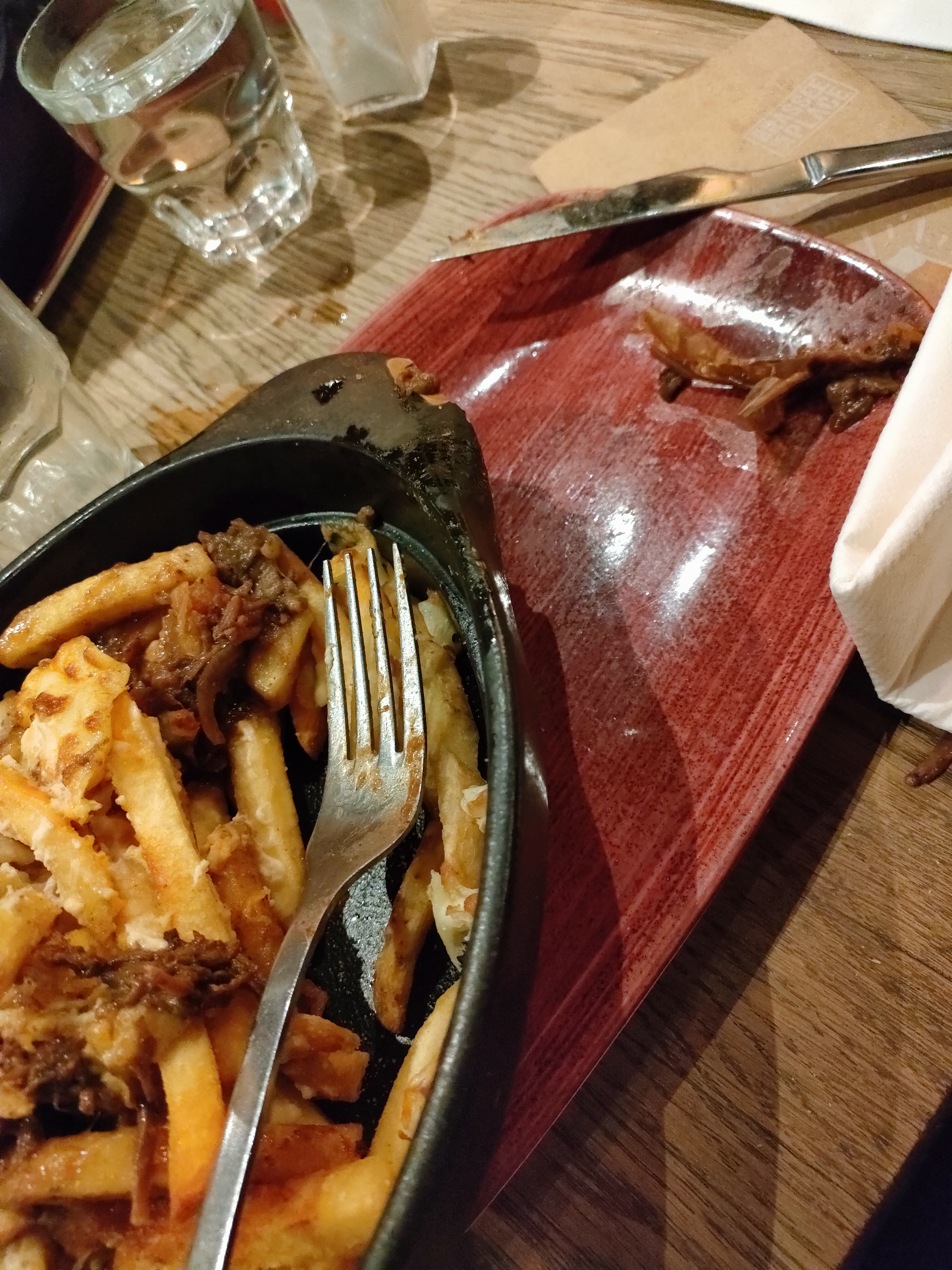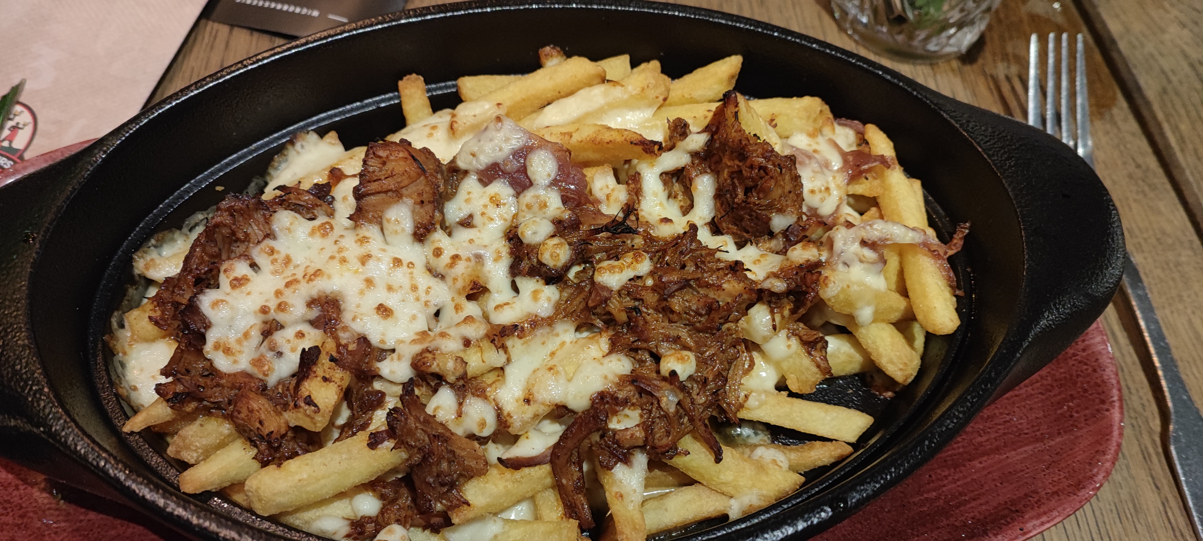 Une fois pas deux poutine beaucoup trop de frites une pincée d' effiloché de boeuf le cheddar était timide les bières sont arrivées après que l on ai mangé la moitié des plats serveurs pas très souriant addition salé 4plats 5bieres 1dessert 120euros