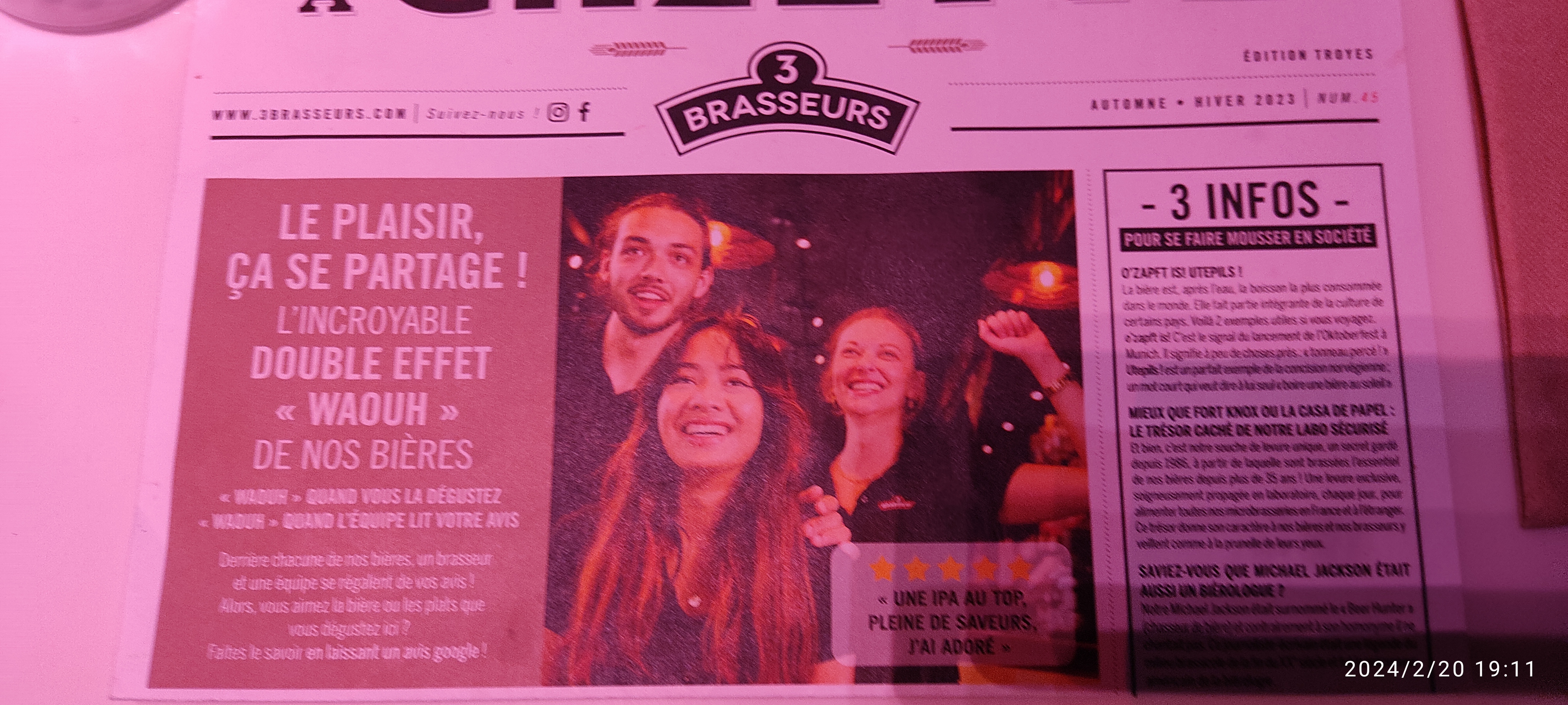 Bon vous savez dans quoi vous mettez les pieds. Pour un 3 brasseurs c'est très bien, le cadre est top pour le reste pas de surprises. Si vous arrivez un peu tard le soir vous aurez souvent de la place. Faite simple un burger c'est toujours une valeur sur