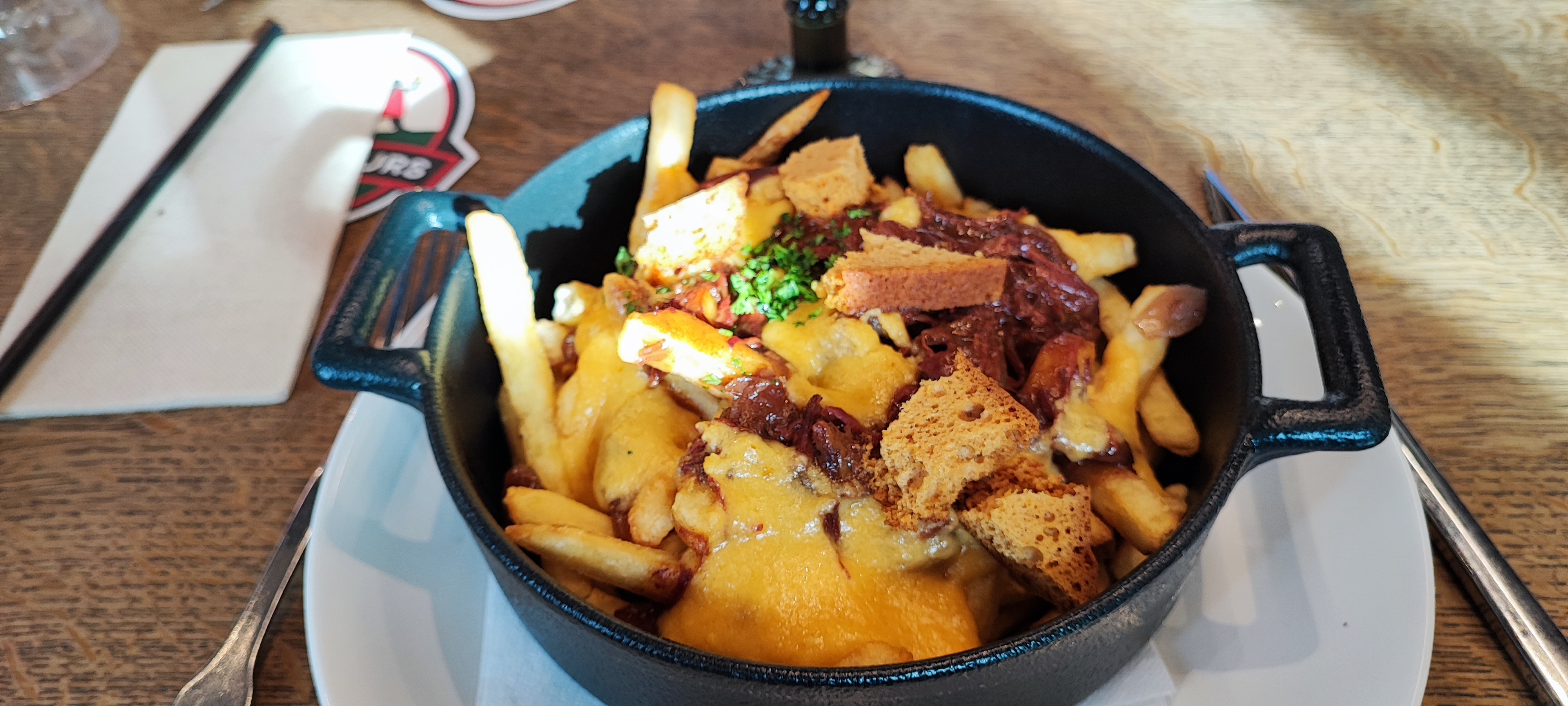 Venus en groupe, la commande avait pourtant été faite la veille au matin. À l'arrivée, les tables n'étaient même pas disposées, plus de 2 heures pour être servi et une commande de tournée d'apéritif pour combler l'attente qui se perd. La désorganisation la plus totale! En termes de plat, j'avais commandé le poulet au maroilles, ce n'est pas le meilleur que j'ai mangé. Mon mari avait commandé une poutine, il cherchait les morceaux de bœuf... Je ne pense pas réitérer l'expérience