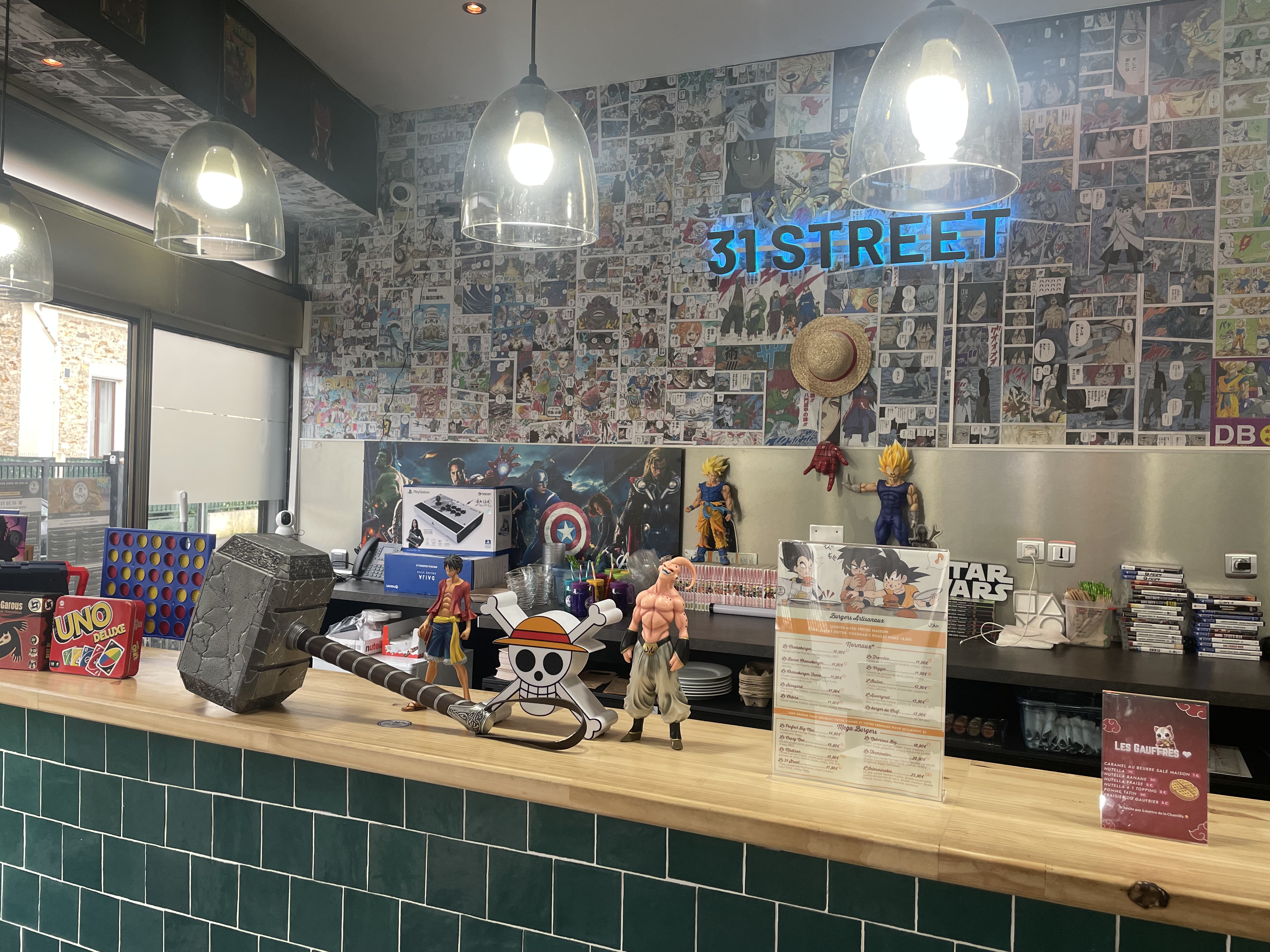 Très chouette restaurant à thème, steak haché frais façon boucher hallal, pain frais, les frites sont très bonnes, bref je me suis régaler, l'ambiance geek manga et un peu de comics et Marvel top, on se sent vraiment bien et j'ai même remarqué des jeux de société sur le comptoir, si vous êtes tenté essayez ça vaut le coup