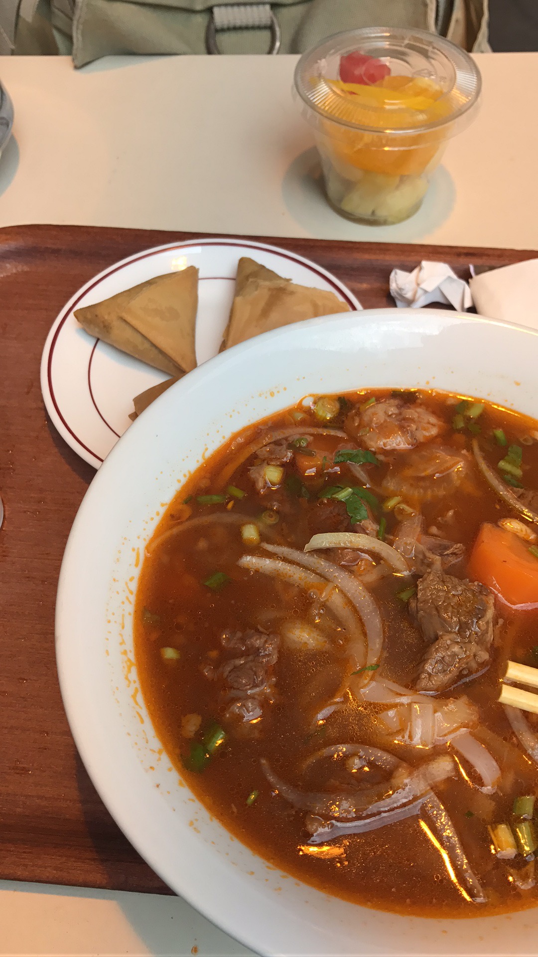 J’ai pris la soupe bœuf 5 parfums en menu, super déçu. Je n’ai pas eu bœuf mais le gras de bœuf, les nems bien mou et vieux, salade de fruits acide... Personnel désagréable, clairement trop cher au par rapport qualité. Je travaille à côté du coup beaucoup entendu que c’est à éviter et je confirme : je ne reviens plus. Déconseille fortement