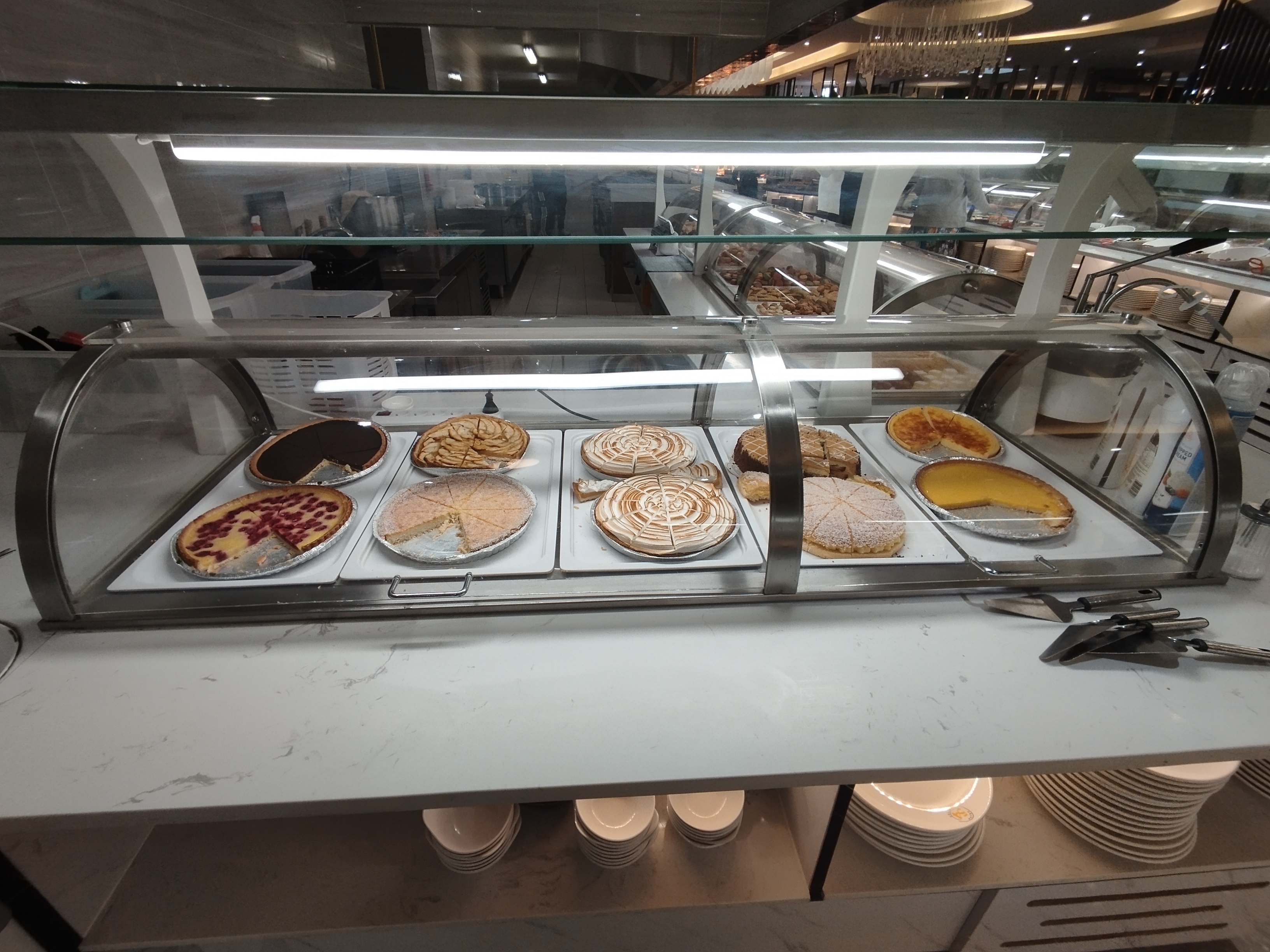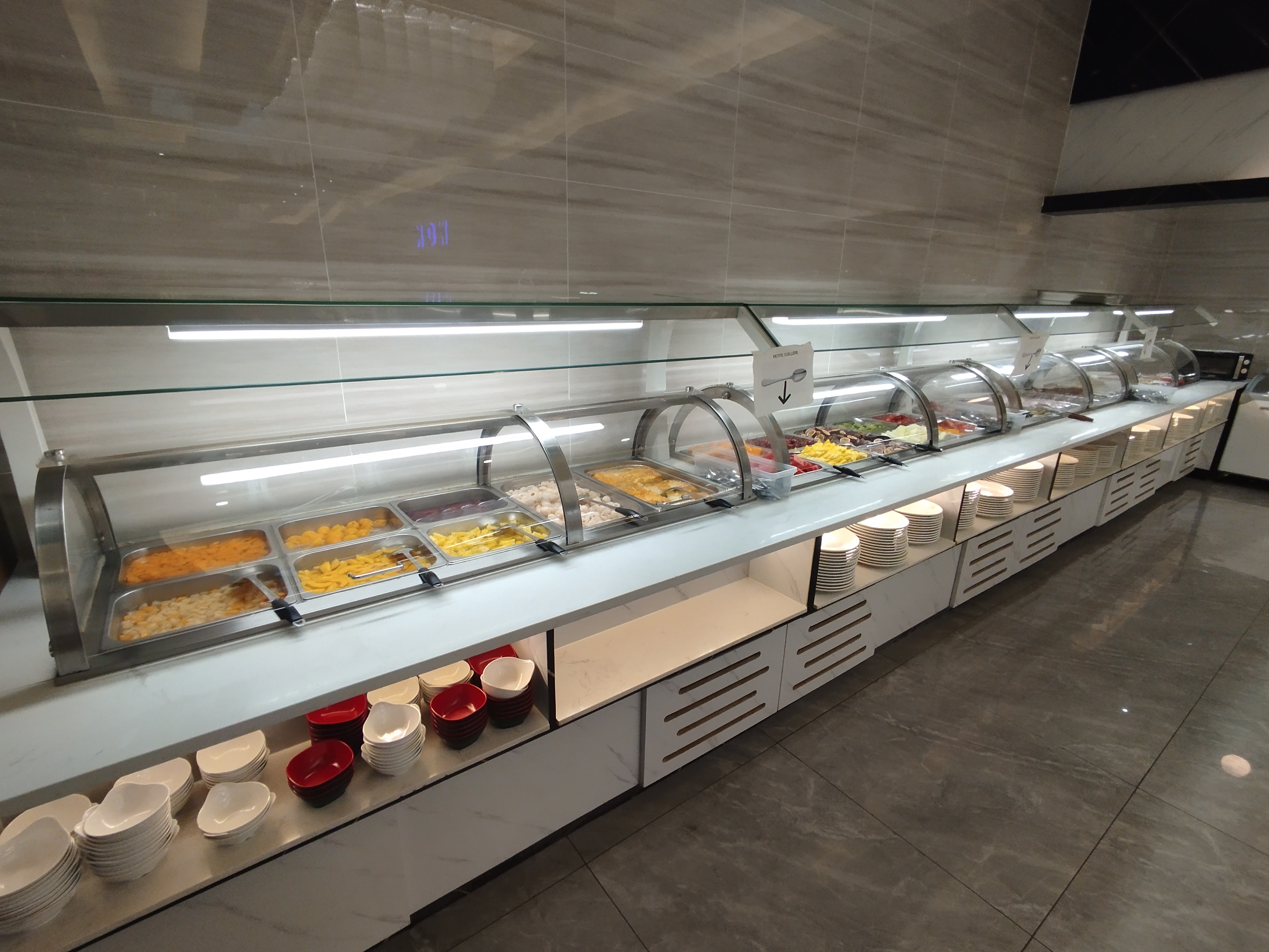 Beaucoup de choix de plats, tous très bons et chauds. Service rapide pour les boissons, même assisté de robots. Par contre côté ambiance... Marbré au sol, néon de couleur ... Un restaurant buffet comme on peut voir partout !! Ambiance froide et sans personnalité