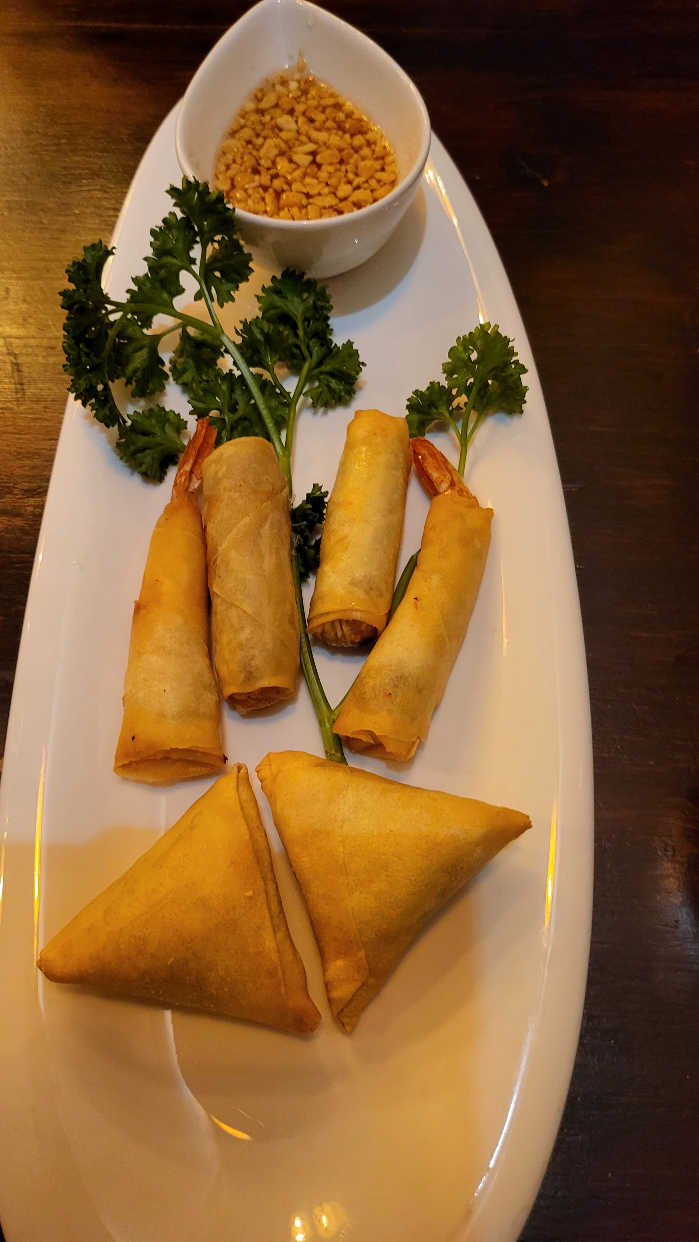 Accueil sympathique Service de qualité et rapide Entrées bien préparées Endroit calme et agréable Assortiment maison complet Poulet Curry rouge maison un peu trop liquide mais parfumé et bien relevé