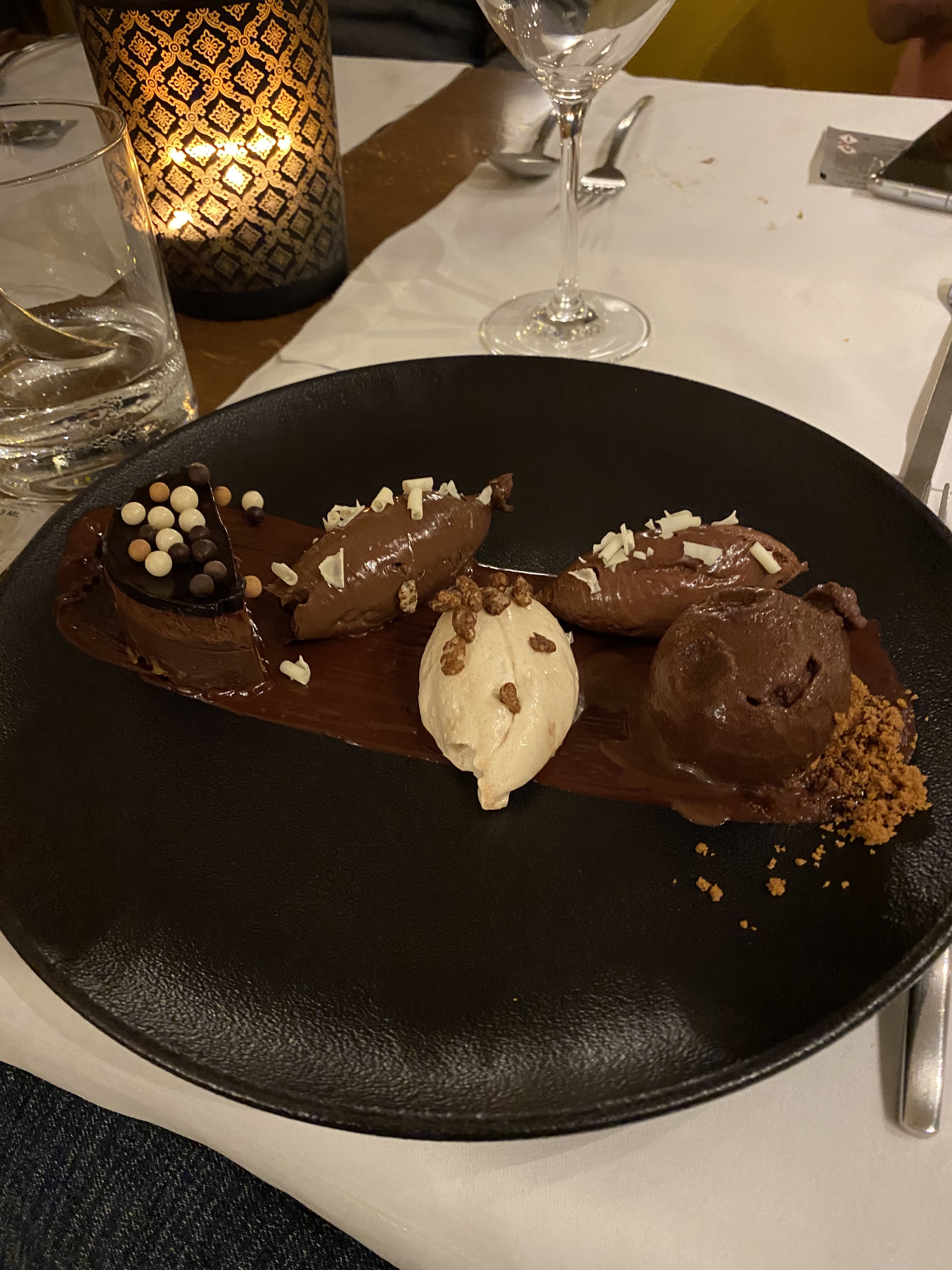 J'ai réservé ce restaurant car je voulais dîner avec vue sur la tour Eiffel et fêter l'anniversaire de mon copain. Nous n’avons pas eu la meilleure vue, mais nous avons pu la voir s’éclairer au coucher du soleil. Notre serveur était super sympa et drôle. Il semblait vraiment aimer parler à tous les invités et il a fourni de nombreuses recommandations intéressantes. Nous avons commandé: - Risotto crémeux - c'était une excellente entrée et j'ai adoré la truffe et l'artichaut - Côtelette de veau - - j'avais ça comme entrée et wowwwwww c'était incroyable. Je retournerais à Paris juste pour revivre ça. Il était parfaitement cuit à point, si tendre et parfaitement assaisonné. J'étais obsédé par la panure au curcuma et les noisettes qui recouvraient le dessus de la côtelette. C'est aussi une portion assez copieuse, ce qui m'a surpris compte tenu du prix - une surprise tellement agréable. - Tranche de gigot d'agneau - Mon petit ami a commandé ceci comme entrée et il a adoré. L'agneau était également parfaitement cuit et assaisonné. Nous avons terminé avec un dessert qu'ils ont préparé pour l'anniversaire et ils ont eu ces petits oursons à la guimauve vraiment mignons recouverts de chocolat.
