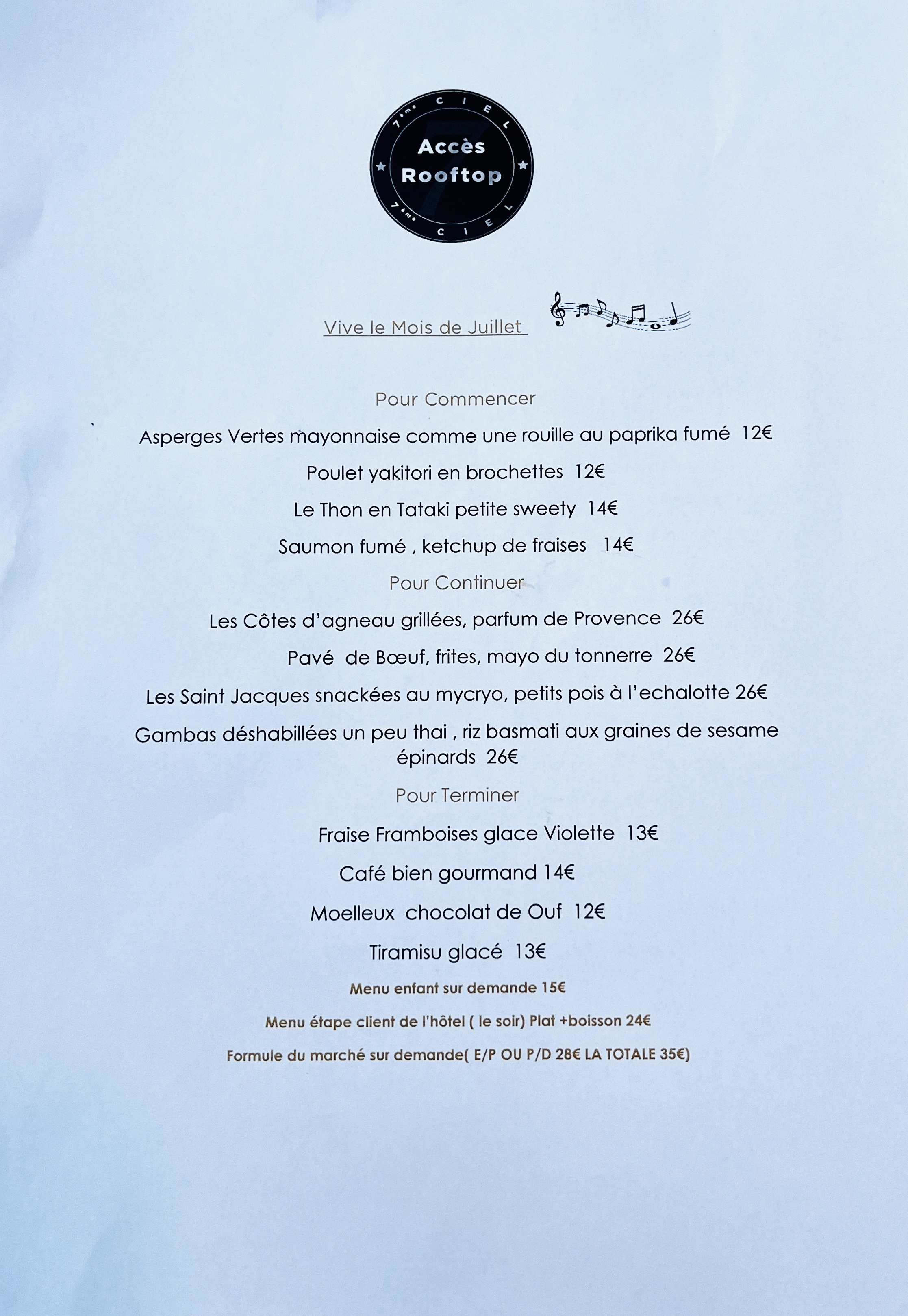 Ce n'était pas le 7ième ciel ce repas... L'ambiance et le côté rooftop est pas mal mais il y a beaucoup de choses à revoir à côté ! Les tables sont trop proche les unes des autres, on perd ce côté intimiste alors même qu'il y a de l'espace, les spots chauffant sont une bonne idée mais il y a des tables, notamment la nôtre qui était proche d'une fenêtre où il faisait froid, on a attendu très longtemps entre le verre d'apéritif et le choix du repas, on a pas pris d'entrée car il n'y avait plus de burrata un samedi soir, on a entendu par le biais d'autres clients qu'ils se faisait livrer en début de semaine et que c'était pour éviter le gaspillage, mais compte tenu de la carte il fallait prévoir jusque la fin de semaine.. attente toujours très très longue pour le plat principal, on a vu des clients arriver après nous et servis plus rapidement avant nous.. gros problème sur la cuisson de la viande blanc bleu qui était saignante avec pleins de nerfs et compte tenu du prix annoncé, on s'attendait à mieux et plus garni, grosse difficulté à avoir un serveur dans la salle pour faire part du mécontentement de la cuisson, pareil pour le poisson c'était assez simpliste par rapport au prix il manquait vraiment quelque chose, on a donc décidé de quitter la table sans prendre de dessert vu la déception grandissante au fil de la soirée, arrivé au bar on nous propose un digestif chacun comme lot de consolation ainsi que plusieurs noix de coco, on aurait préféré que la cuisson de la viande soit refaite par exemple ou qu'il y ait un autre geste commerciale car compte tenu du standing et du prix c'est vraiment abusé, on est reparti avec une note salé et en restant sur notre faim.. je suis très déçu pour le coup.