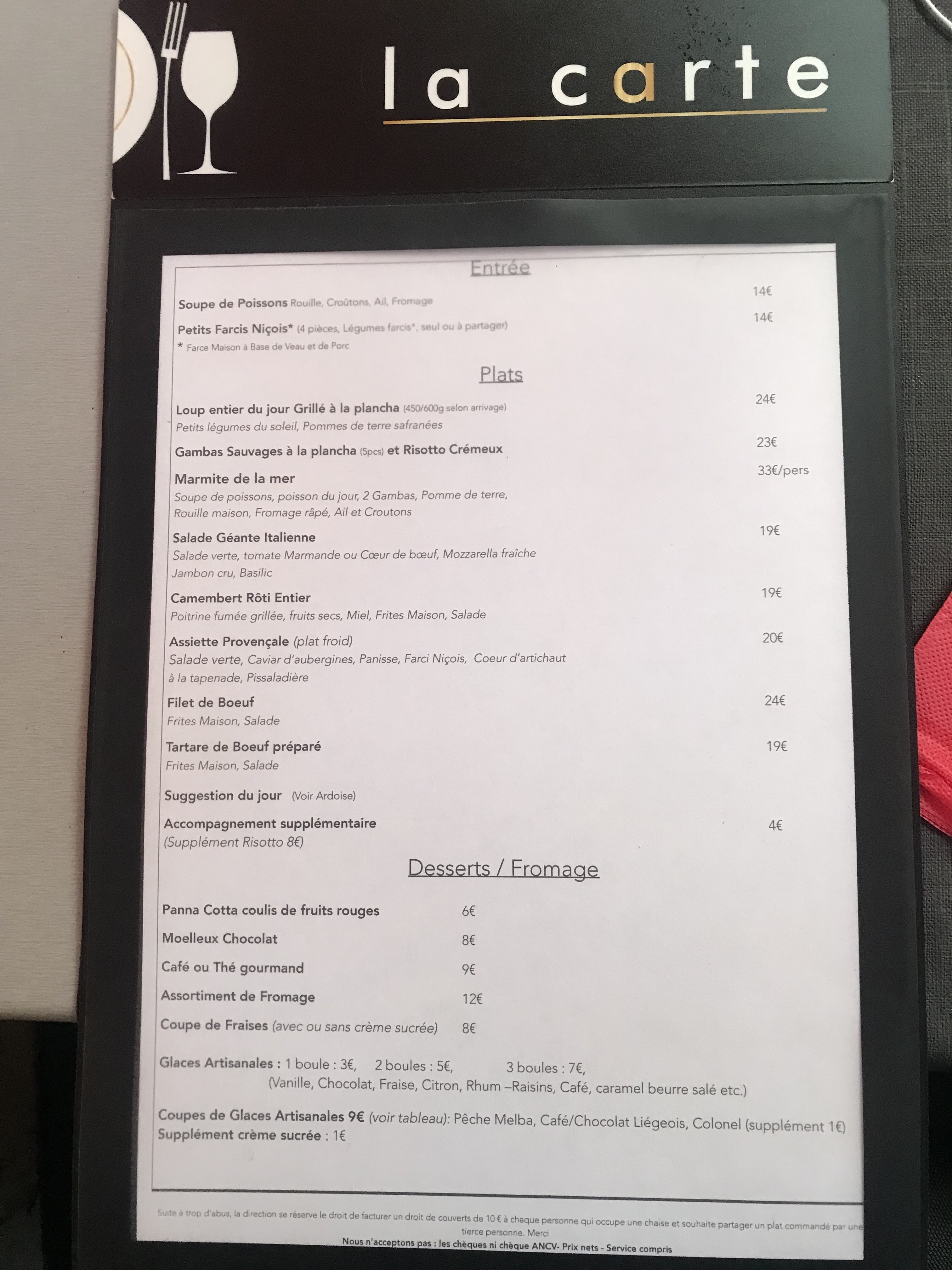 On y mange bien avec le menu gourmet à 29 euros grand choix l entrée salade chèvre chaud et les desserts Panna Cota tartes tropeziennes un régal service rapide entre la carte et arrivée des plats prêts à deguster