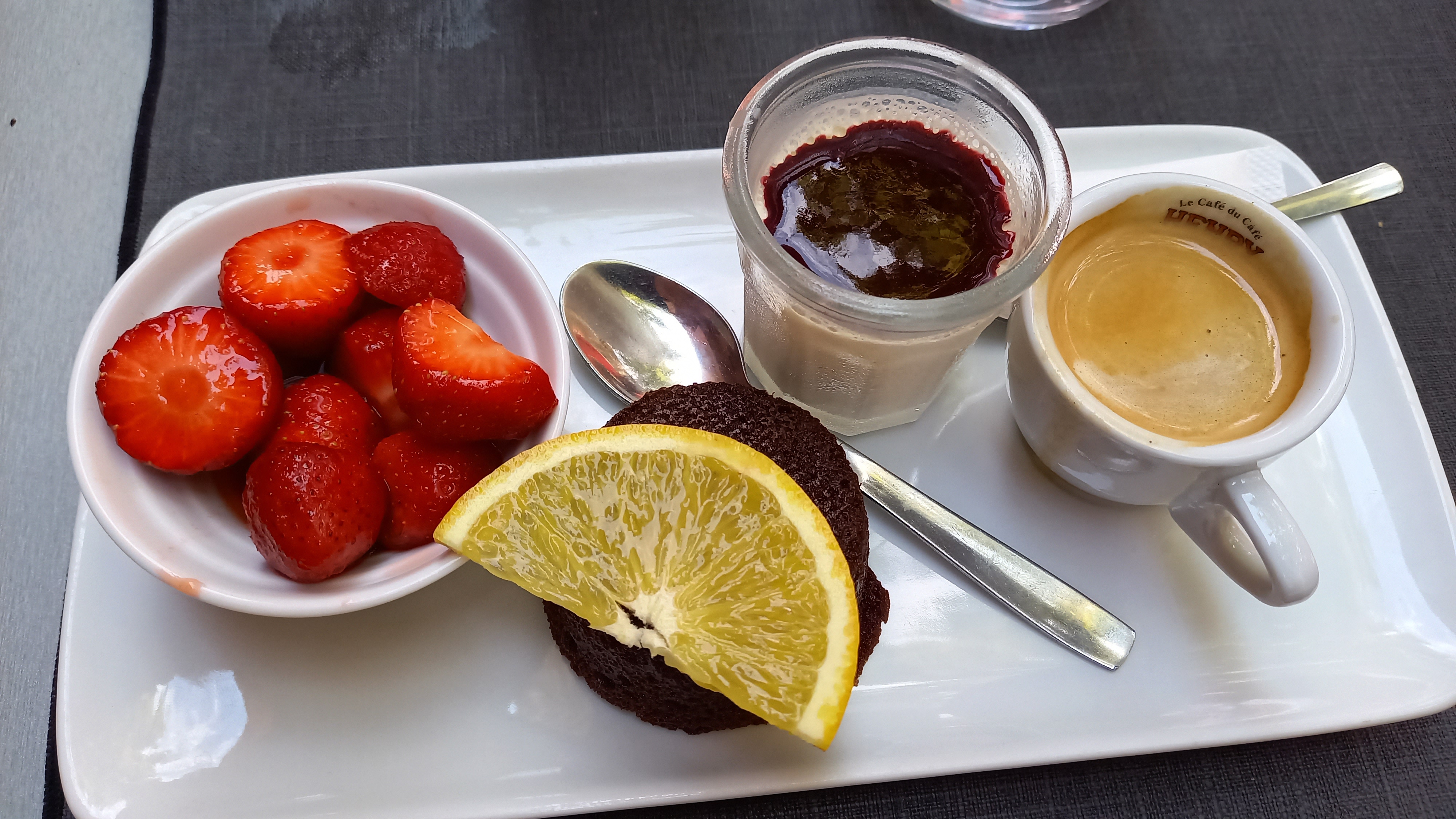 Assiette très jolie, composée de produits frais, complète avec son petit dessert et copieuse (je n'ai pas pu prendre un café gourmand derrière car plus faim) et la serveuse s'est mise en quatre pour nous être aimable. Bravo !