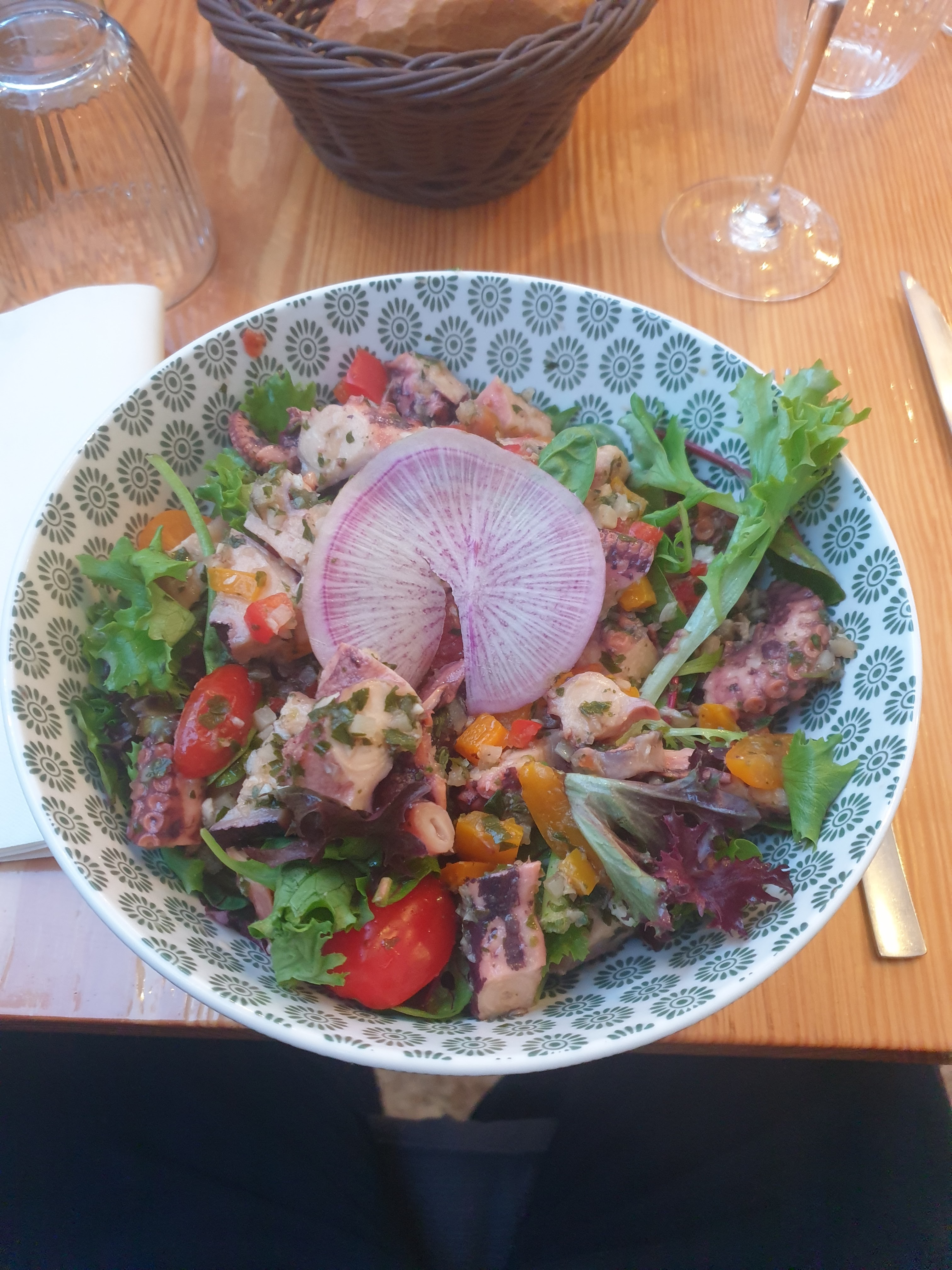 A priori ça semble très bien, personnel très accueillant, bel emplacement et carte alléchante ; commande rapide, c'est après que ça se gâte un peu. Pratiquement 1/2 h d'attente pour notre plat, par contre les verres de vin blanc qui devaient accompagner les dits plats ont été servis immédiatement, donc tiède quand nous avons été servis 🙄. La salade de poulpe excellente mais pas très copieuse, le ceviche de daurade manquait de saveurs (marinade express, pas où très peu d'assaisonnement) par contre poisson bien frais. La serveuse me dit qu'il est difficile de contenter ceux qui aiment épicé et les autres ; astuce : il suffit de rajouter un petit ramequin de sauce pimentée à côté. Vu le temps d'attente du premier plat, on a préféré prendre notre dessert ailleurs, dommage.