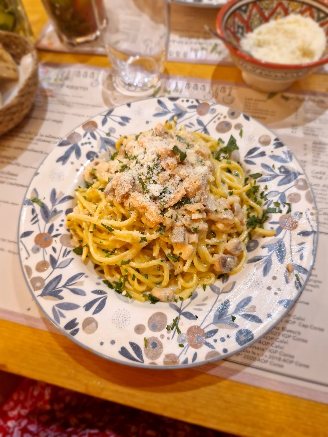 Excellentes pâtes au saumon frais! Le cadre est sympa. Les prix sont un peu élevés mais ça reste une bonne adresse. Vous pouvez retrouver d'autres adresses corses sur notre Mapstr: Gueyome :)