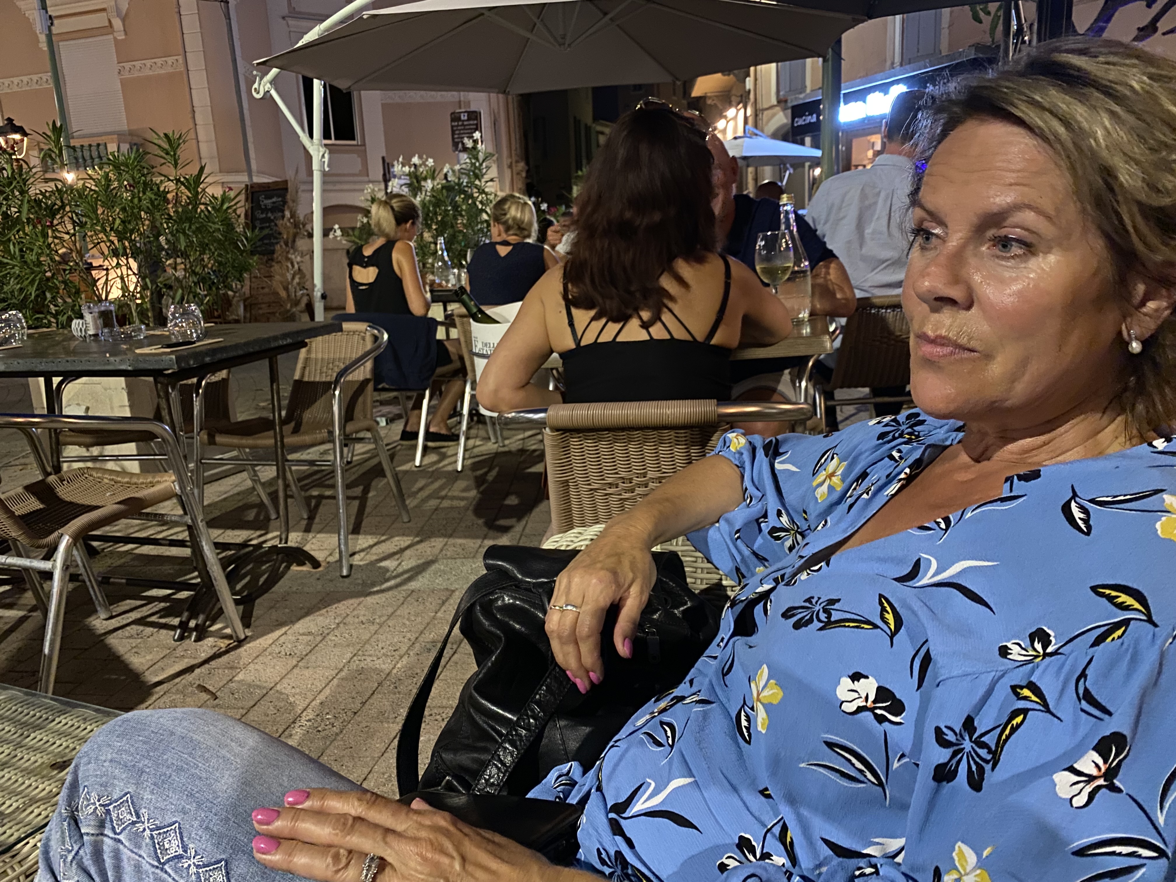 Dîner en soirée, endroit calme sur placette aménagée par des platanes et petites lumières d'ambiance dans les arbres, belle vue sur la baie de Cannes. Ambiance décontractée Personnel au Top. Repas avec produits de qualité