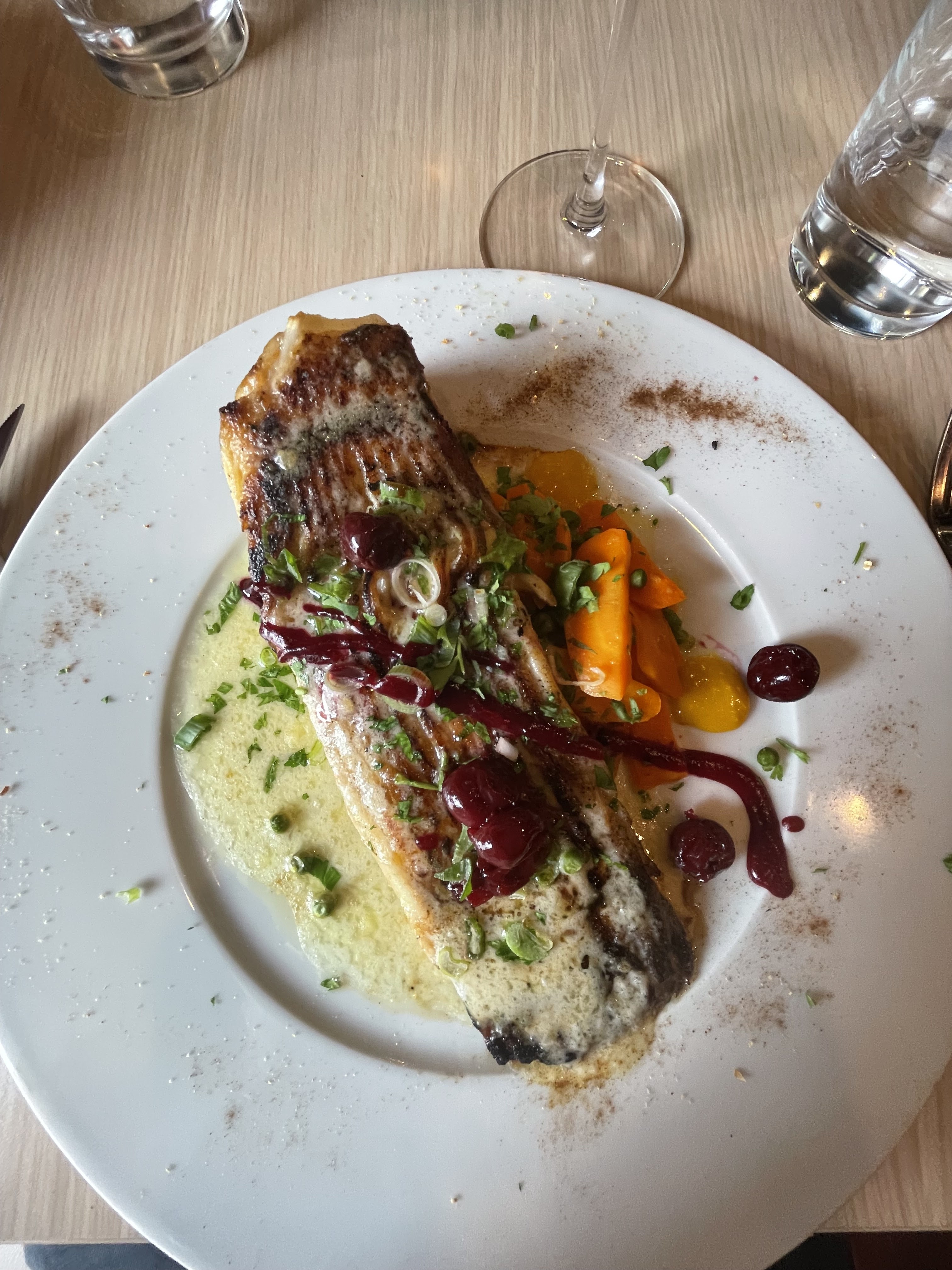 Comme les poissons sont délicieux ! Et accompagnés de vins somptueux, le tout dans un cadre arty plaisant. Note salée toutefois.