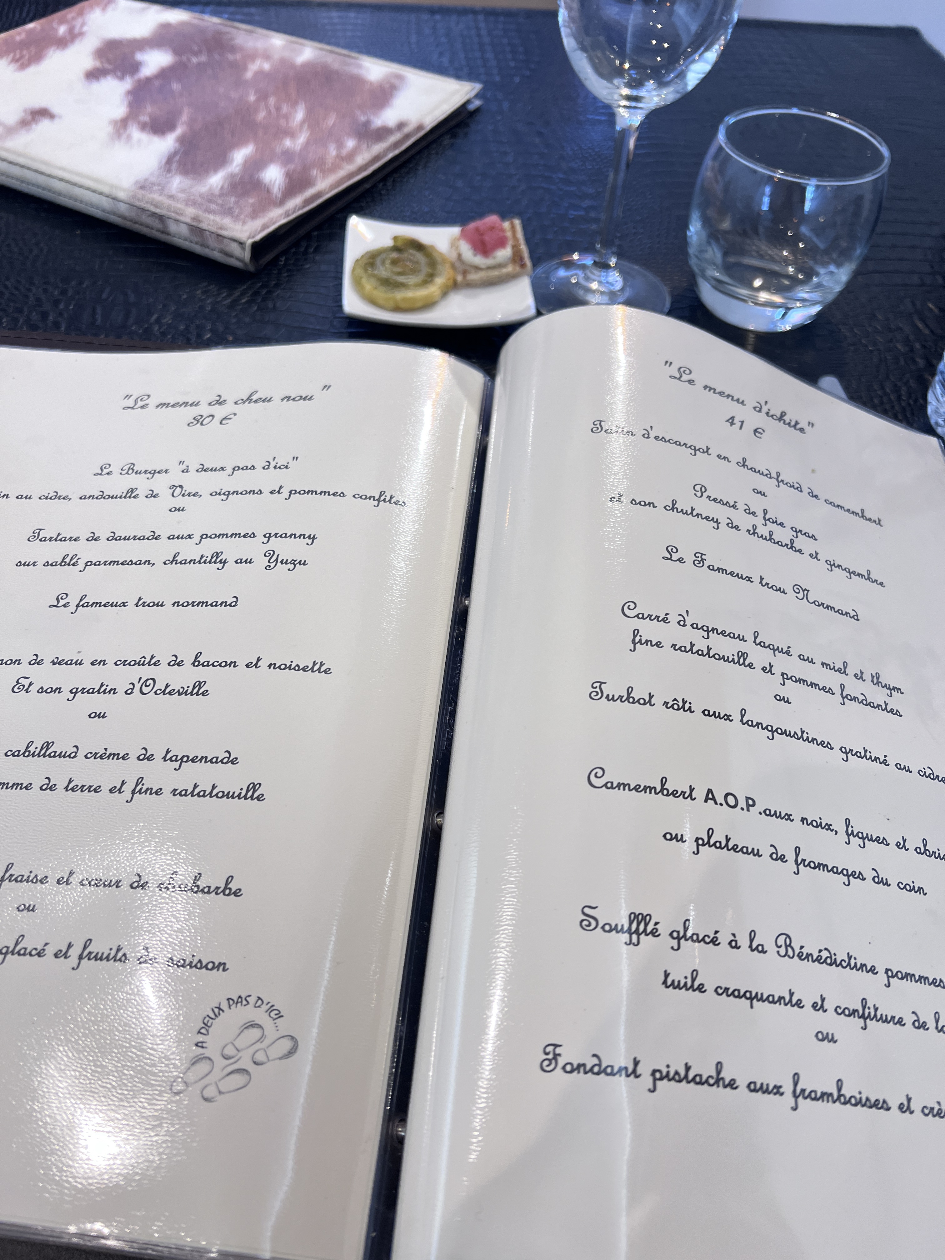 Un excellent repas pour chacun des six convives de notre table, lesquels se sont tous régalés. Le restaurant A deux pas d’ici existe depuis de nombreuses années à qualité égale. Voilà un lieu presque intemporel où l’on est toujours bien accueilli et servi généreusement. Tout , terre ou mer, est d’excellente qualité , fait maison et issu de productions locales comme par exemple les fromages ou la gelée de pommes servie dans le trou normand. Bravo aux patrons pour cette belle Maison et leur respect des clients sans esbroufe ni prix prohibitifs et avec un service simple et souriant .