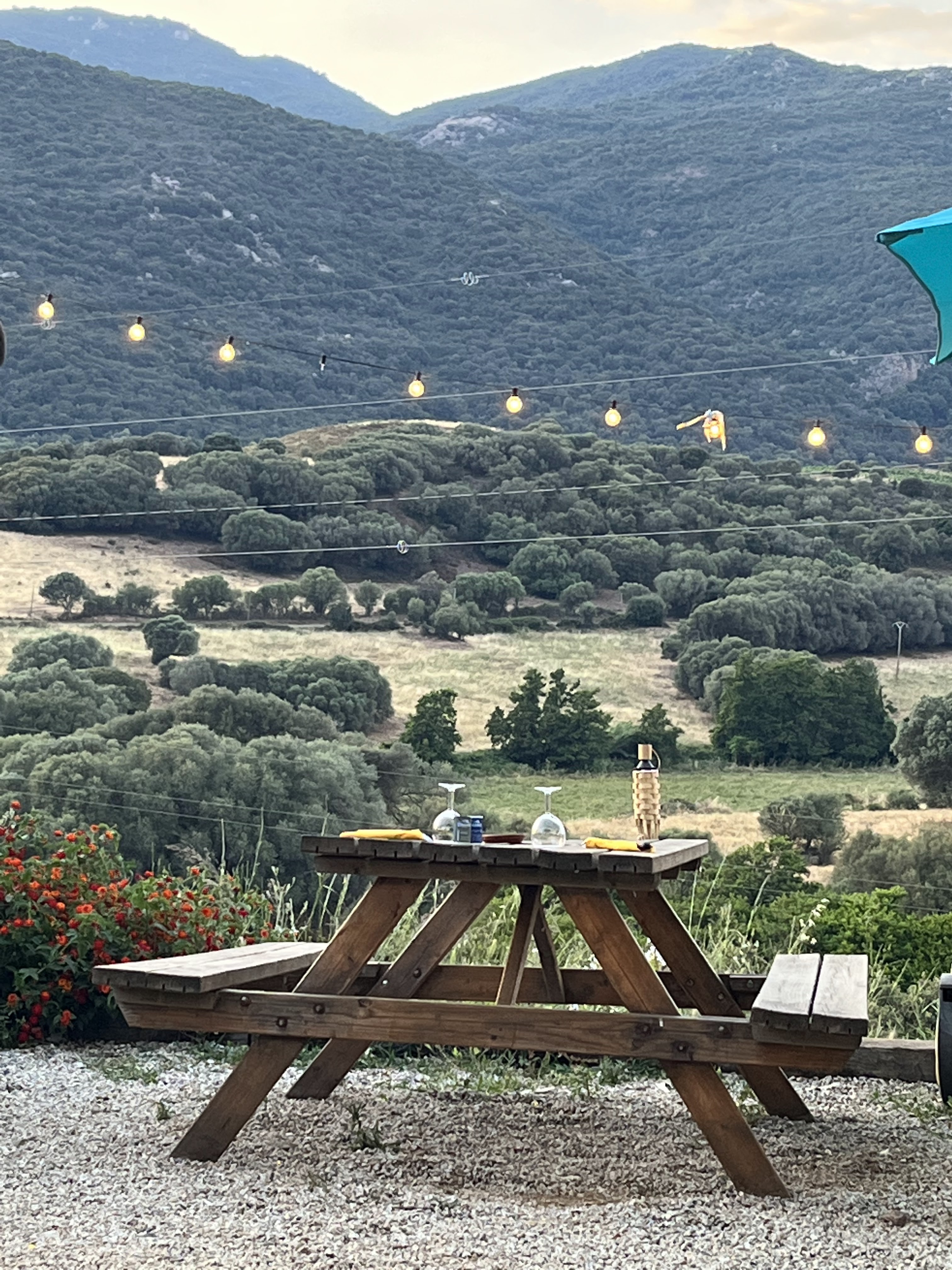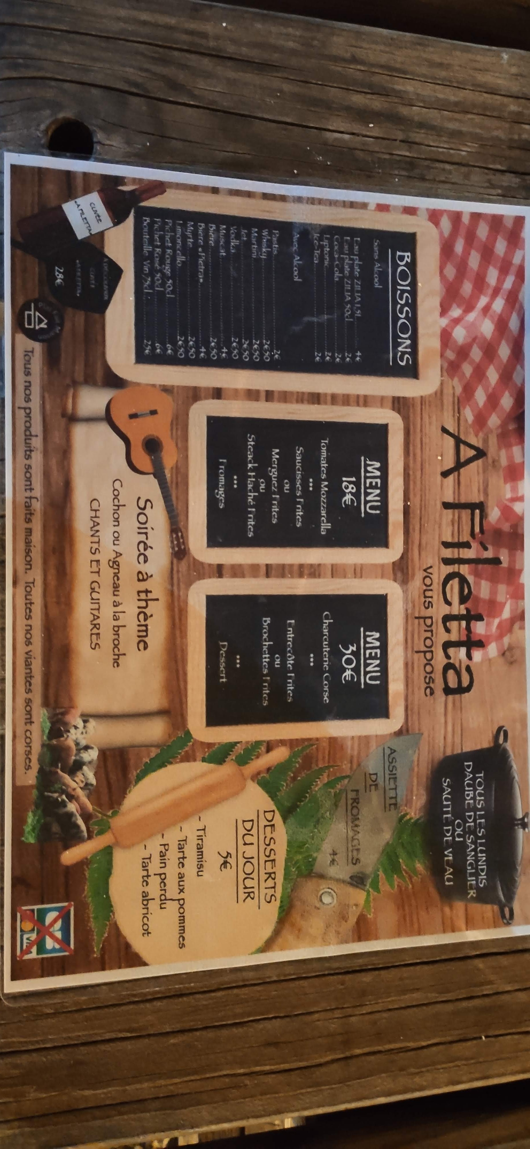 S'est rare que je mette un avis négatif mais là je suis obligé à la vue des autres. Accueil correct, on est installé sur des tables de pique nique en bois, s'est pas confort mais s'est sympa dans ce cadre champêtre avec cuisson barbecue extérieur. Deux menus aux choix, un à 18 € avec chipolatas/merguez ou steak aché en plat principal, et le deuxième à 30 € que l'on a pris avec entrecôte ou traverse de porc ou brochettes de bœuf. En entrée charcuterie correcte mais moins servi que sur les photos, les plats sont arrivés et 3 ont dû être repris car pas cuit, accompagné de frite mais pas de légumes. Côté boisson j'ai commandé un pichet de rosé de 75 cl, j'ai reçu plutôt 50 cl et reste en glaçon... s'est sur il est frais mais bien coupé à l'eau. Et pour finir, les desserts pas de tiramisu comme sur la carte mais des tartes ou pains perdus (pas sur que ce soit une spécialité corse)... en plus le pain perdu est une tranche de brioche Harris !!! avec un sirop caramel industriel. Heureusement que sur la carte il est marqué que tout les produits sont faits maison ? Bref extrêmement déçu et un budget conséquent de 180 € pour une famille de 5.