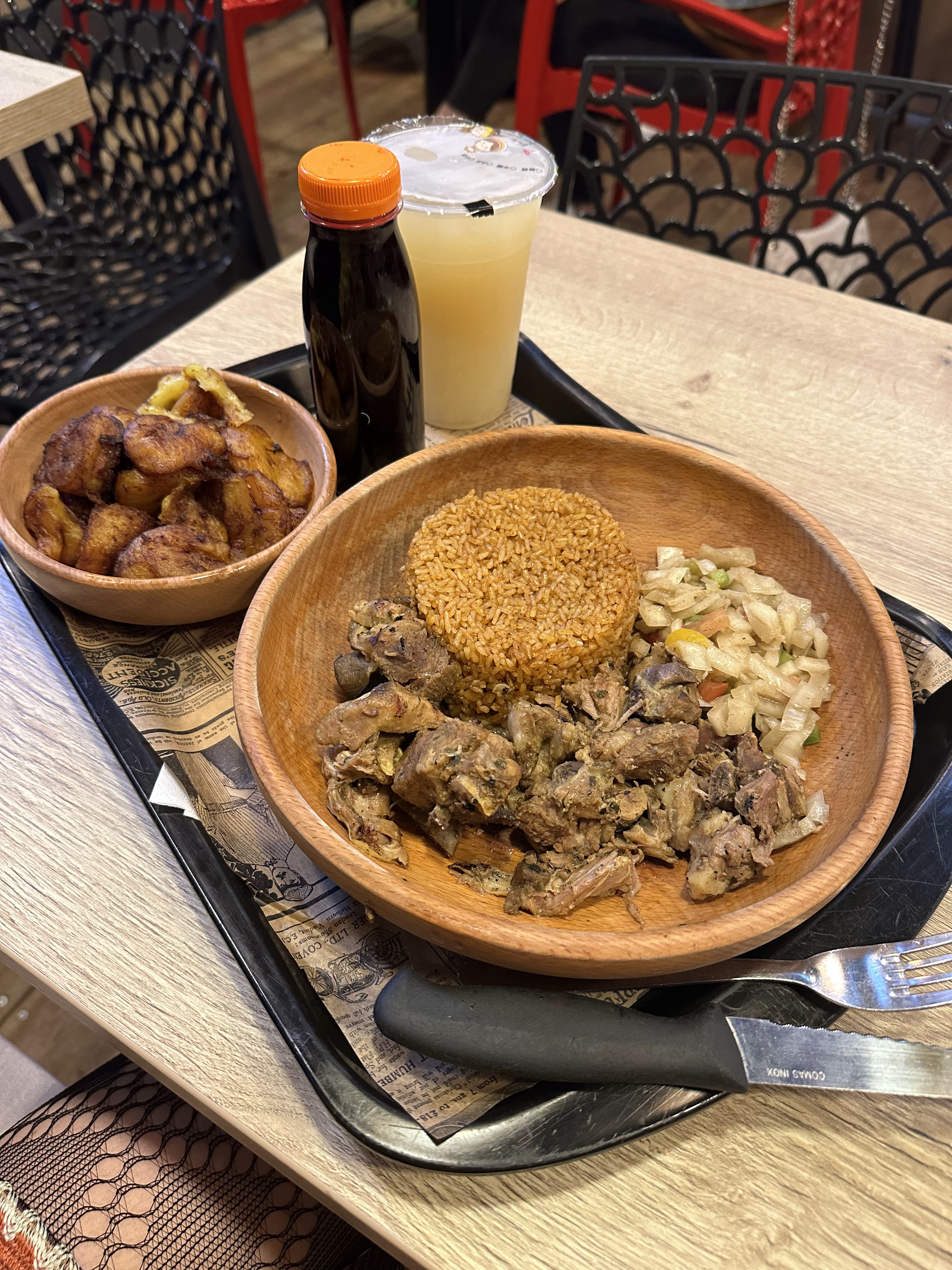 J’ai commandé un dibi poulet charboneu, les alocos n’étaient pas assez mûre (dure) quant au bissap Mon Dieu le sucre trop d’arôme vanille! , il n’y avait même pas de menthe. Je suis déçu et je préfère Afrik n fusion largement. Sinon mon ami a pris un foutou, la viande n’était pas nettoyé et le foutou était très très foncé, j’aurais du prendre des Photos. Sinon le service était rapide et la déco du restaurant est super et propre.