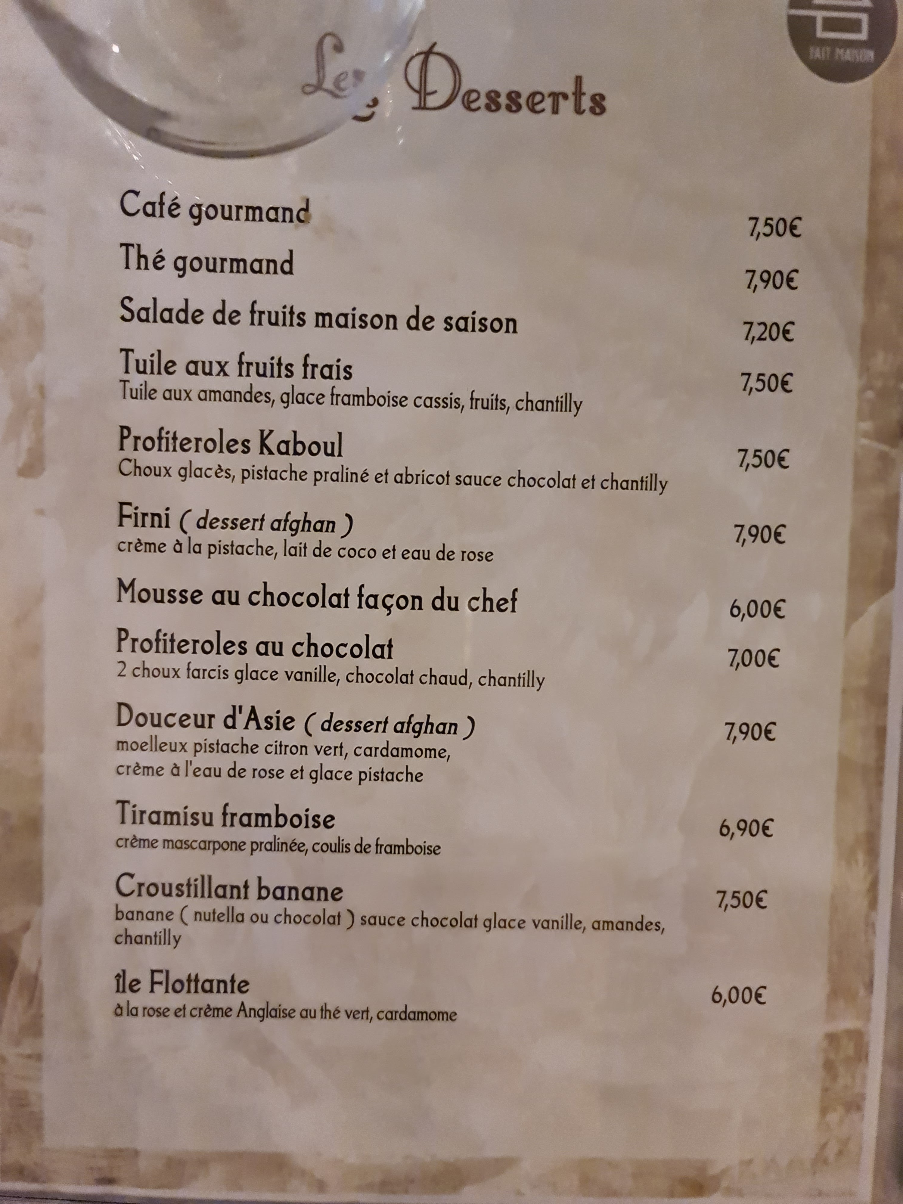 C'est une très bonne adresse : les plats sont vraiment très bons, copieux et parfaitement épicés. Les desserts afghans sont délicieux. L'accueil est très chaleureux. Le samedi soir, vu l'affluence le service est un peu long mais c'est un détail. Nous nous rendons toujours avec un très grand plaisir dans ce restaurant.
