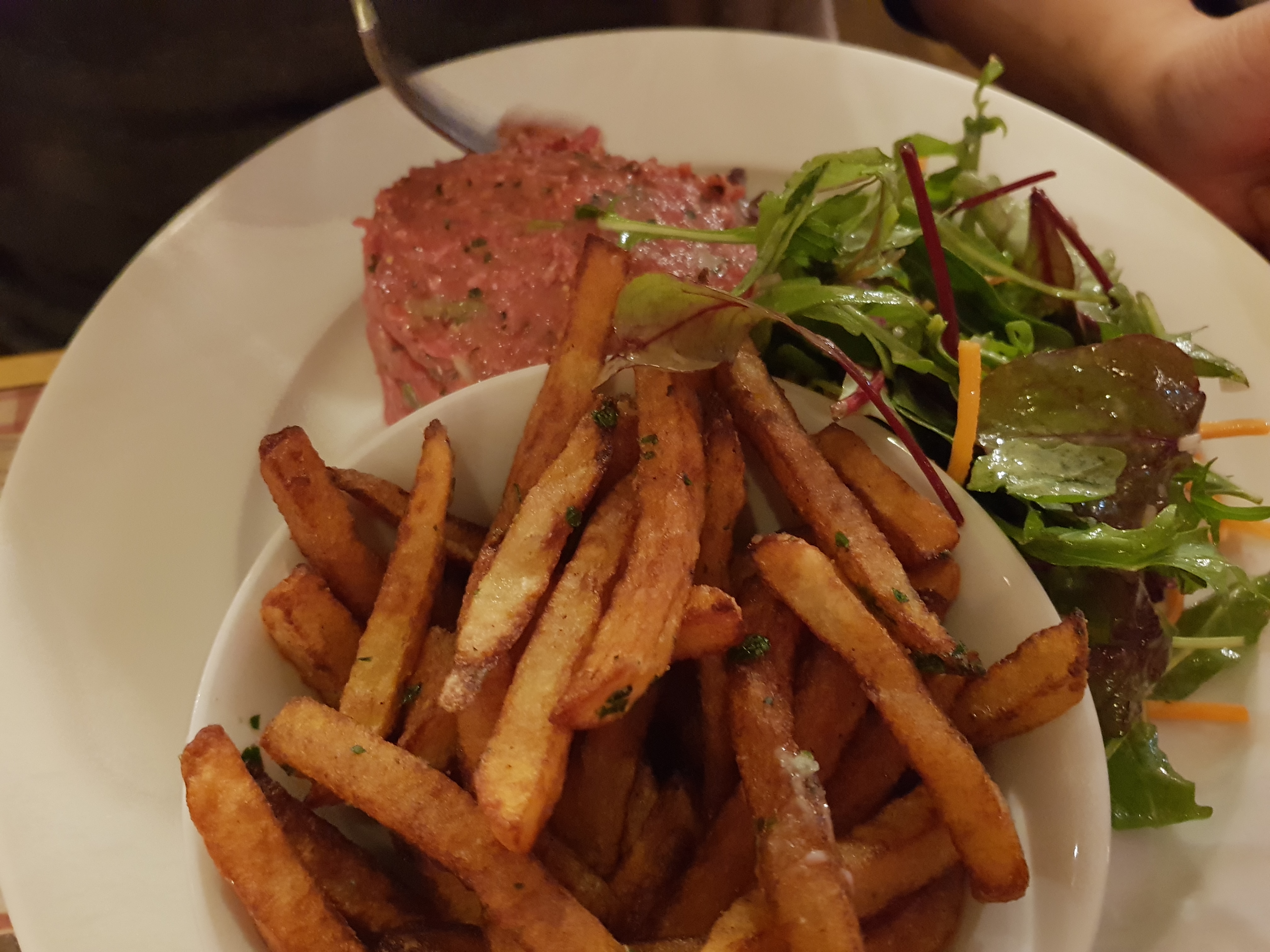 Endroit très charmant. La nourriture était très bonne et rapide. Ravi d'avoir un délicieux steak tartare et des frites après un long vol.