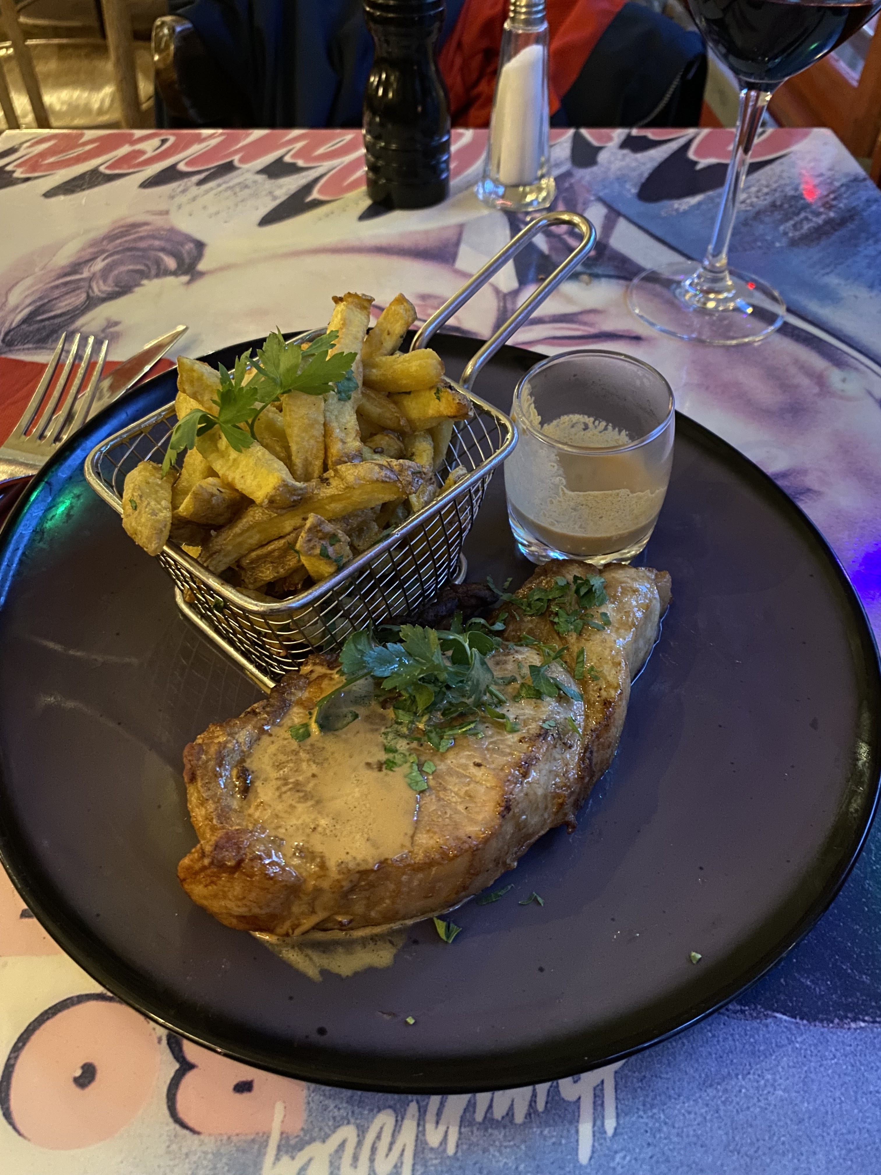 Déco assez sympa, service pas mal, même si on ressent un peu de tension entre la patronne et le cuistot. Par contre, la côte de cochon pas terrible, trop sèche, sauce inintéressante. L’accompagnement, un genre de gratin dauphinois datait au moins de l’avant veille. En résumé, pas bon