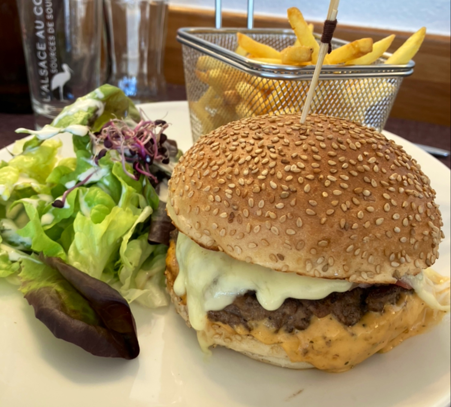 Je vous recommande chaudement ce beau restaurant, avec un service de qualité et un personnel toujours souriant ! Les repas sont excellents, vous pouvez me faire confiance ! J'ai mangé quelques fois ici, et c'est une adresse à recommander à vos amis et vos familles pour des repas conviviaux sans vous ruiner ☺️ (Sur la photo, j'ai déjà mangé la salade qui accompagne le burger ainsi que la moitié des frites.... Ne croyez pas que c'est servi ainsi 😂)