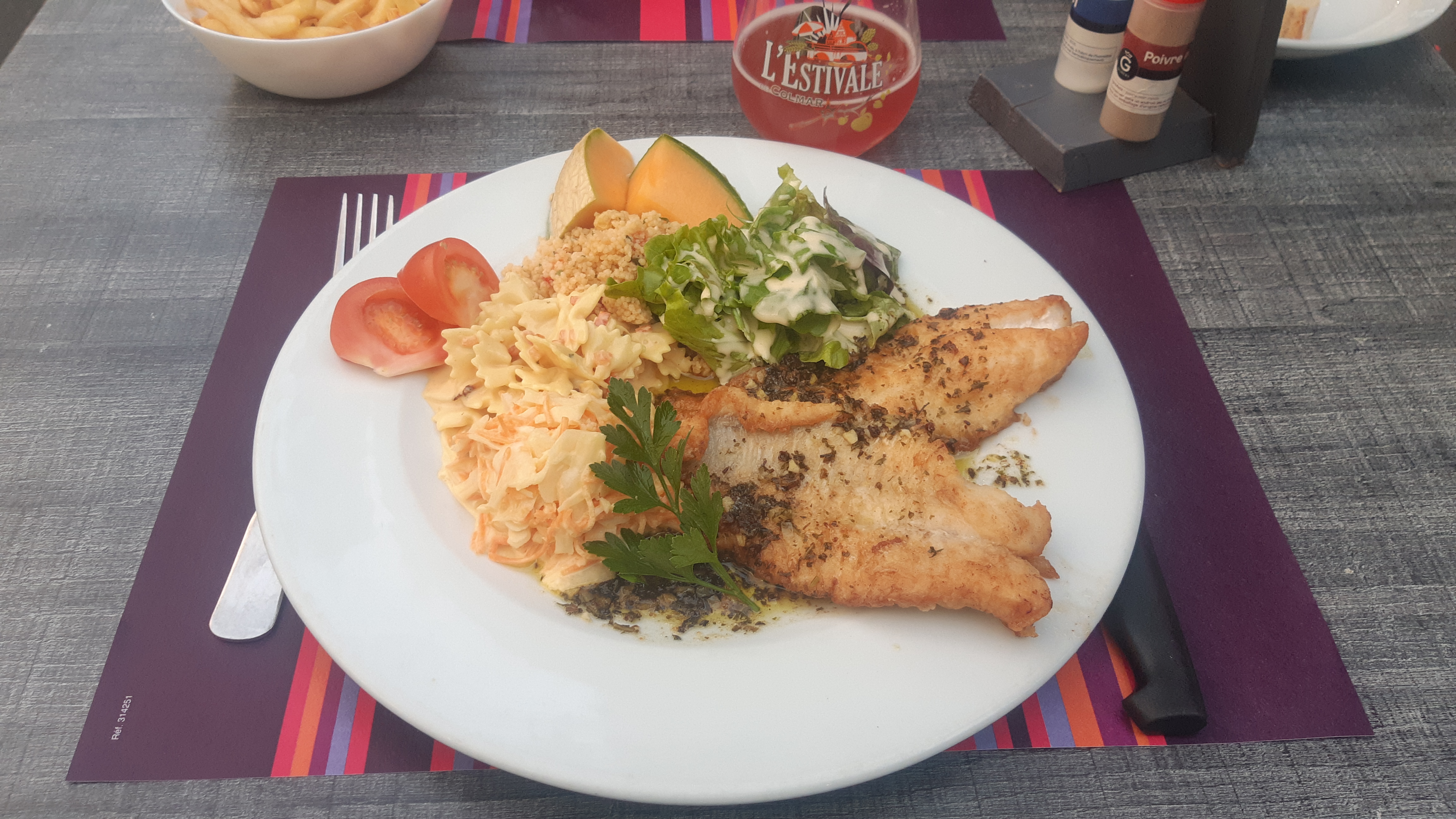 Notre 1ère fois chez vous ce soir ! Nous avons passé un agréable moment sur une terrasse belle et agréable à la table 4. Nous avons été servie par une serveuse très gentille et joviale ! Merci à elle si elle lit les avis et se reconnait. 😉👍 J'ai pris un filet de Dorade persillé avec ses crudités. C'était vraiment très bon et le dressage de l'assiette était très jolie. Par contre vu que c'est servi avec des frites, je pense que les portions de salade de pattes et de taboulé alourdissent l'ensemble du plat car cela fait beaucoup de féculents différents. Peut-être les échanger par des petits haricots verts, du maïs et de la betterave en dès. Cela ajoutera de la légèreté et des couleurs dans l'assiette. En dessert j'avais une coupe Américaine qui était très bonne. Nous reviendrons ! 😉👍