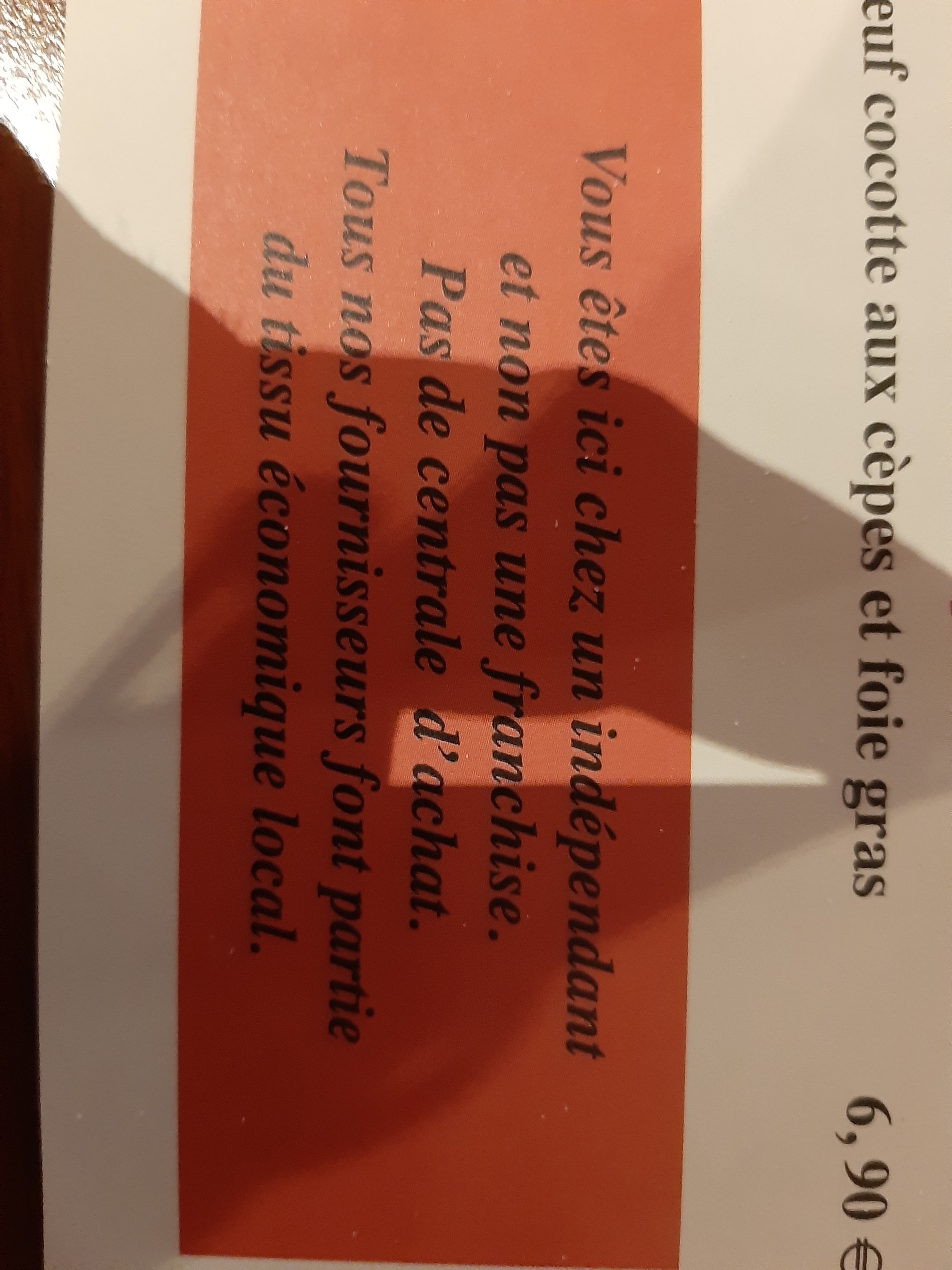 On demande la cuisson d'une côte de veau bio à point, on nous l'amène à peine cuite. On appel de serveur, gentil pas de soucis, mais il nous ramène nos côtes archi cuites, très certainement passées au micro-ondes, la viande était filandreuse, très difficile à couper. Nous en avons fait part à la gérante au moment de payer, elle nous a certifié mordicus qu'elles avaient été recuites à la plancha, j'ai dit impossible, il y avait une pellicule d'eau à la surface de la viande. Bref tout ça pour dire qu'on a voulu se faire plaisir avec une bonne viande et que c'est raté 😱 Merci pour votre proposition mais je rajoute également que lorsqu'on annonce sauce crème et champignons on ne s'attend pas à avoir ce qui nous a été servi c'est à dire un tout petit peu de sauce dans un coin de l'assiette où nous avons cherché la crème et les champignons.