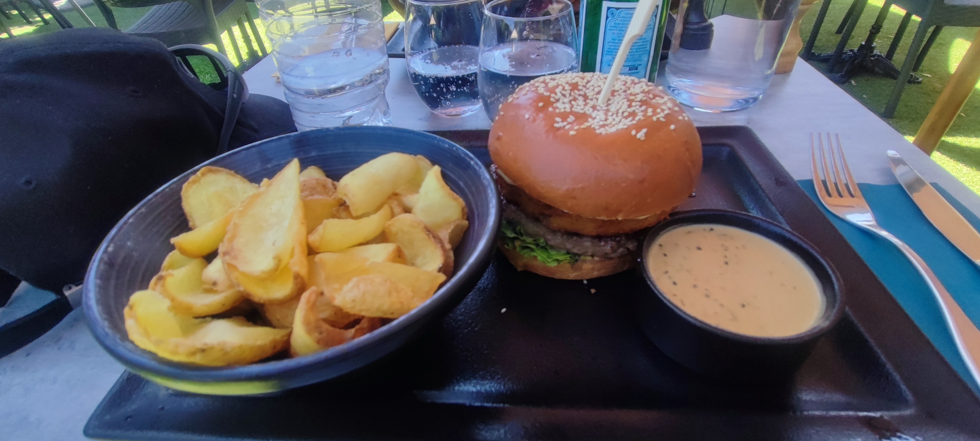 Alors là je suis très agréablement surpris par ce steakhouse Burger. les assiettes sont super bien garnies. rare que je ne finisse pas mon assiette... c'est presque arrivé Cela pour dire que les prix sont sensiblement élevés, mais bien contrés par des plats des très grande qualité (légumes locaux) et bonne quantité Très peu d'attente Terrasse agréable (certaines periodes bruyantes par la route avoisinante) Bravo PS : Pour supprimer les sons moteur, tout simplement monter un muret beton à auteur des moteurs (1m50 suffisent) PS' : Dommage pour l'odeur de cigarette en terrasse, c'est terrible mais on ne pas y faire grand chose