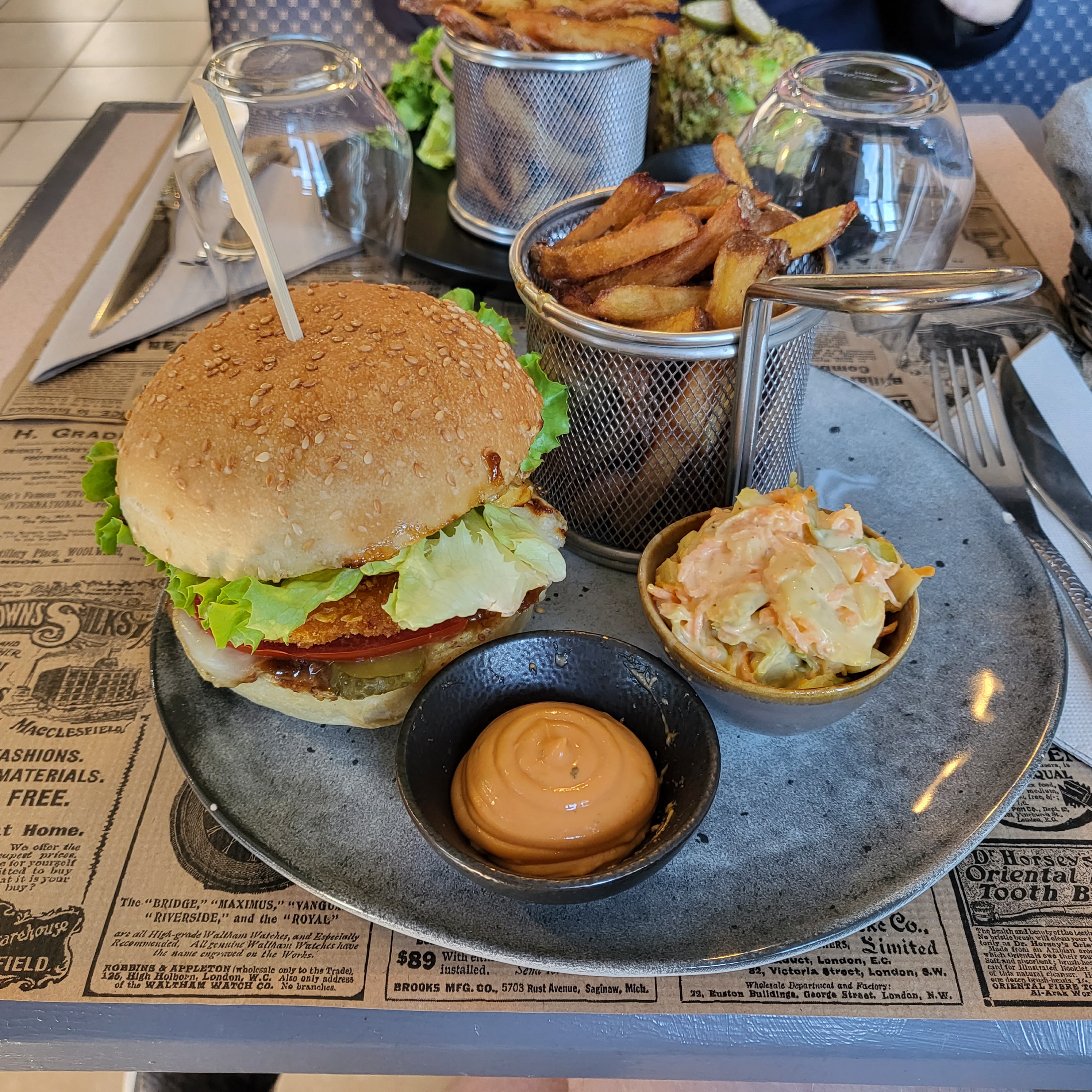 Restaurant face à une charmante église. Accueil topissime. Menu créatif. Tout est fait maison. Poisson façon fish and chips, croustillant parfait Sauce béarnaise maison Burger : saveurs équilibrée, viande parfaite, n oublions pas la sauce divine, les frites ... ah les frites ! Un régal Et le pain du burger fait maison, brioché, legérement croustillant à l extérieur et moelleux a l intérieur... Glace artisanale et mousse au chocolat maison sublime ! Vous l aurez compris c est un restaurant à recommander.