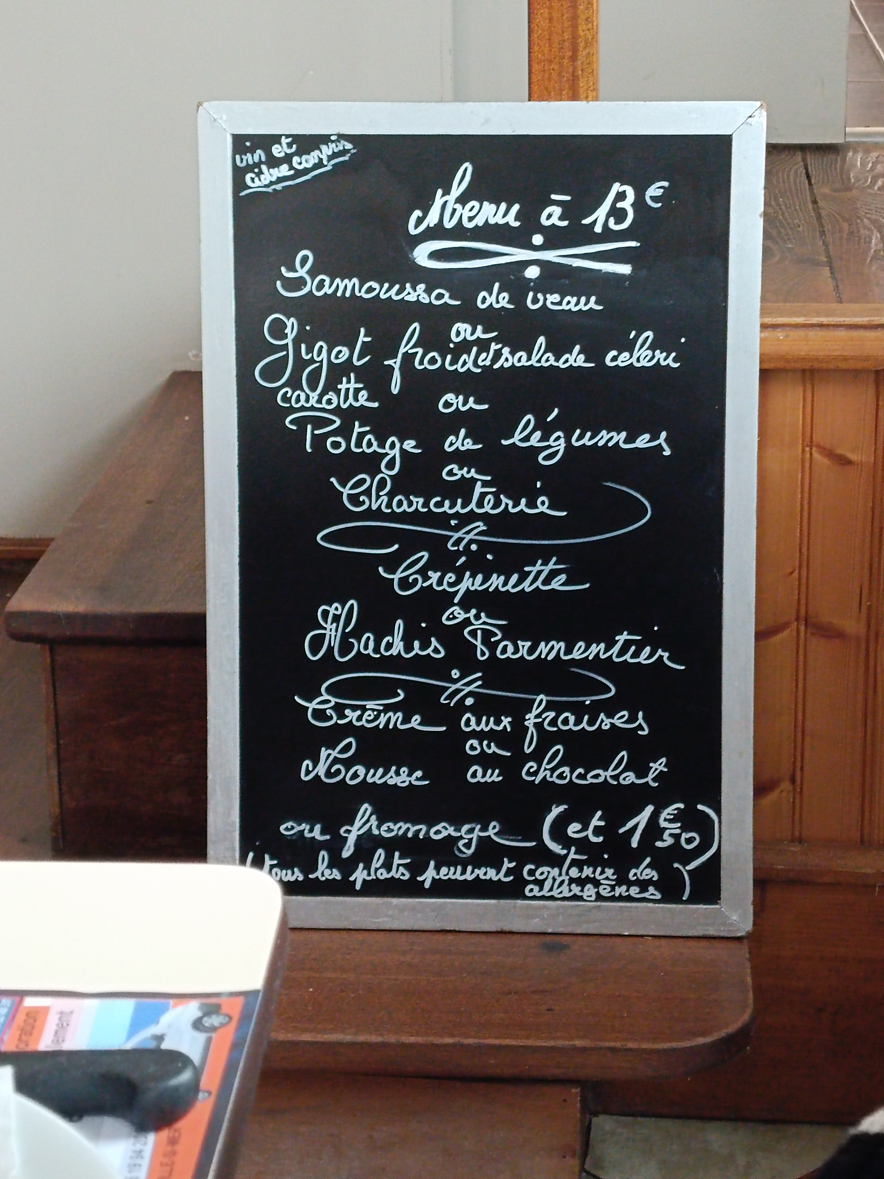 Très bon rapport qualité/prix, 13€ le plat du jour avec l'entrée, le plat, le dessert et 1L de cidre et de vin inclus La cuisine est simple mais bonne