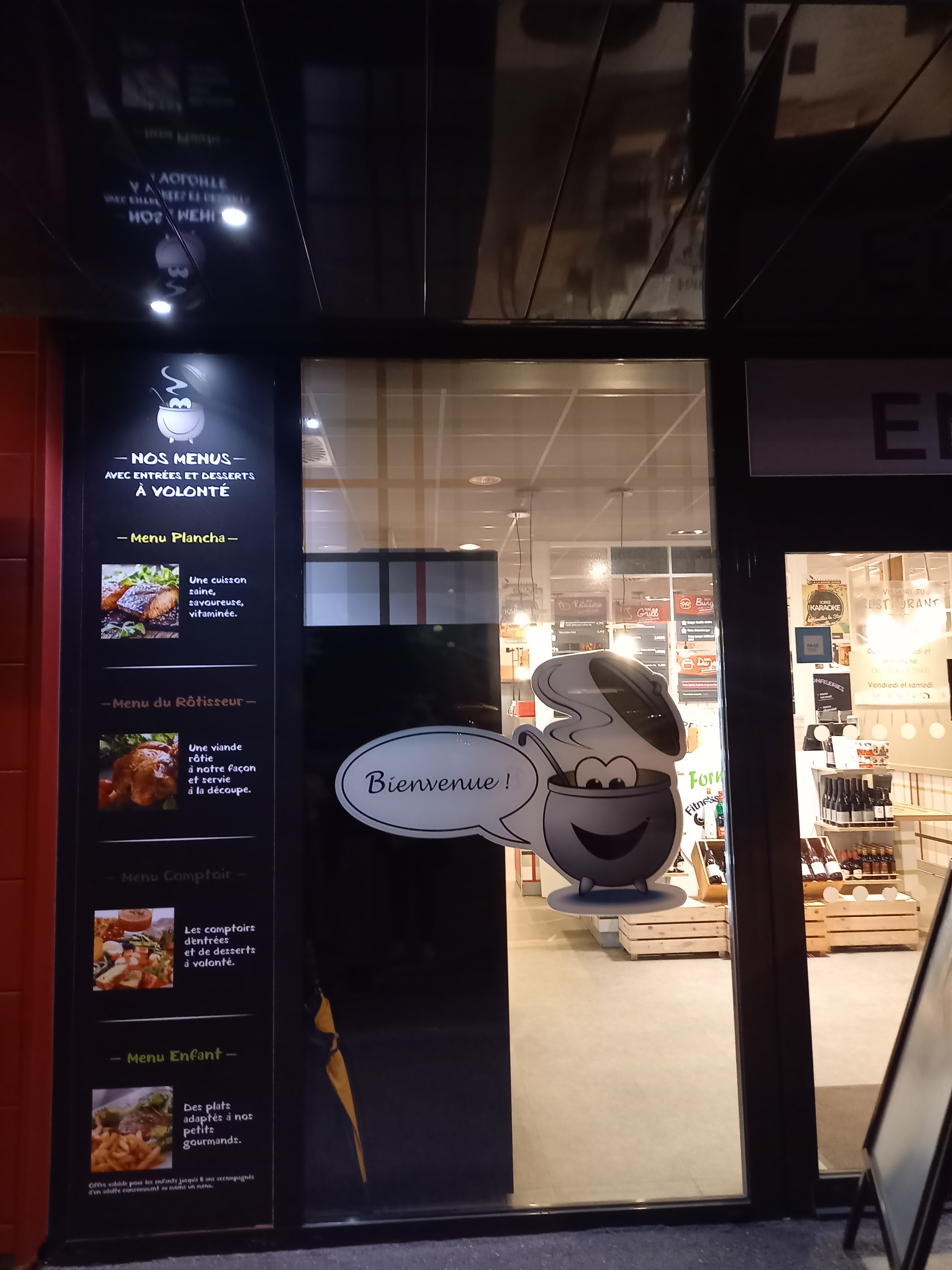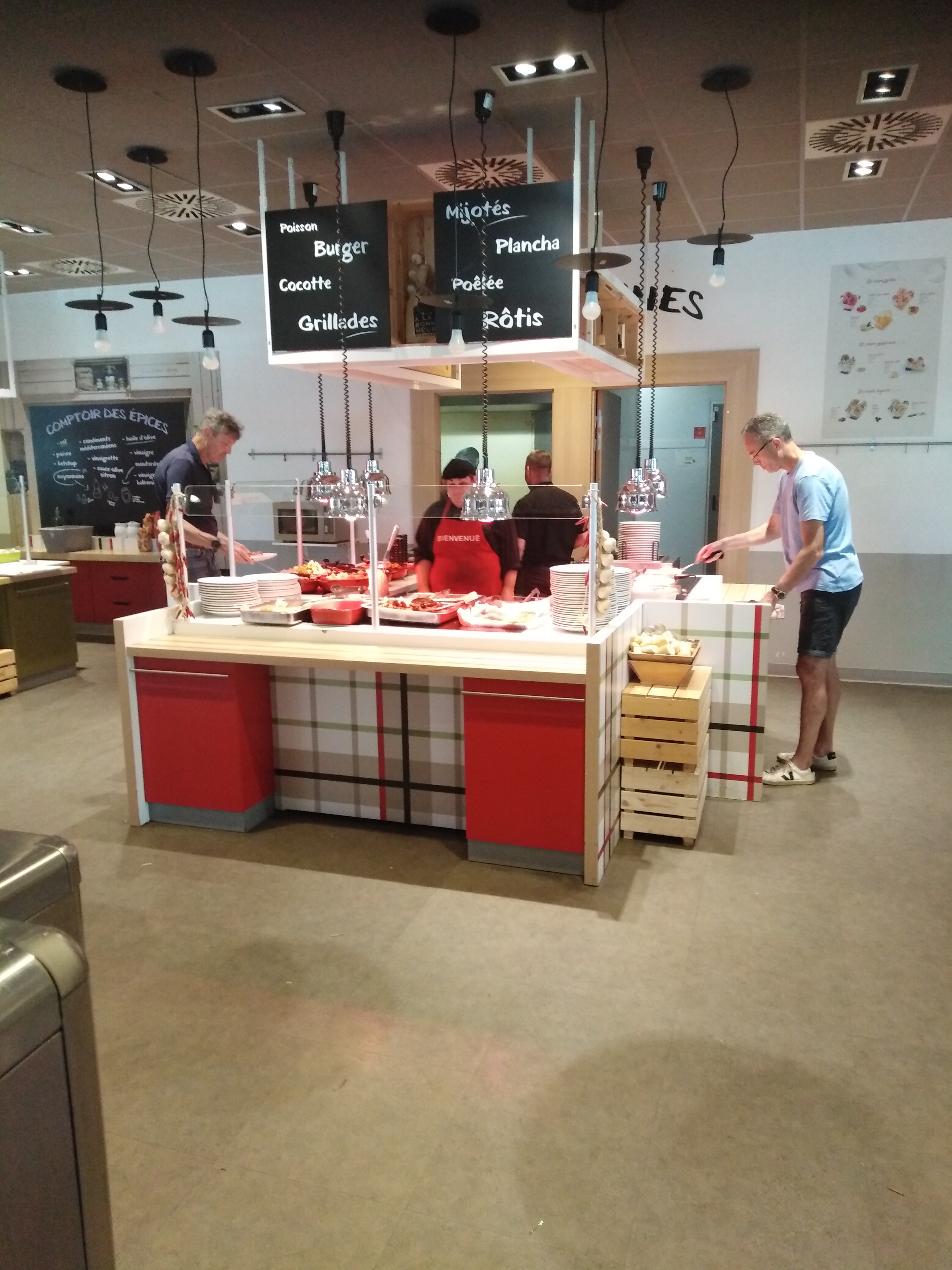 Bonjour À la bonne heure et le successeur de la cafétéria Géant Casino un grand bol d'air pour cette enseigne. Je viens dans cette établissements régulièrement les midi pour mon travail. Les plats sont variés et il y a plusieurs choix de menus. Il y a le menu entrée + dessert à volonté à moins de 10 € Et ensuite plusieurs menu avec plat au choix, entrée plat et dessert plus café si vous le souhaitez. Attention cependant au gourmand comme moi les desserts sont à volonté.