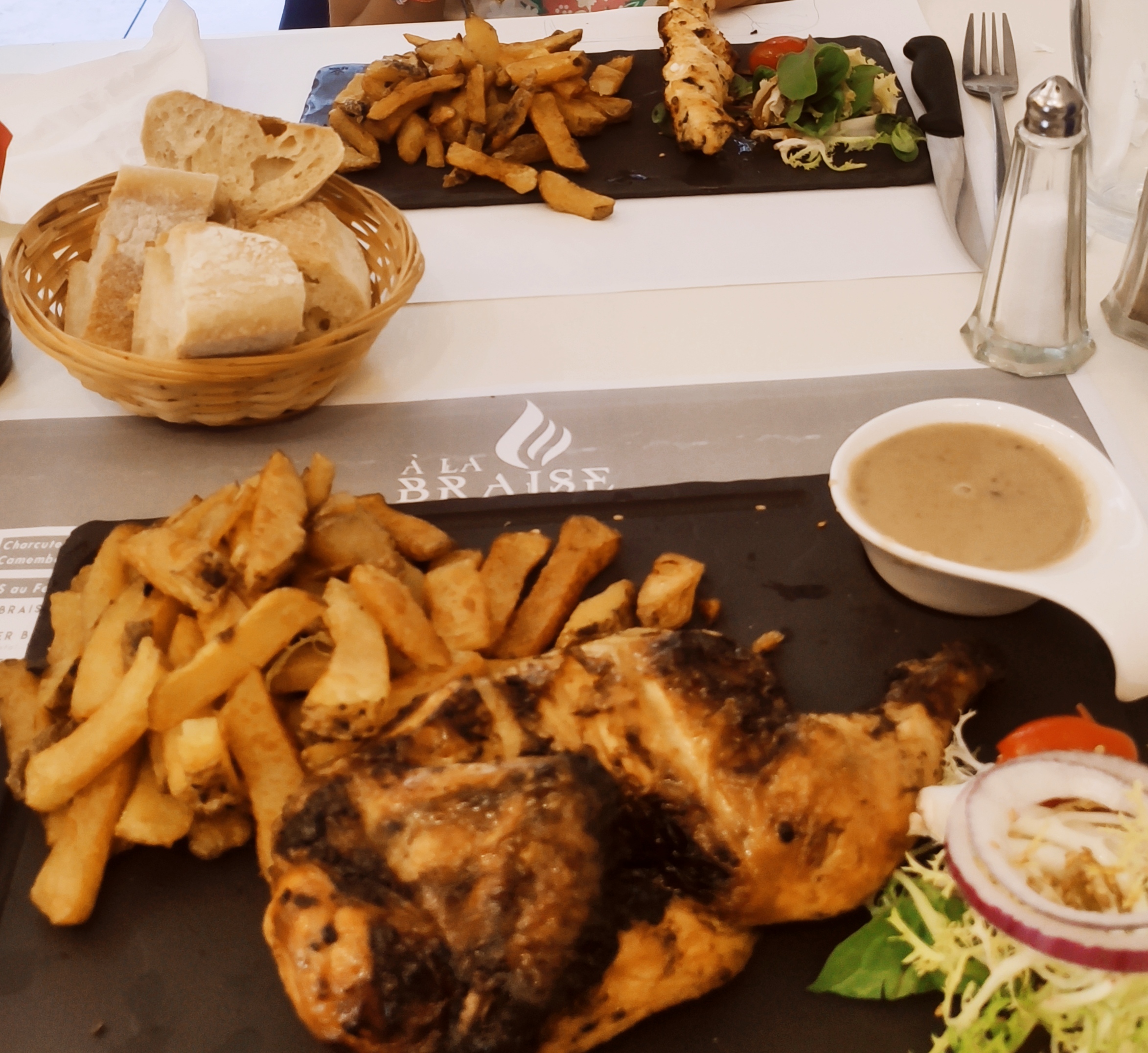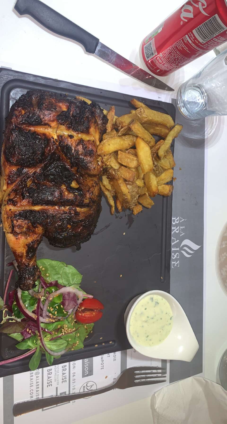 Déçue du poulet braisé pour moi c'est pas un demi poulet il était trop cuit et sec, la serveuse m'avait prévenue que c'était sec et qu'il fallait acheter une sauce exprès en supplément j'aurai du partir à ce moment, pas mal d'attente à la commande et pour l'addition. les frites sont maison mais quantités minces j'ai eu que des bouts de frites cramés... 18 euros pour ce plat avec accompagnement sup, c'est limite de vol ! (Voir photo) Non accessible aux personnes à mobilité réduite et poussettes / WC à l'étage sales. Service pas top ni professionnel Je ne reviendrai pas il y en a des bien meilleurs sur Montpellier !