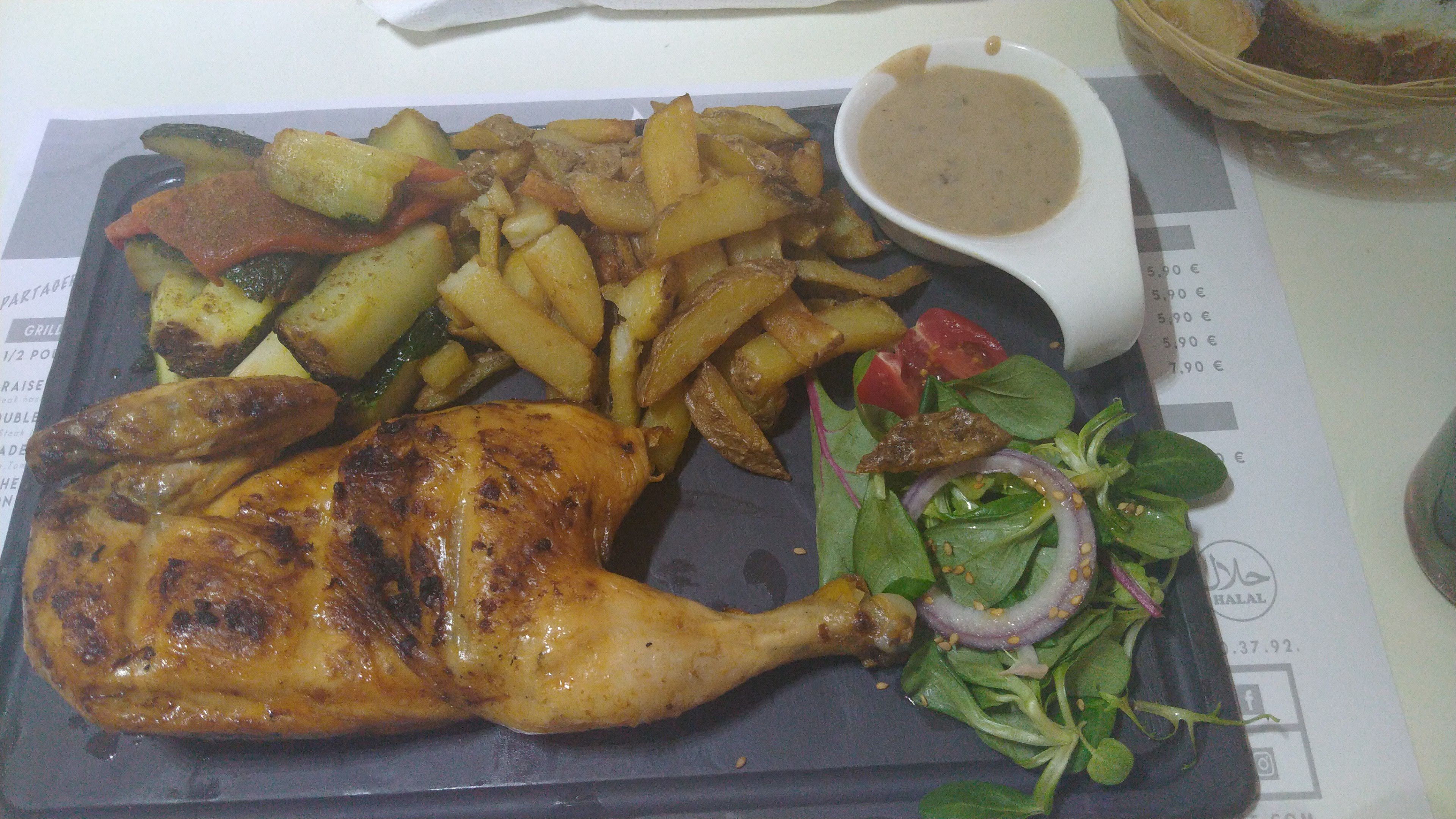 De passage à Montpellier, après un tour sur Facebouffe halal Montpellier notre choix s'est porté vers ce restaurant. Personnel sympathique. Poulet braisé également avec mention pour les frites maisons. Excellentes! Le plateau de charcuteries pour 12e est un peu light mais passable pour une mise en bouche. L'on voulait prendre un thé à la menthe mais l'on a dû écourter car une bagarre a éclaté dans la rue perpendiculaire, se continuant à côté de nous. En bris de glace. Dommage pour ce désagrément mais nous ne retourneront pas dans cette rue lors de notre prochain passage.